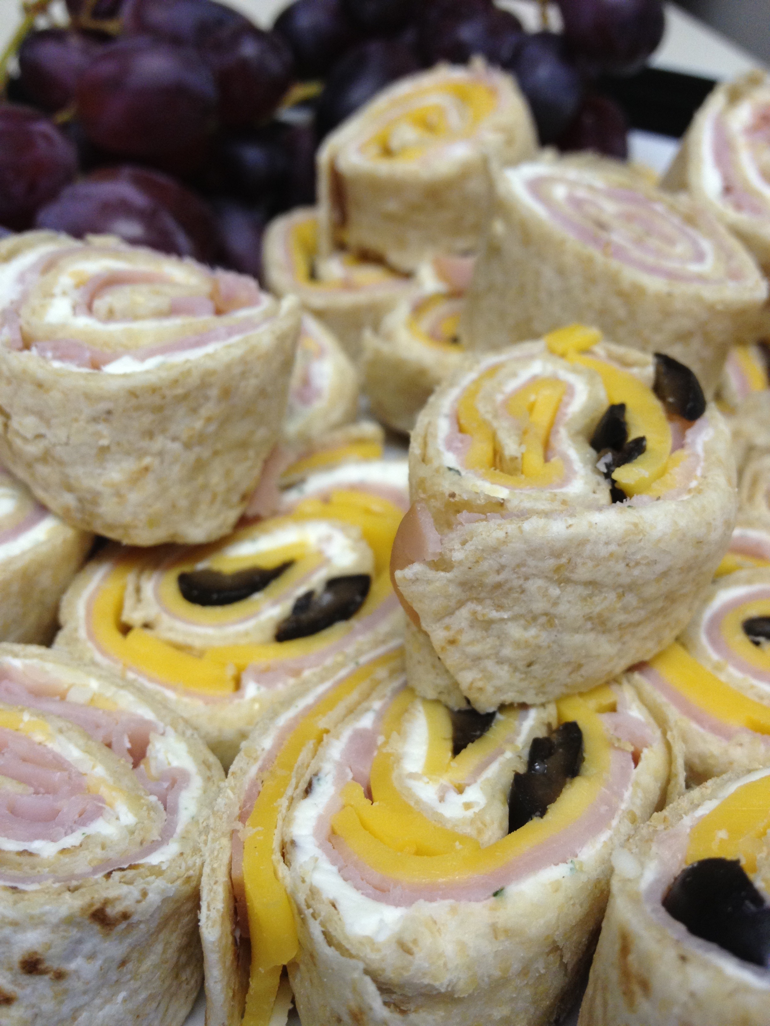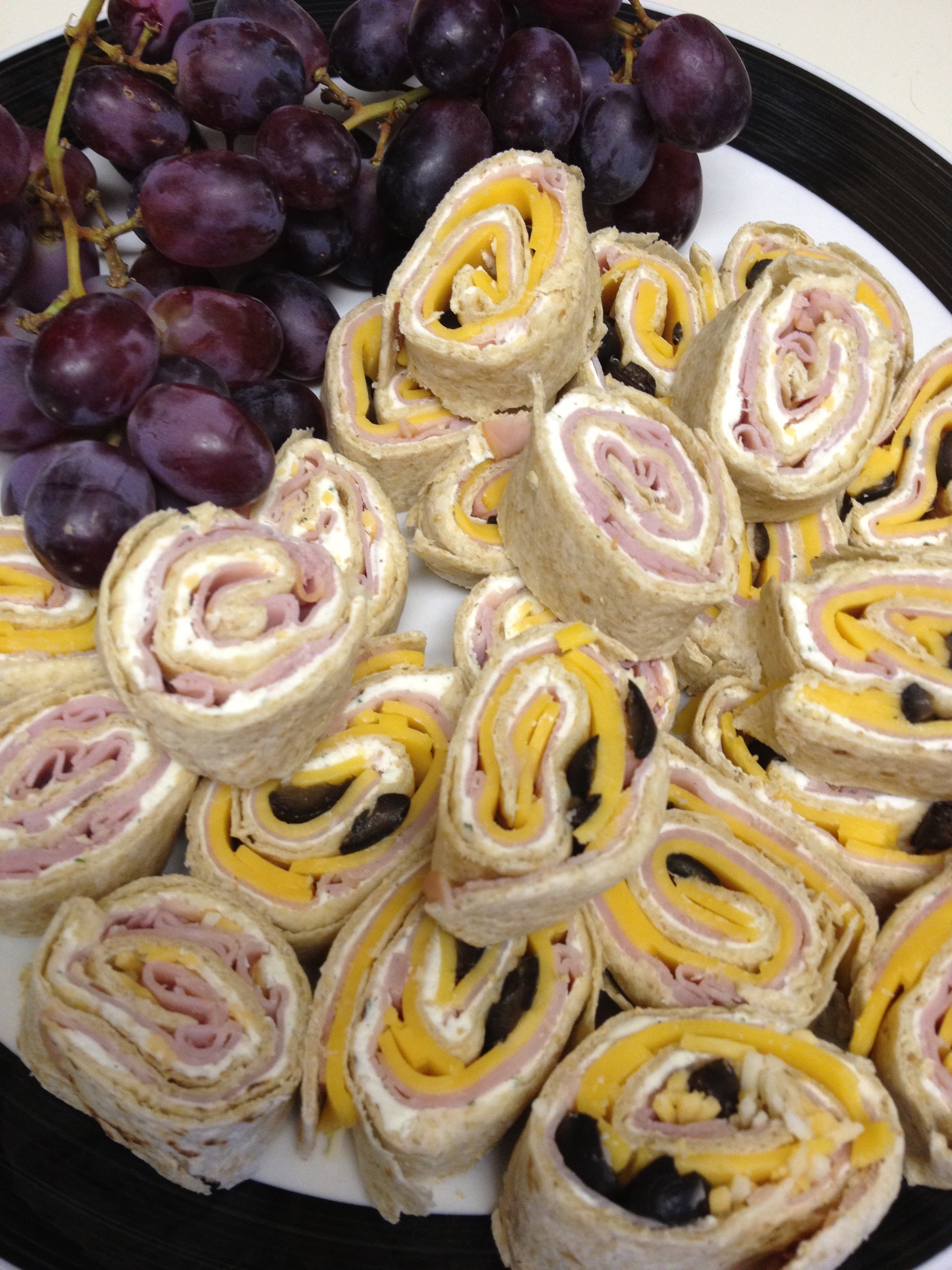 Mix together cream cheese and salad dressing mix. Spread a thin layer on each tortilla with a knife. Top each tortilla with a few black olives and two slices of ham. Add two slices of cheese. Roll tightly (see picture above) and chill for at least 2 hours. When ready to serve, cut each roll-up into thin, bite-sized slices. Garnish with fruit or serve with salsa or Dijon mustard for dipping.