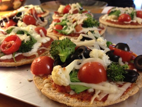 Preheat oven to 350 degrees. On an ungreased cookie sheet, place bread halves face up. Brush each lightly with olive oil. Top each first with 1-2 tablespoons of pizza sauce, followed by about 1 tablespoon of cottage cheese (if desired). Layer pepperoni, vegetables, and olives on top, followed by mozzarella cheese and spices. Bake at 350 deg for about ten minutes, or until bread is crisp and cheese is bubbling.