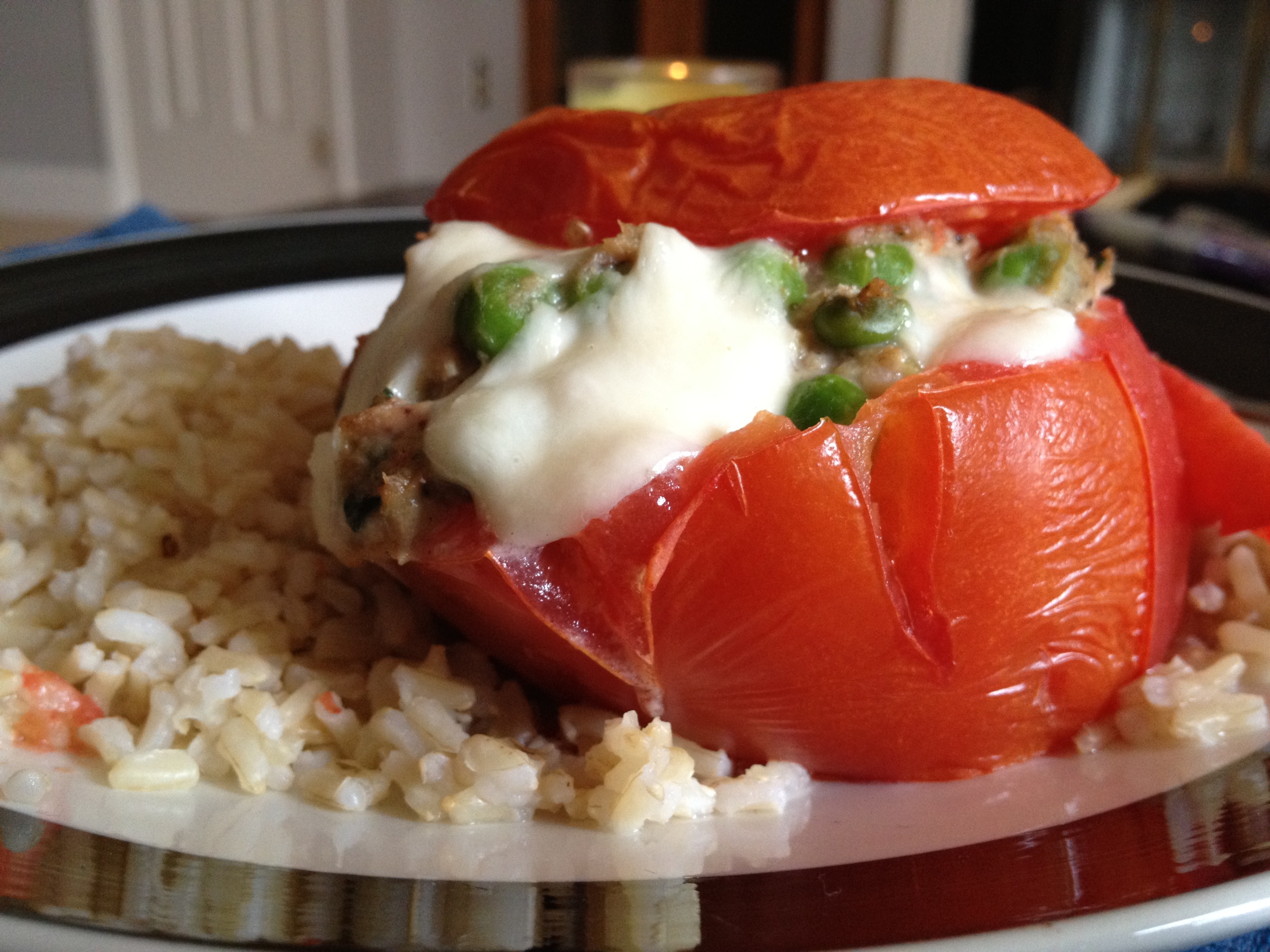 Fill tomatoes with mixture until overflowing. Top with chopped mozzarella. Cover with ‘cap’ of tomato and bake about 15 minutes, or until cheese is melted and tomatoes are heated through. Serve over brown rice.