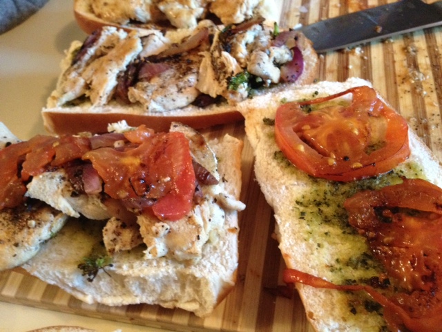 - Sprinkle chicken with salt and pepper. Add to skillet. Cook on medium heat for 3-4 minutes per side, or until juices run clear. Remove from pan, slice thinly, and place on top of one side of each roll. Top with roasted red onion, sliced tomato, and spinach. Finally, top with cheddar cheese slices (2 per sandwich) and sprinkle with dried basil.
