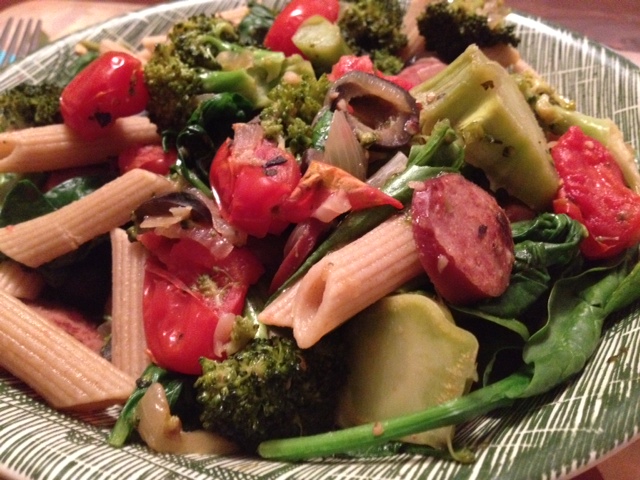 - When pasta is done, drain and stir into the veggie and sausage skillet.