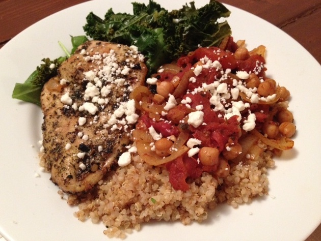 - Serve over cooked quinoa and steamed kale. Add chicken on side if desired. Top with crumbled feta cheese.