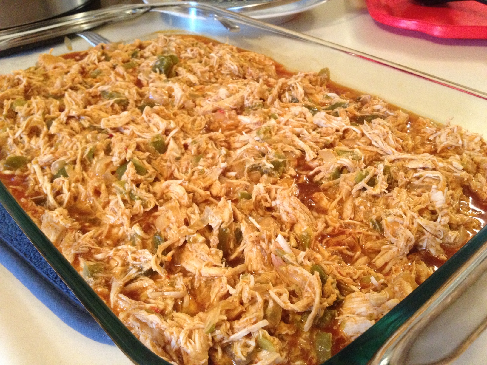 Pour enchilada sauce over top. When chicken is done, shred and mix into peppers and onions. Pour over top of casserole and sprinkle remaining 3/4 cup cheese over top. Bake 15 additional minutes at 400 degrees.
