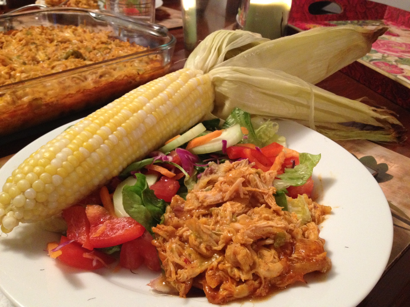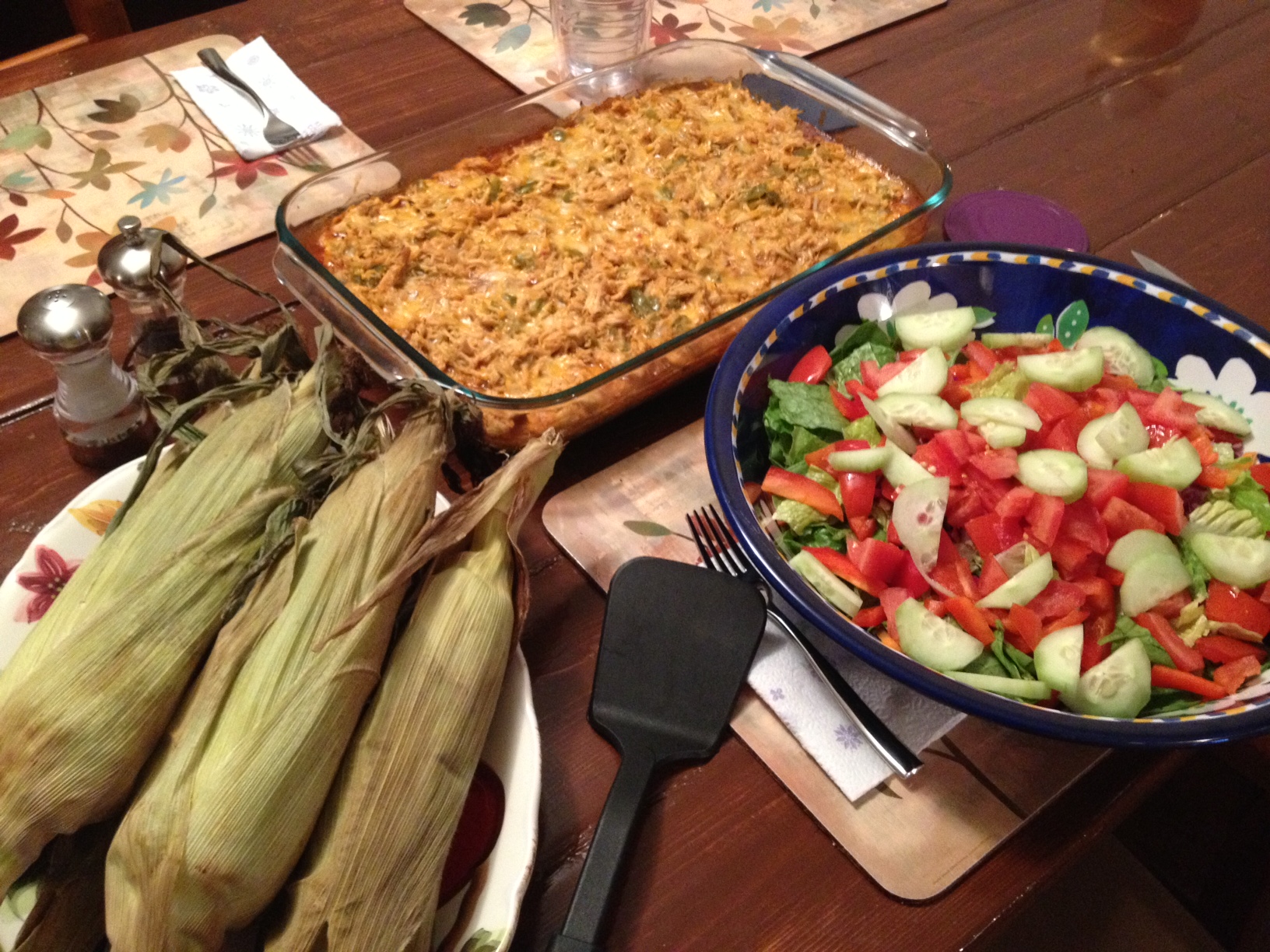 (This is a slightly adapted recipe from Cooking Light’s Chicken Tamale Casserole recipe. You can find it here. I added pinto beans and the peppers and onions in with the chicken when I cooked it, as well as the taco seasoning for some extra flavor!)