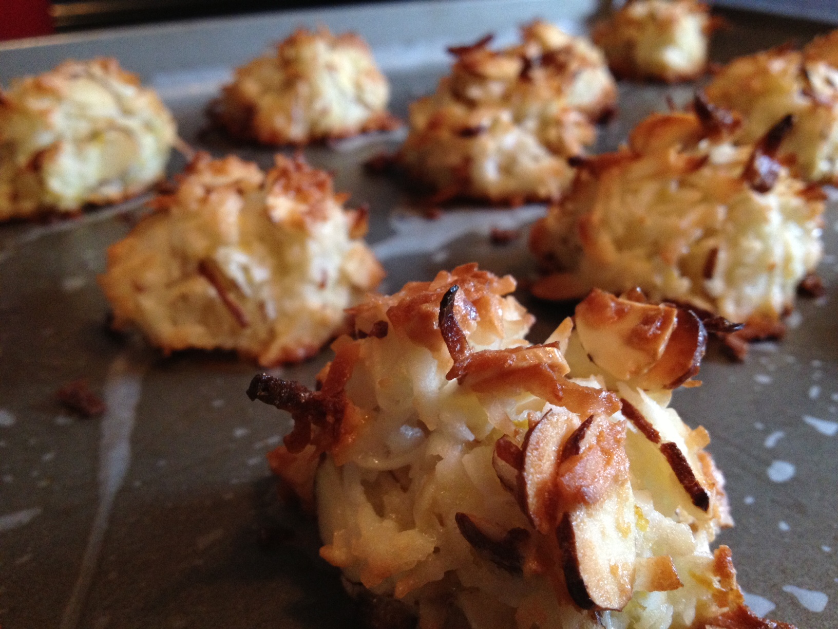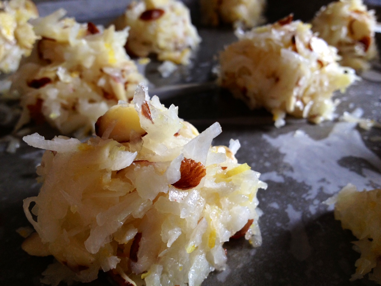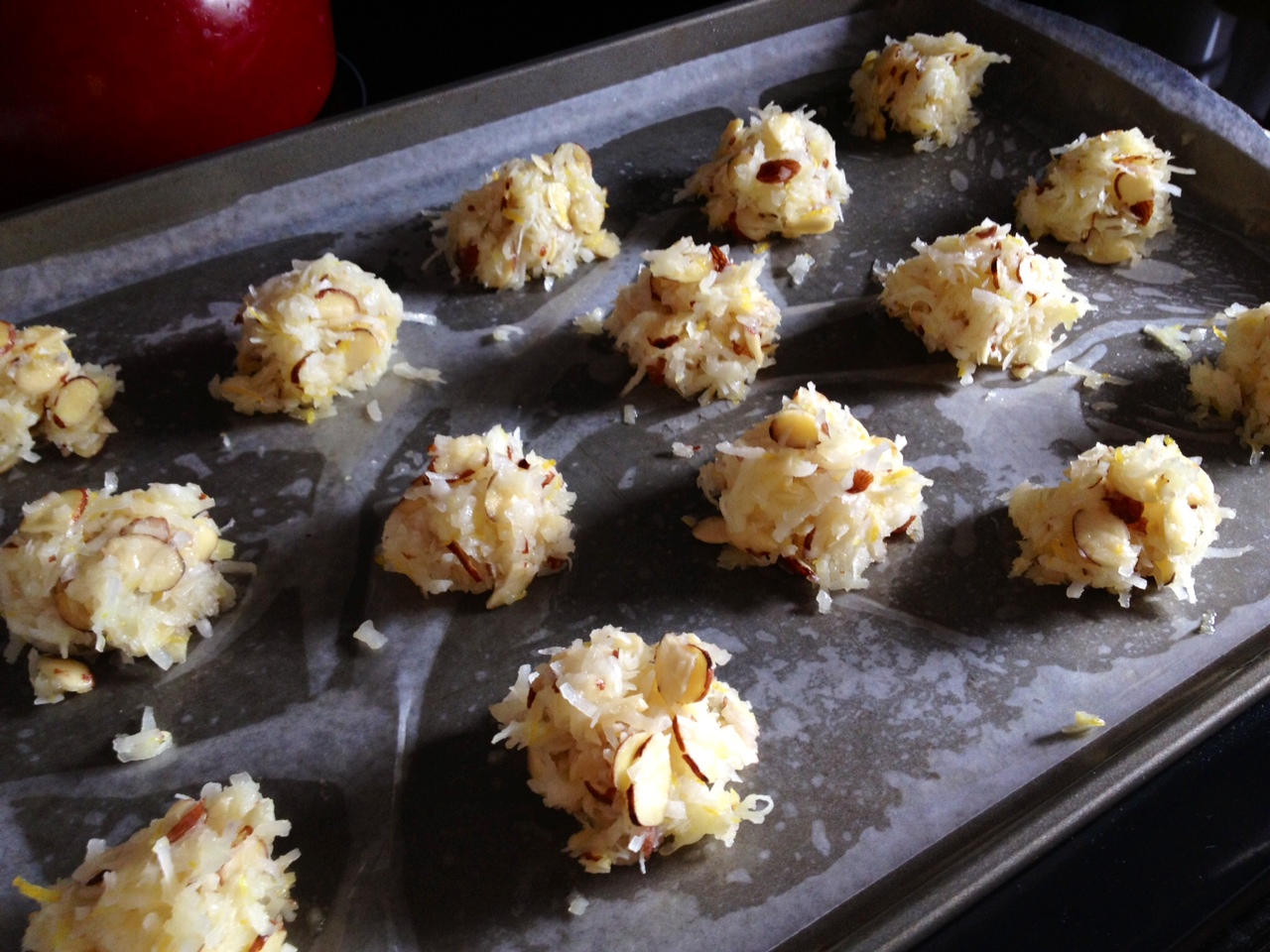 What to make? He loves coconut and nuts and lemon, so I decided to whip up some lemon almond macaroons. Macaroons are so simple to make in terms of ingredients and mixing… no dry ingredients (save sugar, of course), so all you do is mix up some egg whites, coconut, sugar, lemon zest or vanilla extract, and nuts of your choice in a large bowl and drop by the moundful on a baking sheet!