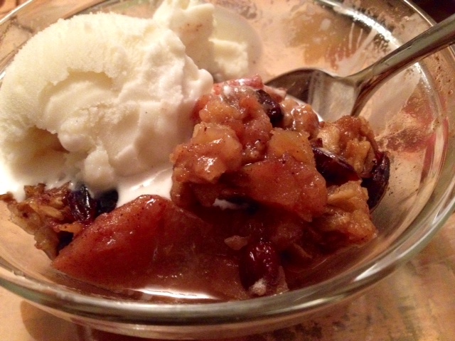 Apple & Pear Harvest Crumble with juicy raisins and chopped walnuts, served with a scoop of Stonyfield frozen vanilla yogurt 🙂