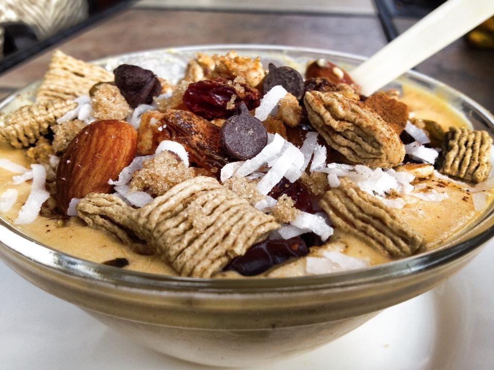 “Crunchy Pumpkin Parfait” with crumbled Quaker Oat Squares, raisins, almonds, coconut flakes, and chocolate chips!