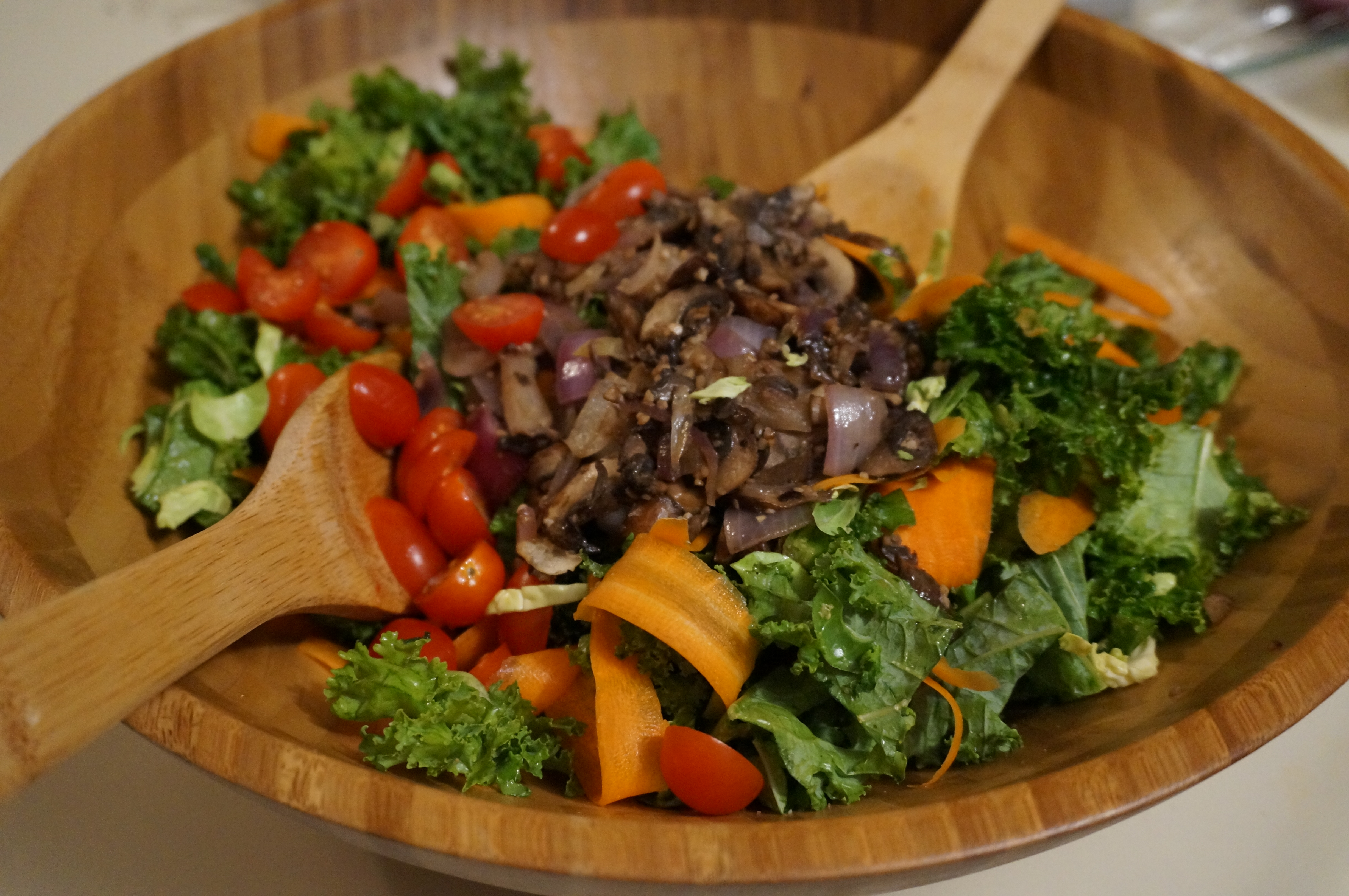 3. In a medium saute pan, heat 1 tsp oil on medium-high. Add red onion, minced garlic, and mushrooms. Cook until soft, about 4 minutes. Remove from pan and add to kale mixture.