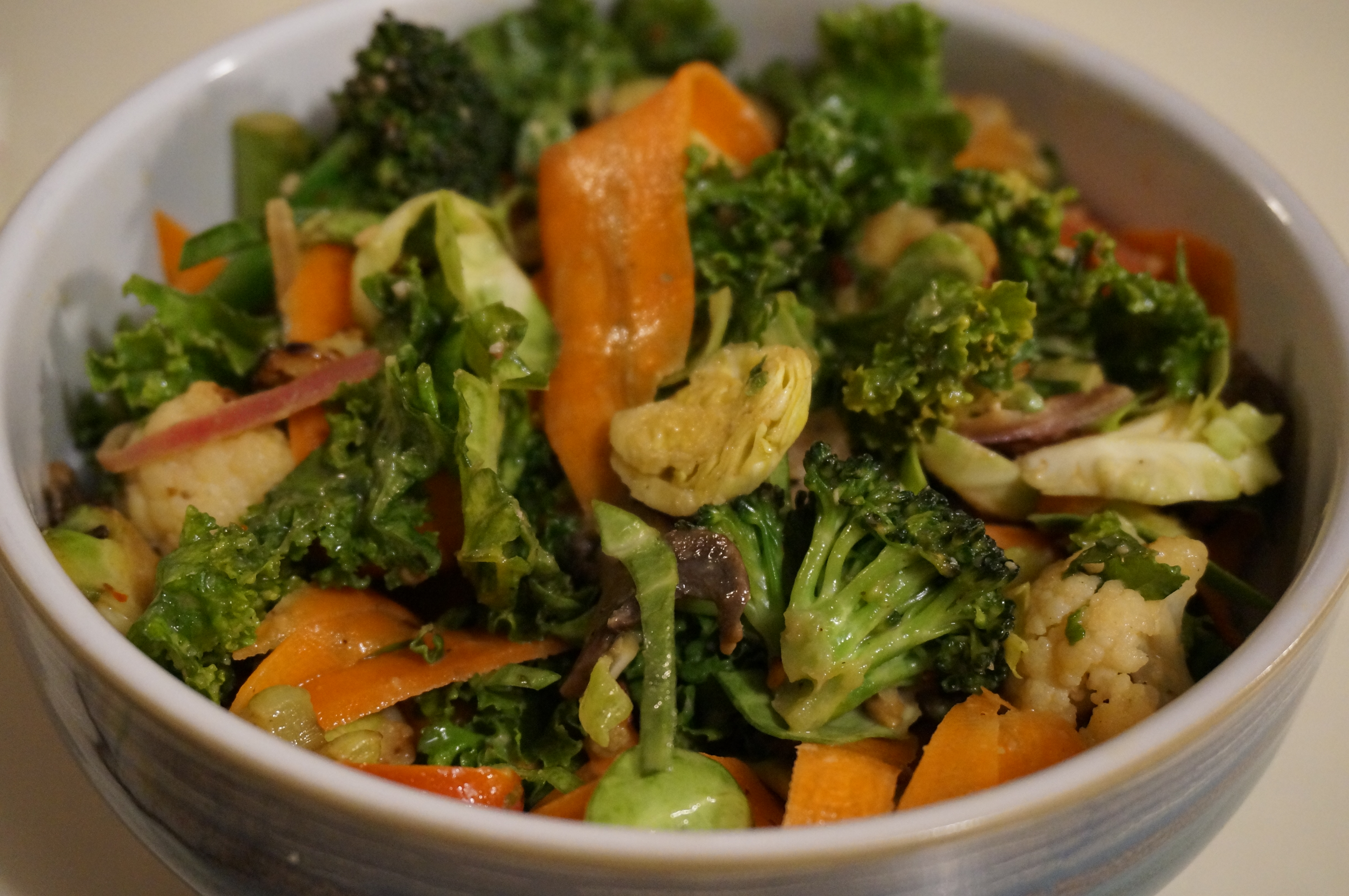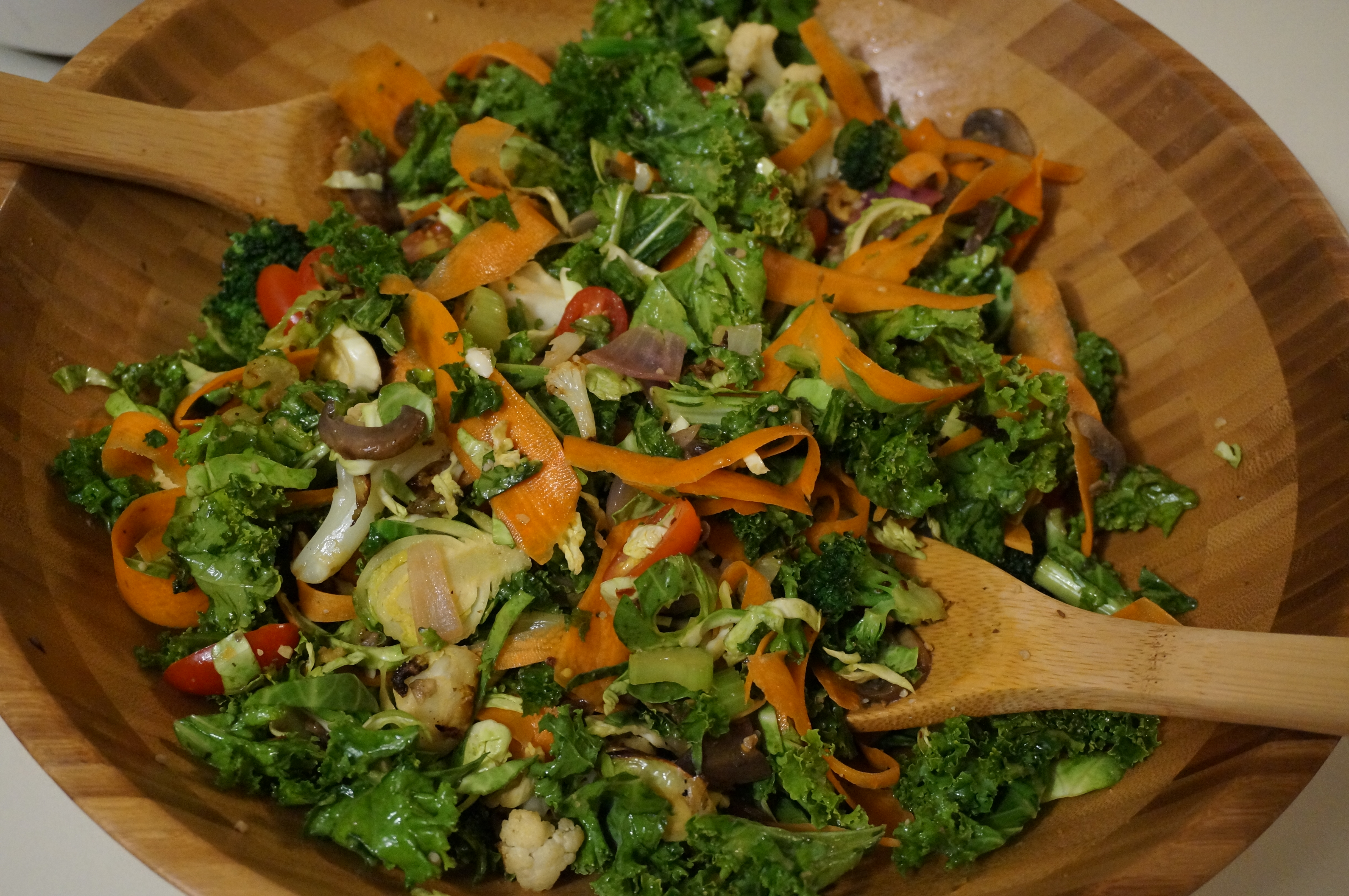 5. Remove from pan and add to rest of salad. Toss to combine. The greens will wilt a bit more under the residual heat of the veggies!