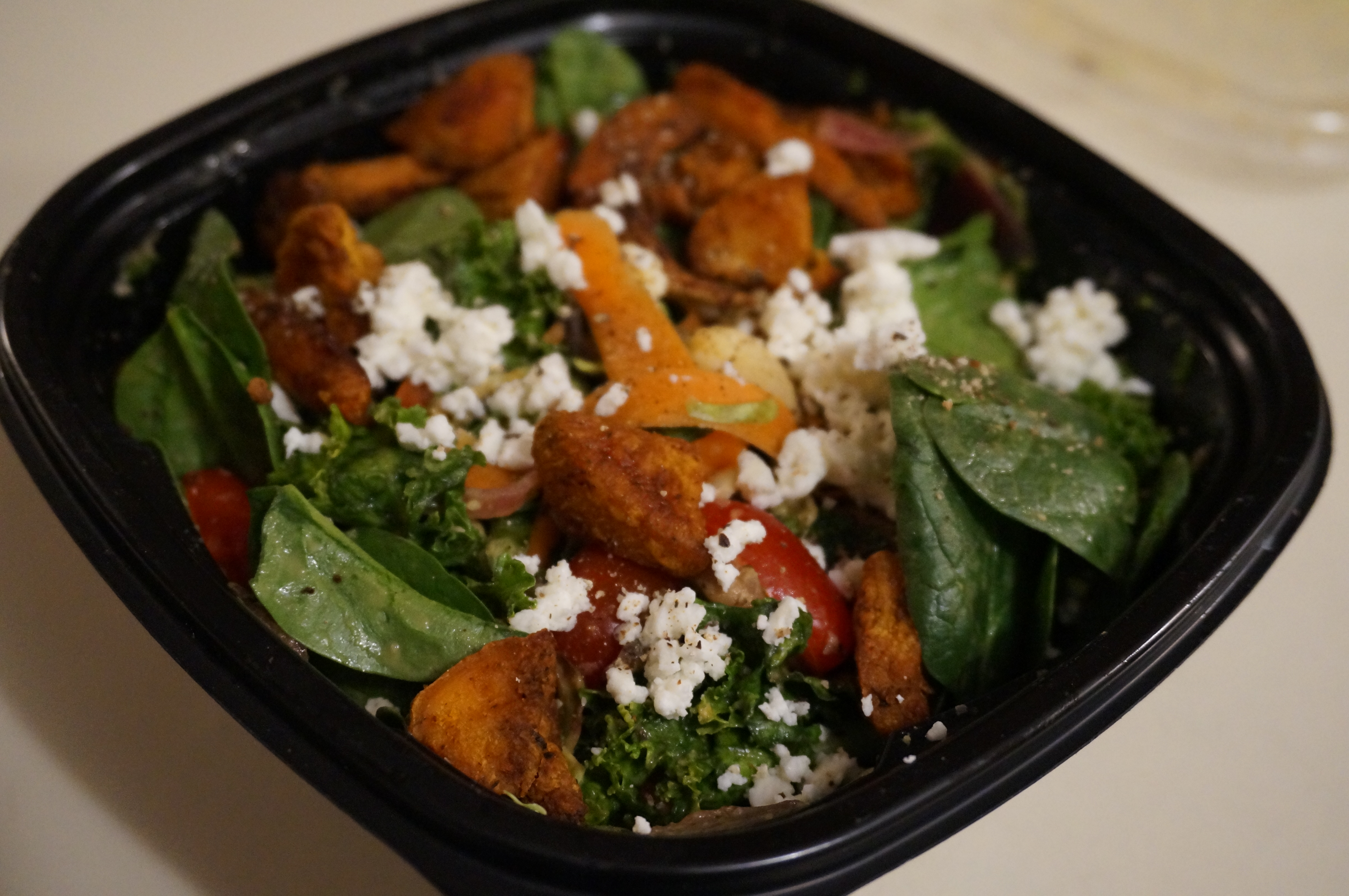 8. Crumble some feta cheese on top. Serve salad as a side, or top with leftover sweet potato wedges and chickpea patty (I love “MorningStar Farms Mediterranean Chickpea Burgers”!). A fried or poached egg would also be scrumptious 🙂