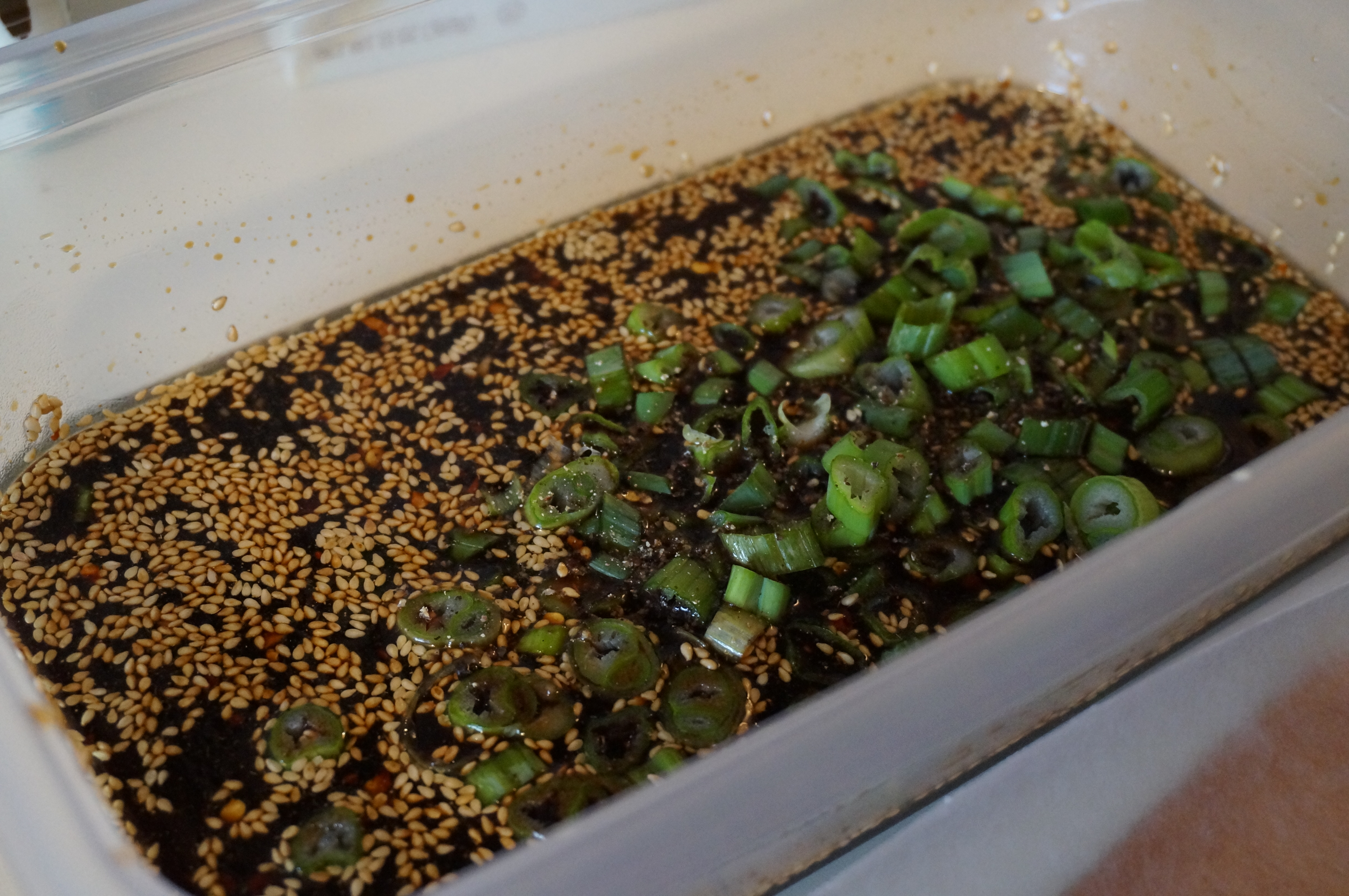 - For marinade, combine all remaining ingredients and whisk thoroughly in a tupperware or shallow baking dish.
