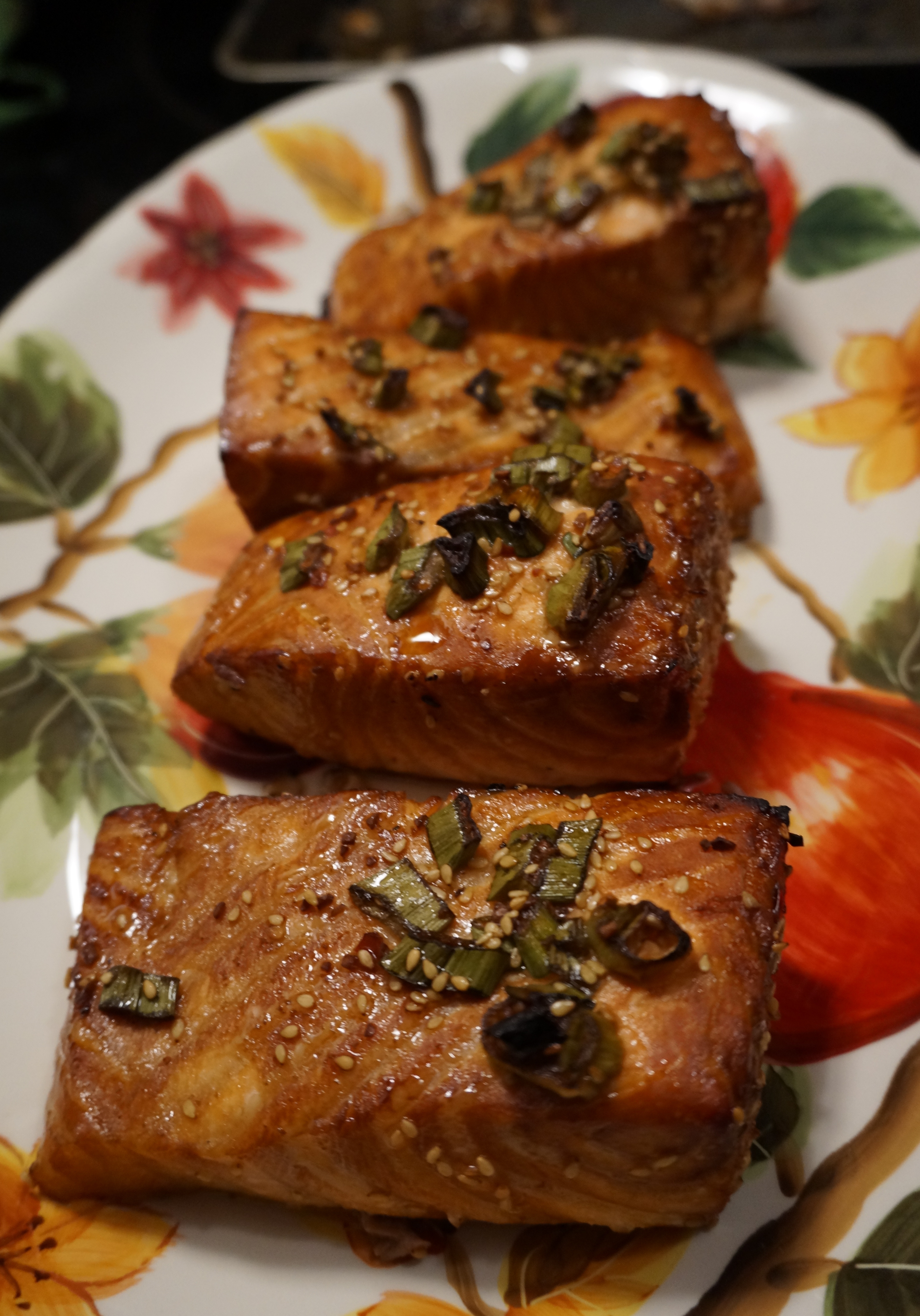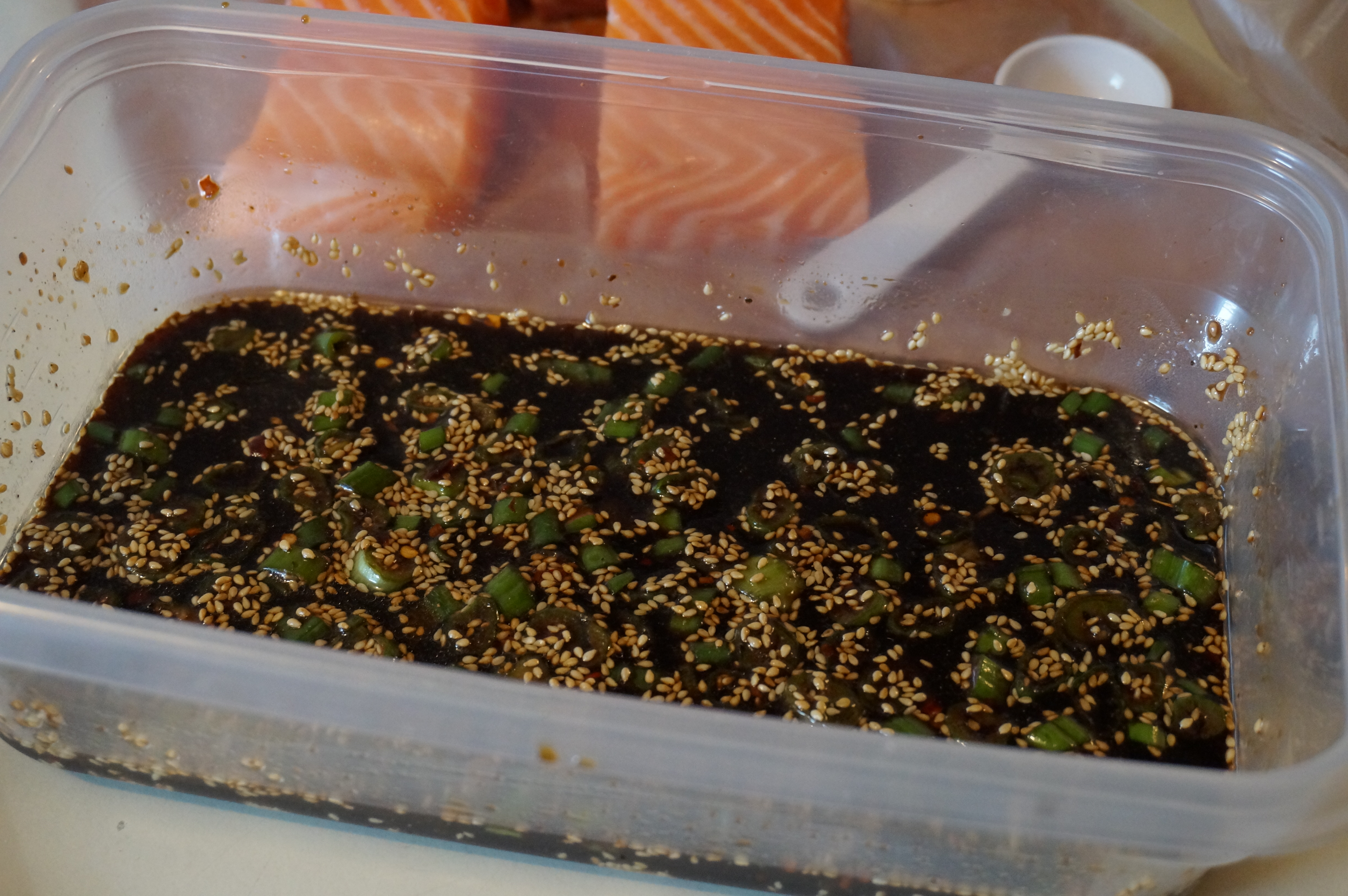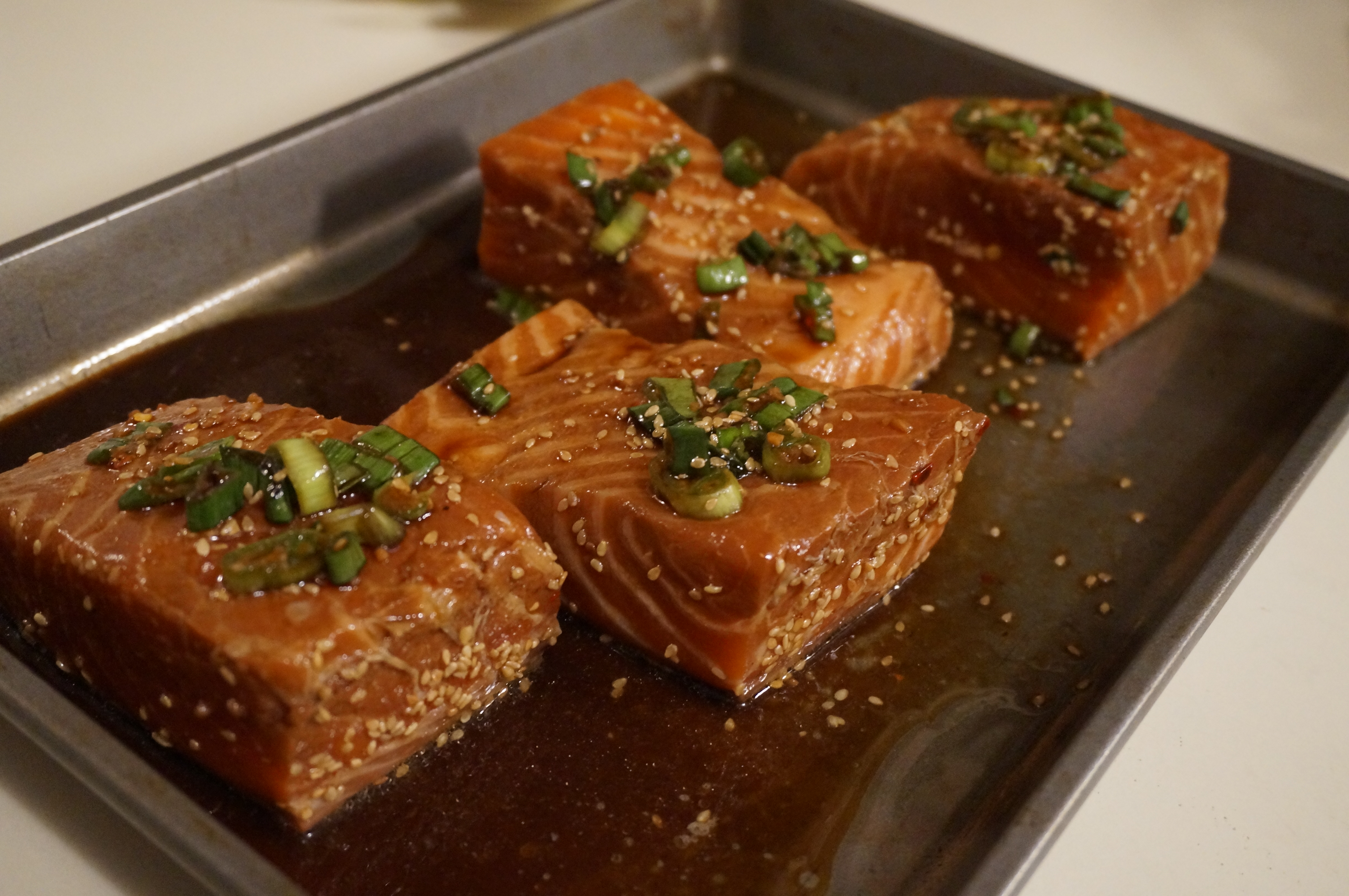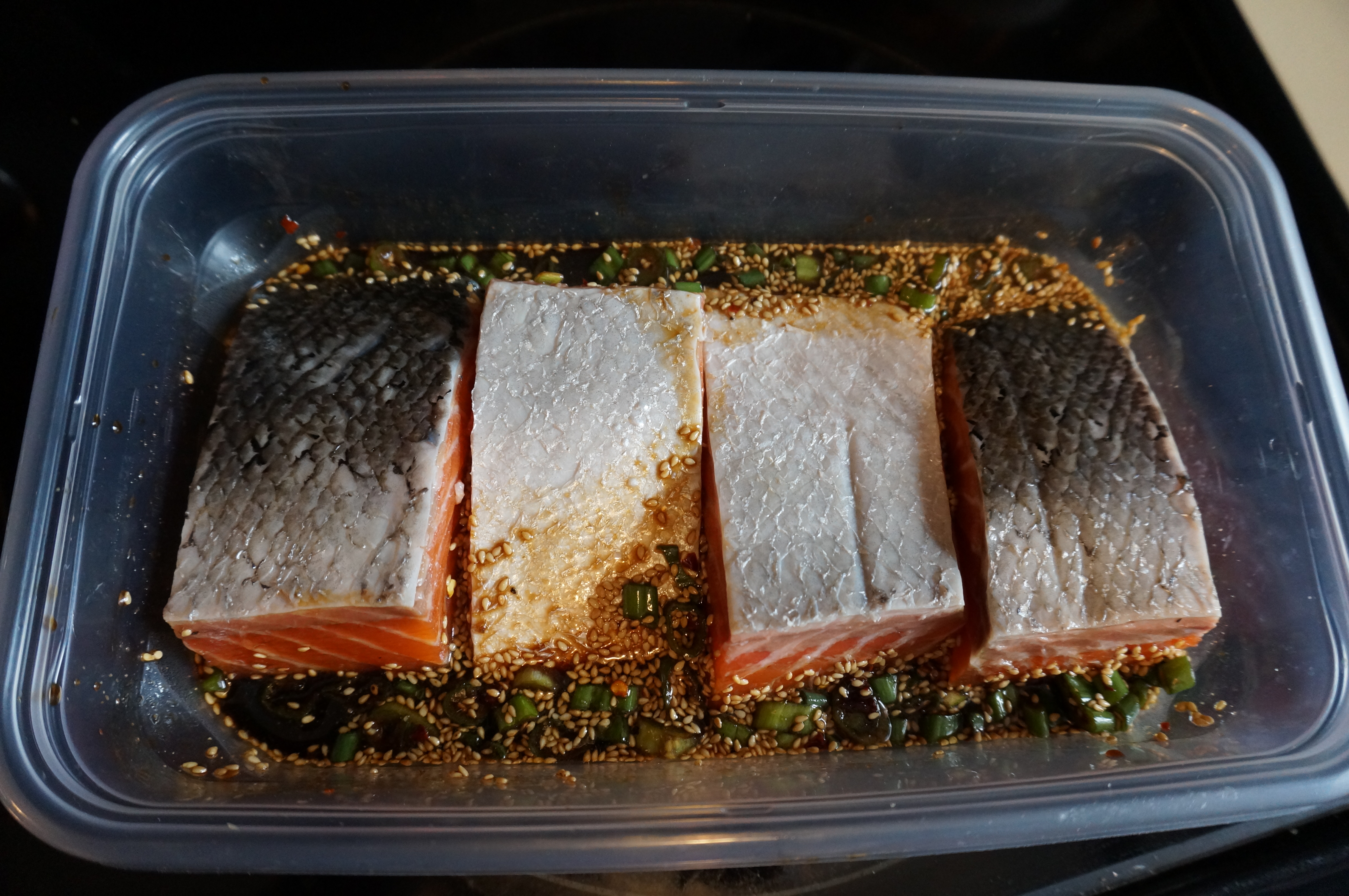 I chose to marinate and bake for our first try with this salmon, since to me, the slower process of baking leaves fewer things that can go wrong. I chose a honey-soy marinade with a bit of orange juice and some ginger and garlic (and lots of other spices I don’t even remember… just go look at the recipe for yourself!), and stuck the salmon in the fridge for a few hours to allow the fish to soak up the flavor.