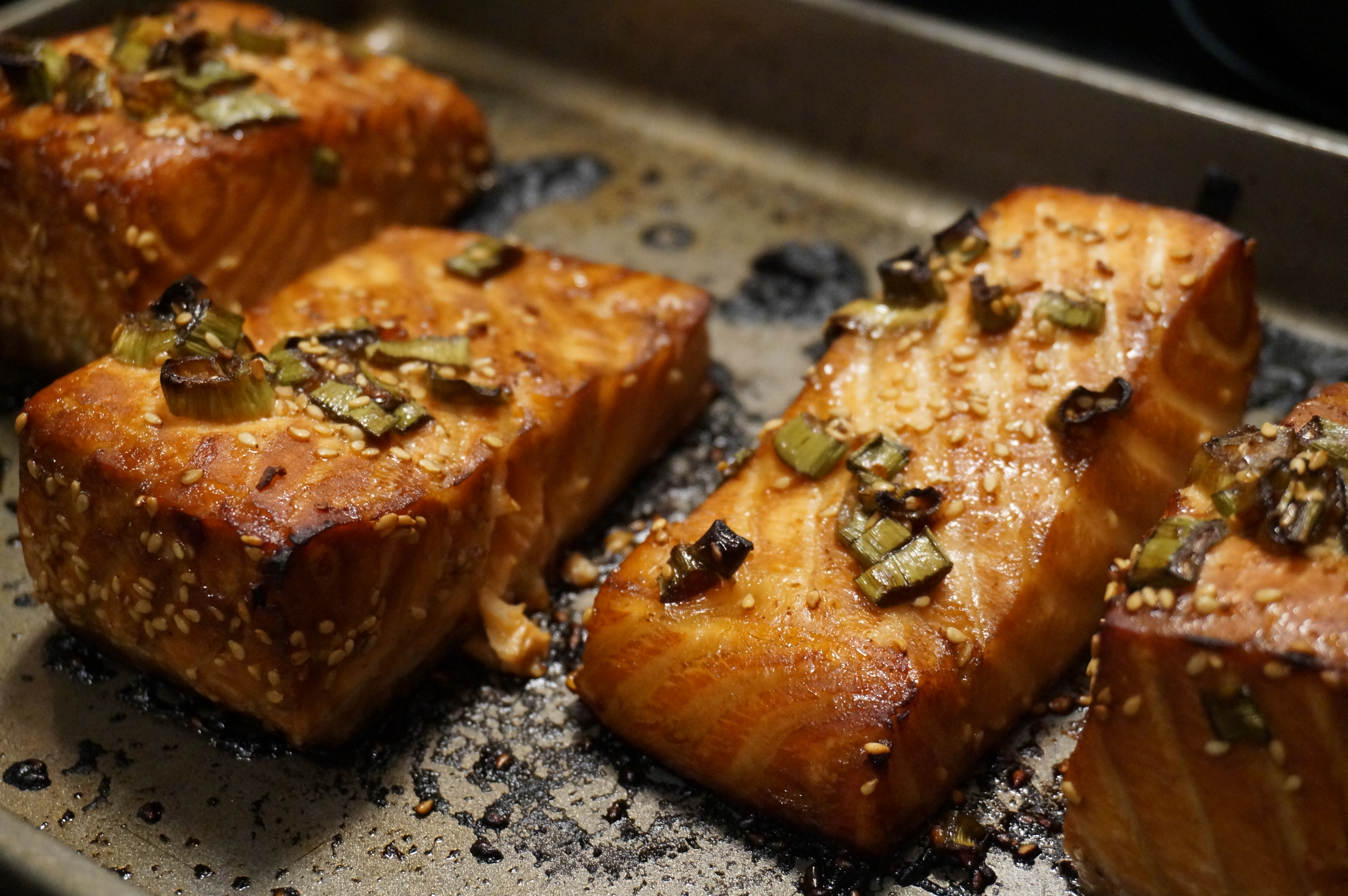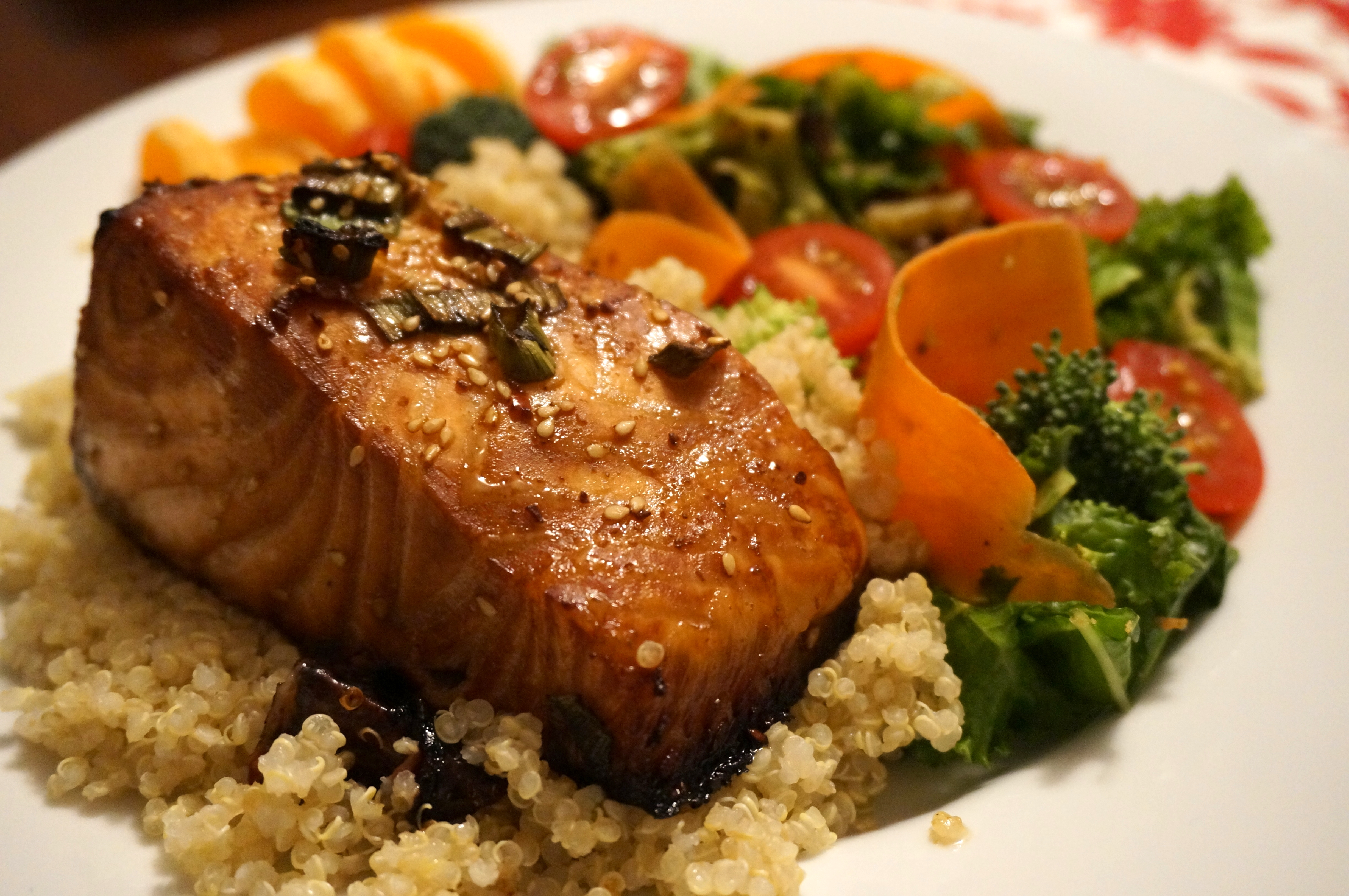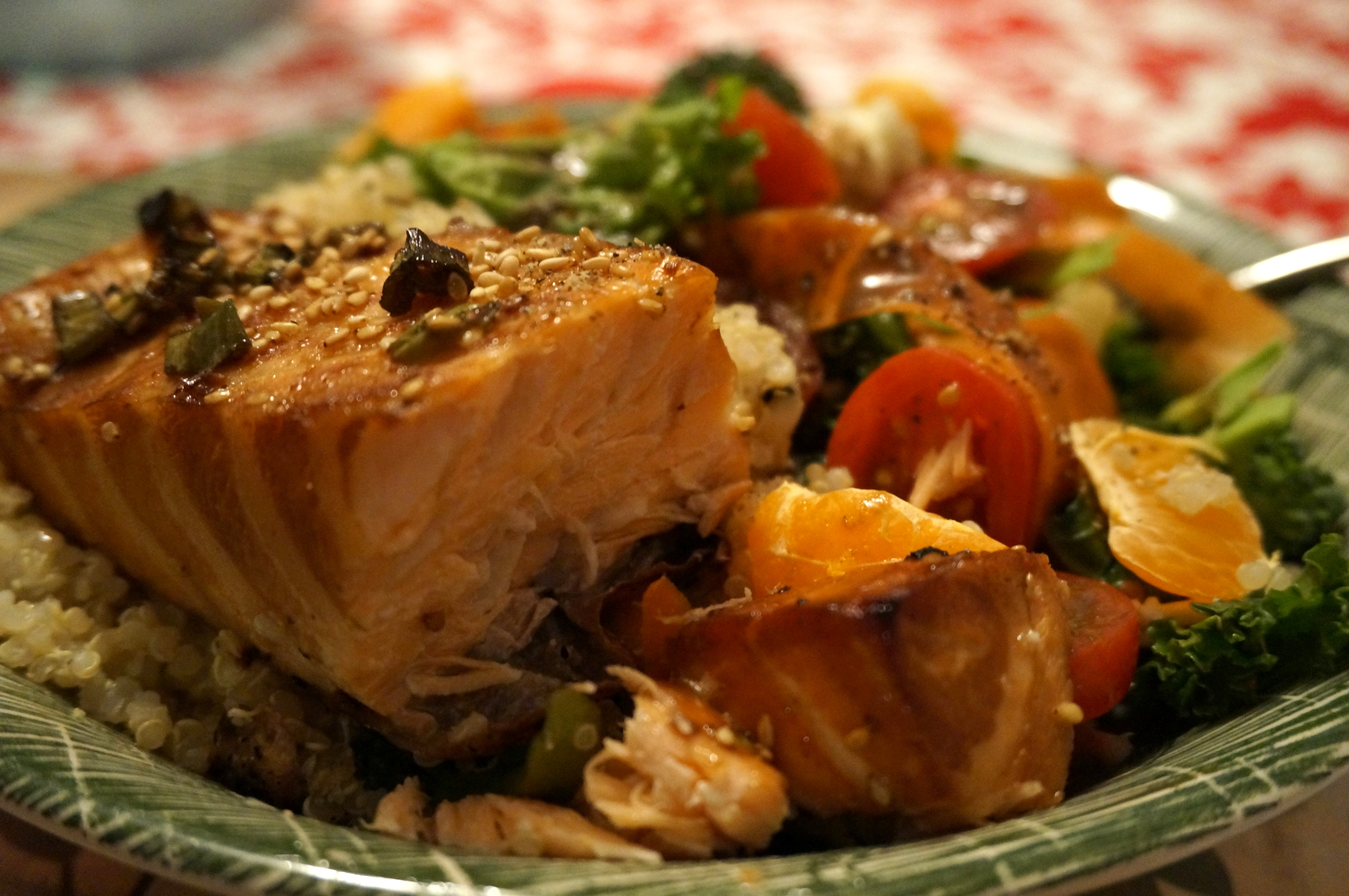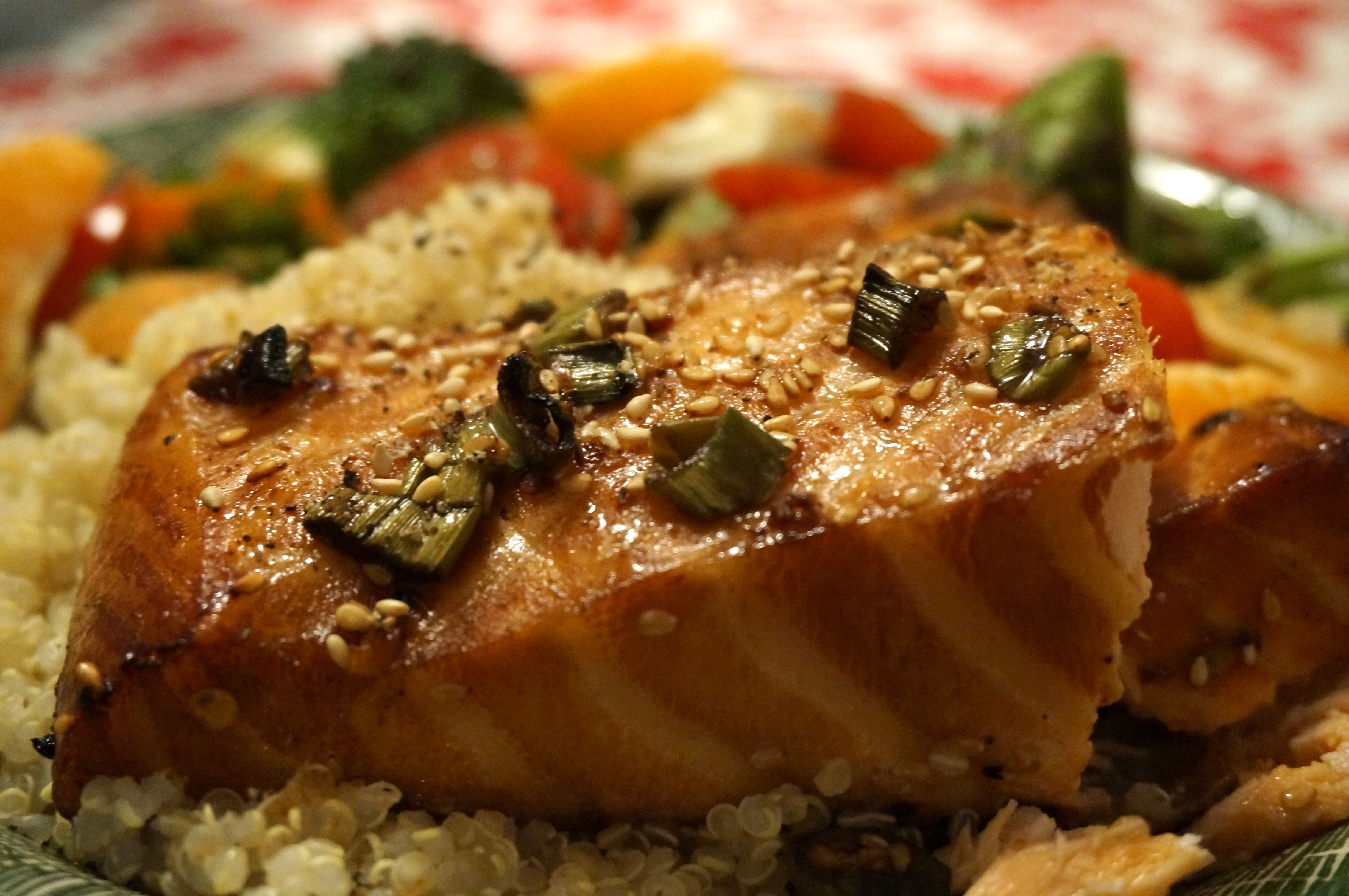 I chose to marinate and bake for our first try with this salmon, since to me, the slower process of baking leaves fewer things that can go wrong. I chose a honey-soy marinade with a bit of orange juice and some ginger and garlic (and lots of other spices I don’t even remember… just go look at the recipe for yourself!), and stuck the salmon in the fridge for a few hours to allow the fish to soak up the flavor.