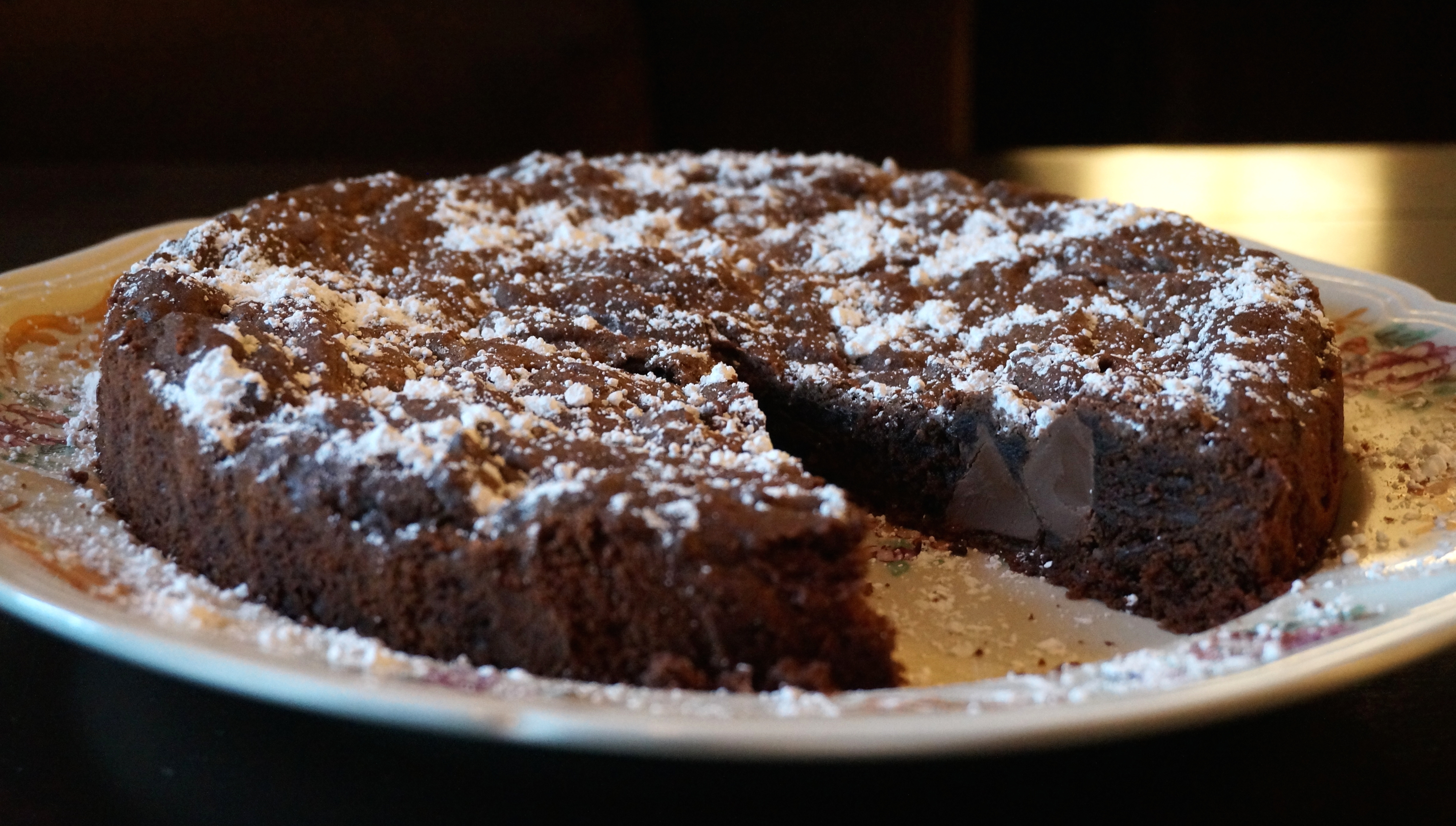 Last night I wanted to make something for our small group from church, and I had one of those “what do we have in the pantry that I can use up?” moments. Turns out we had almost an entire bag of Hershey’s Kisses that were begging to be used up. So I decided to make a kiss cake! When I sliced it up later, I was pleased to find that each pie-slice shaped brownie had at least one or two semi-softened kisses tucked cozily beneath the surface. I decided to add a little bit of cinnamon to the batter to make it a tad spicy, almost Mexican-chocolate style (minus the cayenne), and I dusted the finished cake with a bit of powdered sugar. I served it alone, but I’m sure it’d also be amazing with ice cream or a dollop of whipped cream!