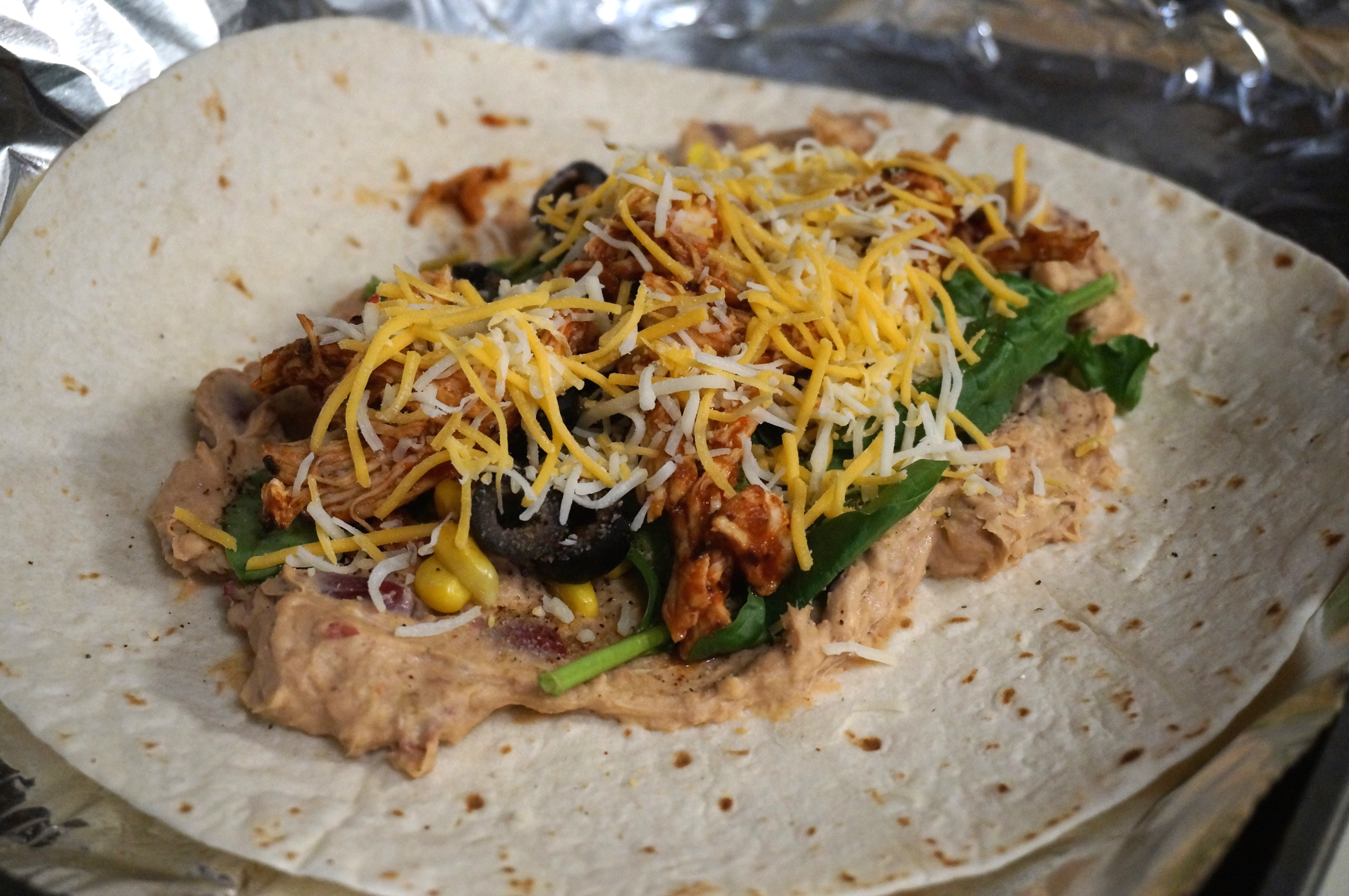 - Layer tortillas with a large spoonful of bean mixture and spread around the center of the tortilla, leaving about 2″ around the edges. Top with about 2 tbsp corn kernels, a few black olives, a few leaves of spinach, and a small handful cheese. Top with additional cumin and chili powder if desired.