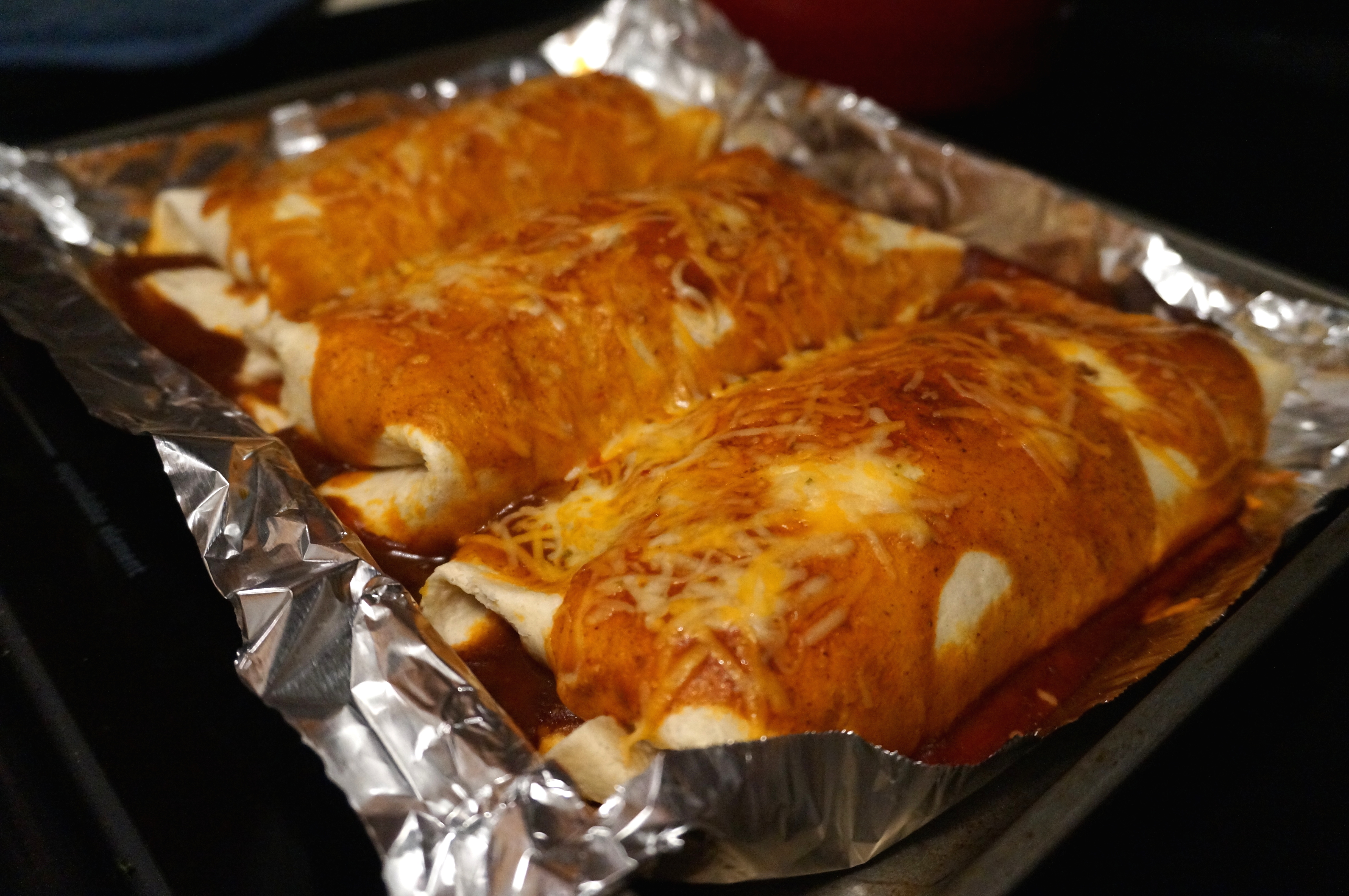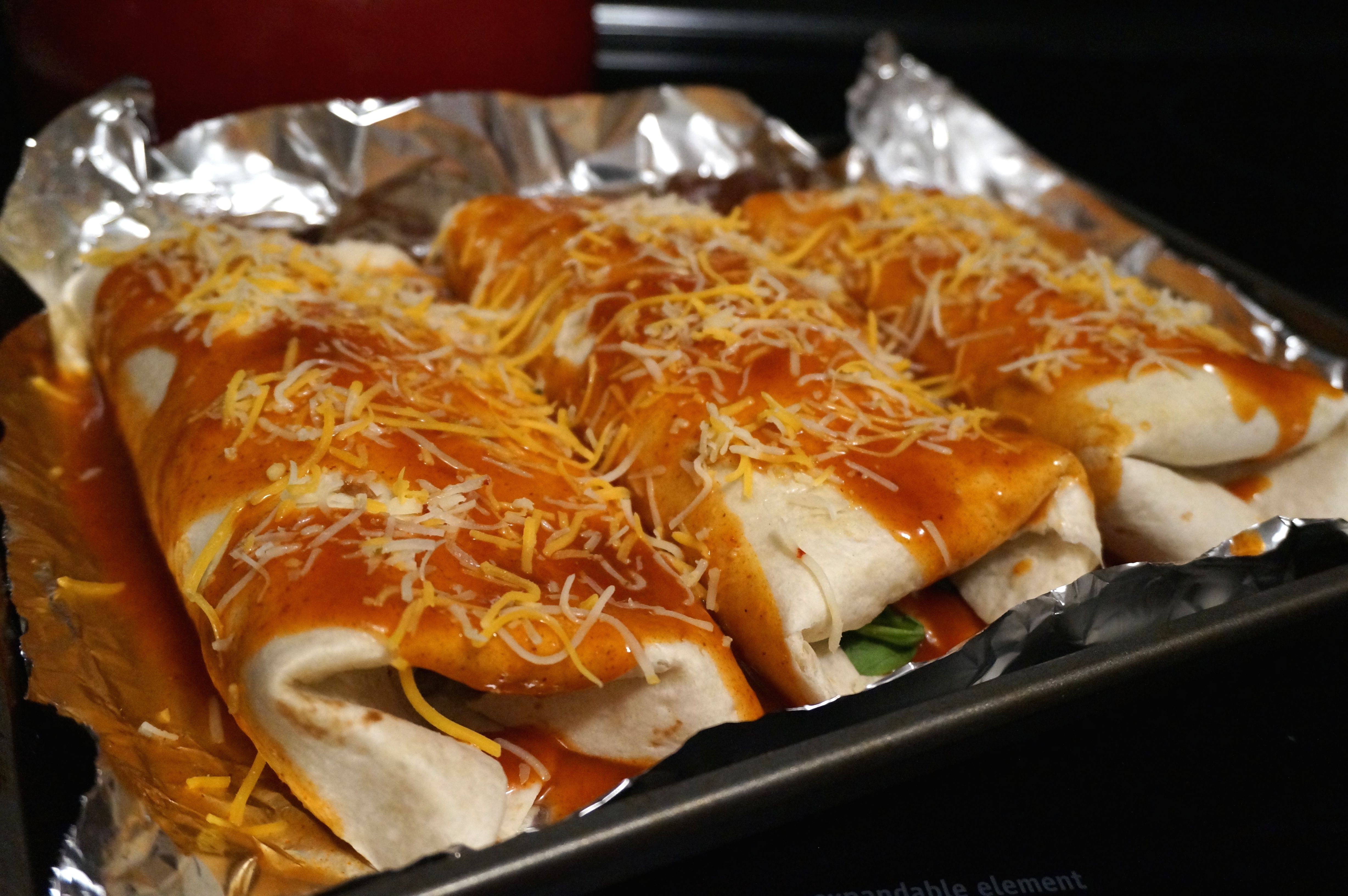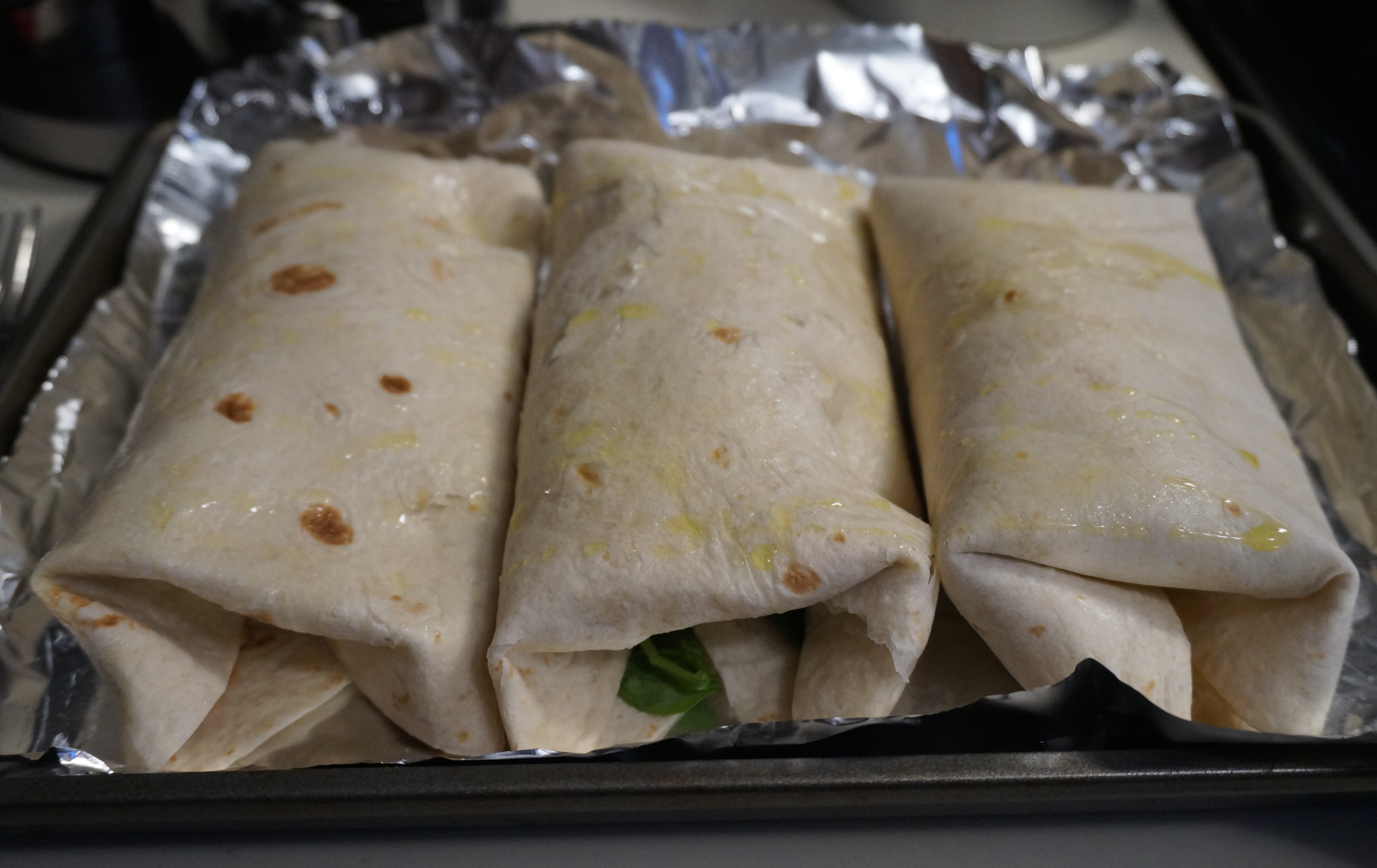 - Fold tortillas in at the sides and then roll. Place tortillas seam-side down onto a oiled baking sheet (I lined mine with foil first to make clean-up easier!)