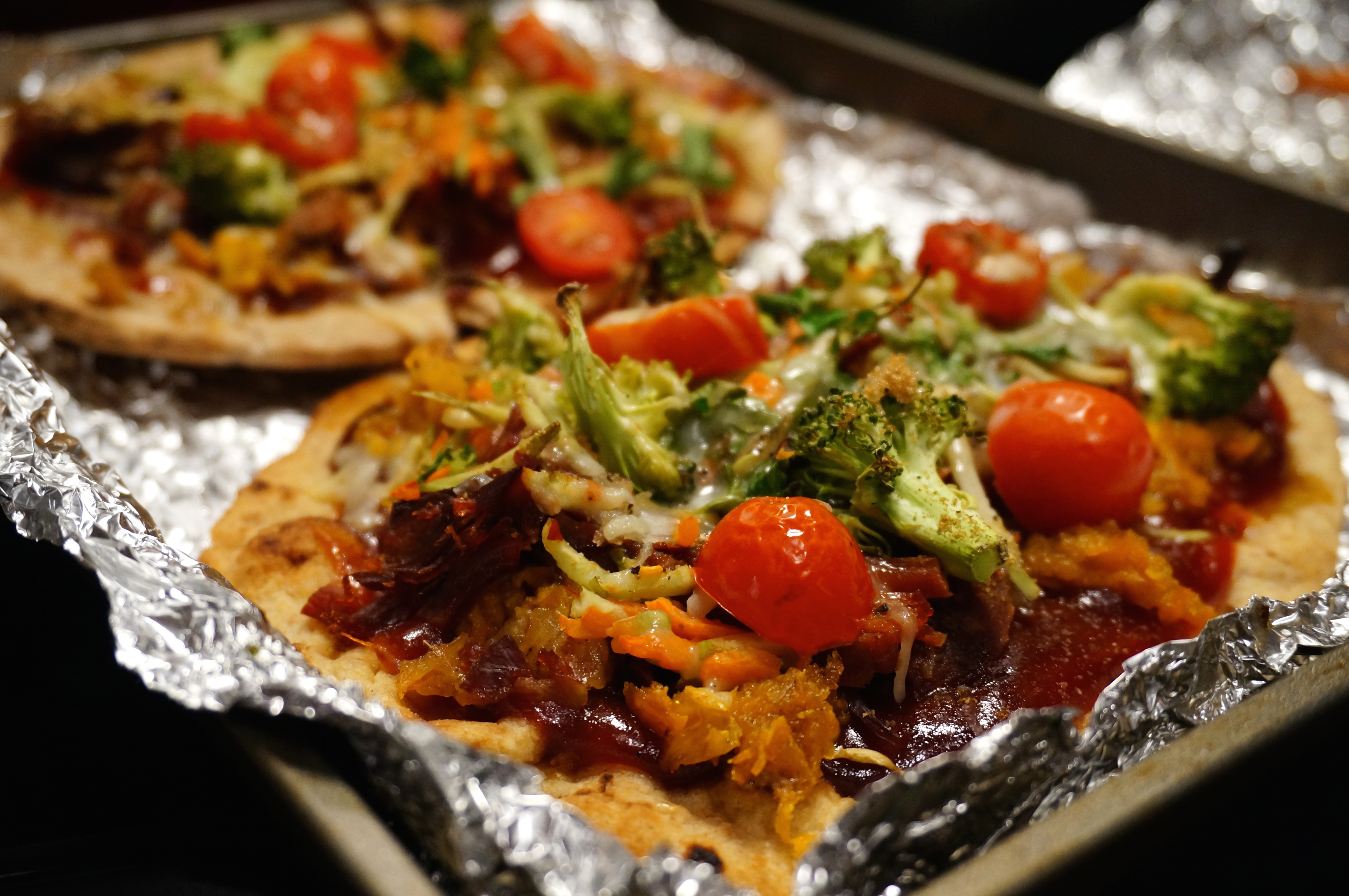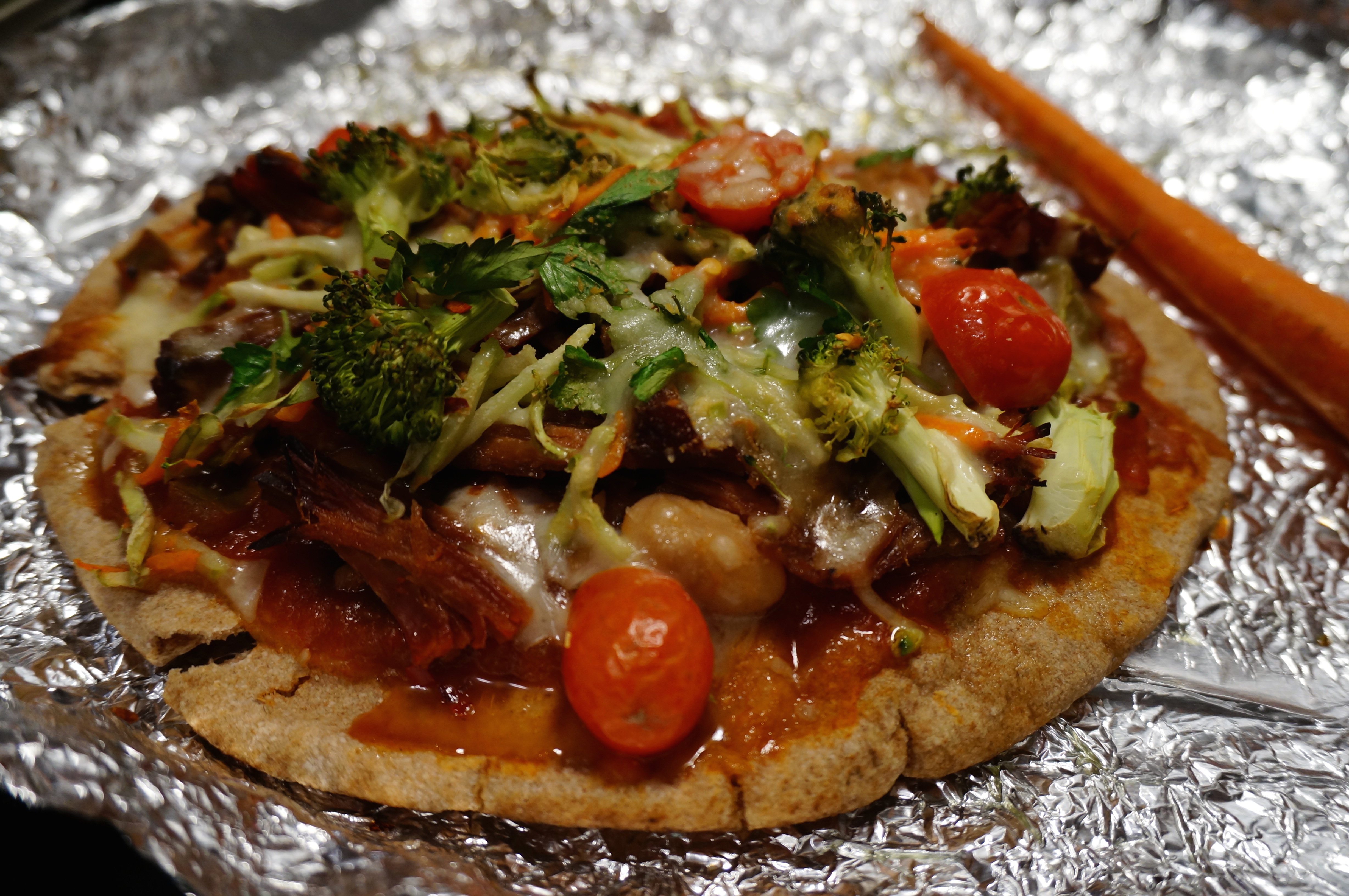 Ta-da! I used up some pita bread and one leftover slice of naan to make these personal pizzas. Two of them I topped with a mixture of BBQ sauce and ketchup, followed by some of the leftover pineapple ham, broccoli slaw, broccoli florets, cherry tomatoes, mozzarella cheese, and a sprinkling of cumin, brown sugar, fresh parsley, and shredded mozzarella. The last pizza I topped with salsa, and all of the other ingredients remained the same. Popped ’em in the oven at 325 for about 20 minutes, and out they came, all toasty. Delish!