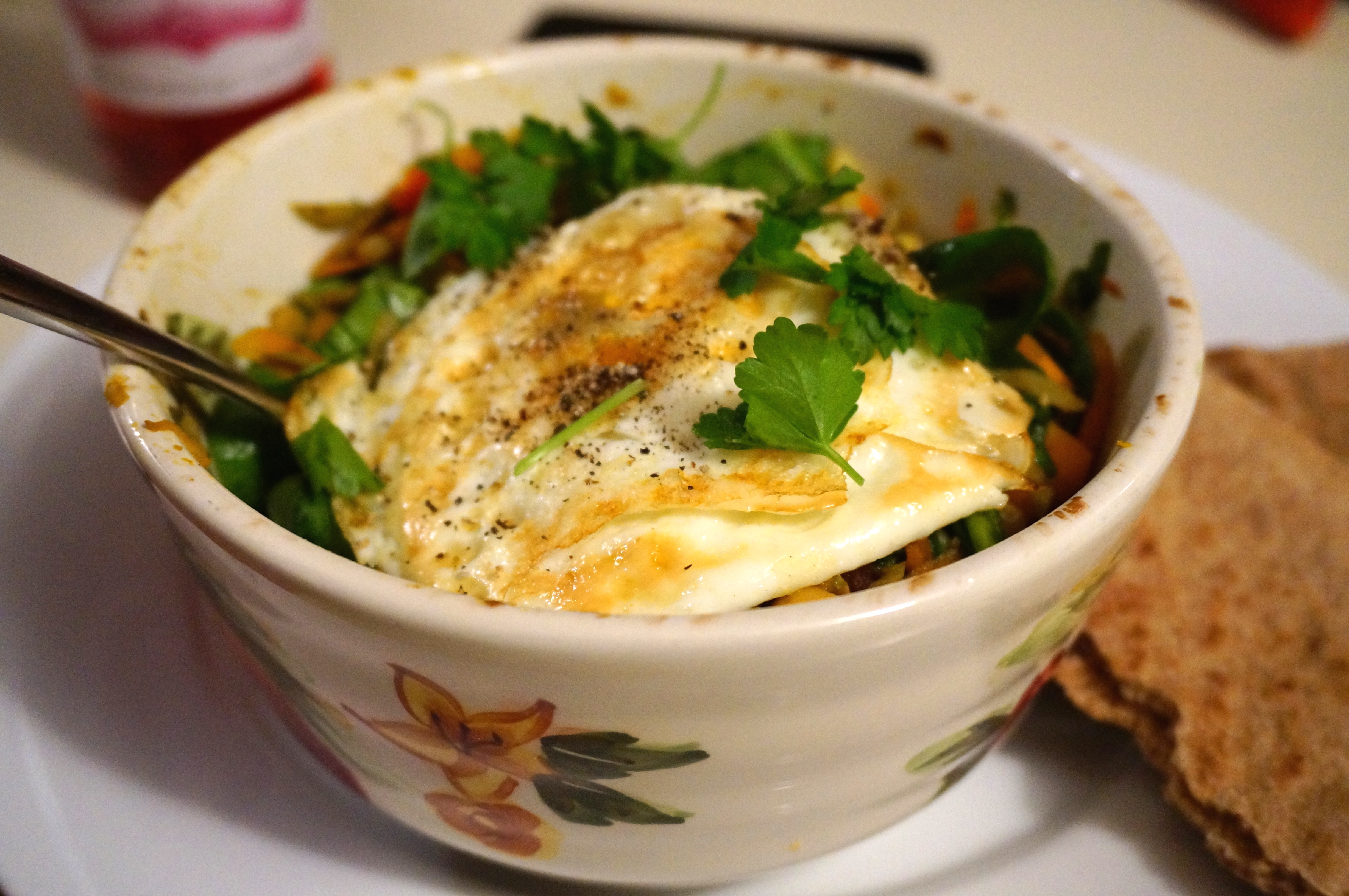 I was in a Meatless Monday mood, so I chose to have some leftover power salad from last week, with some added spinach, broccoli/carrot slaw, sliced strawberries, a few almonds, half a pita pocket, and a fried egg on top. (I’ve gotten really into fried eggs on top of my salads recently- more protein to satisfy, but without the meat!)