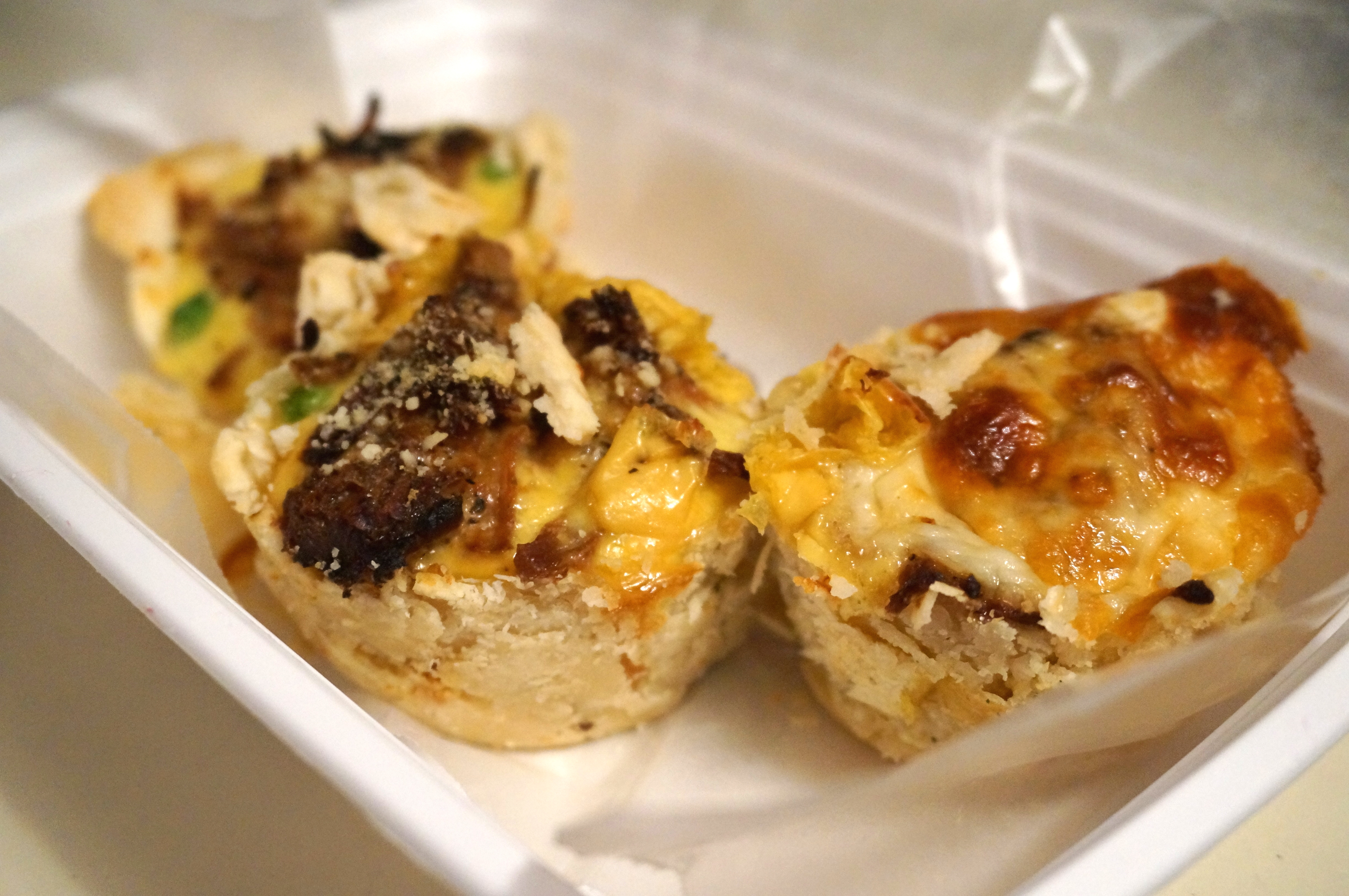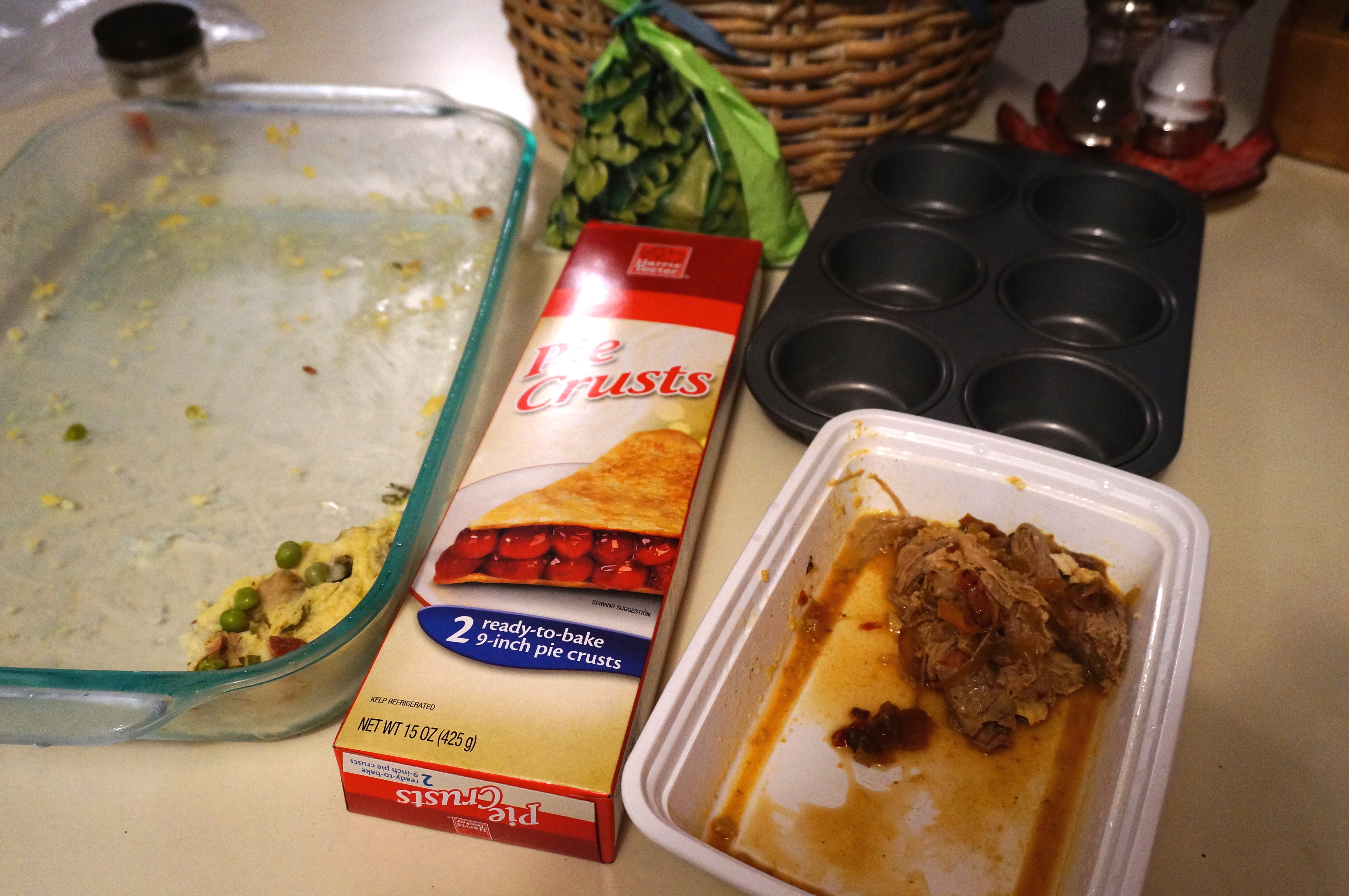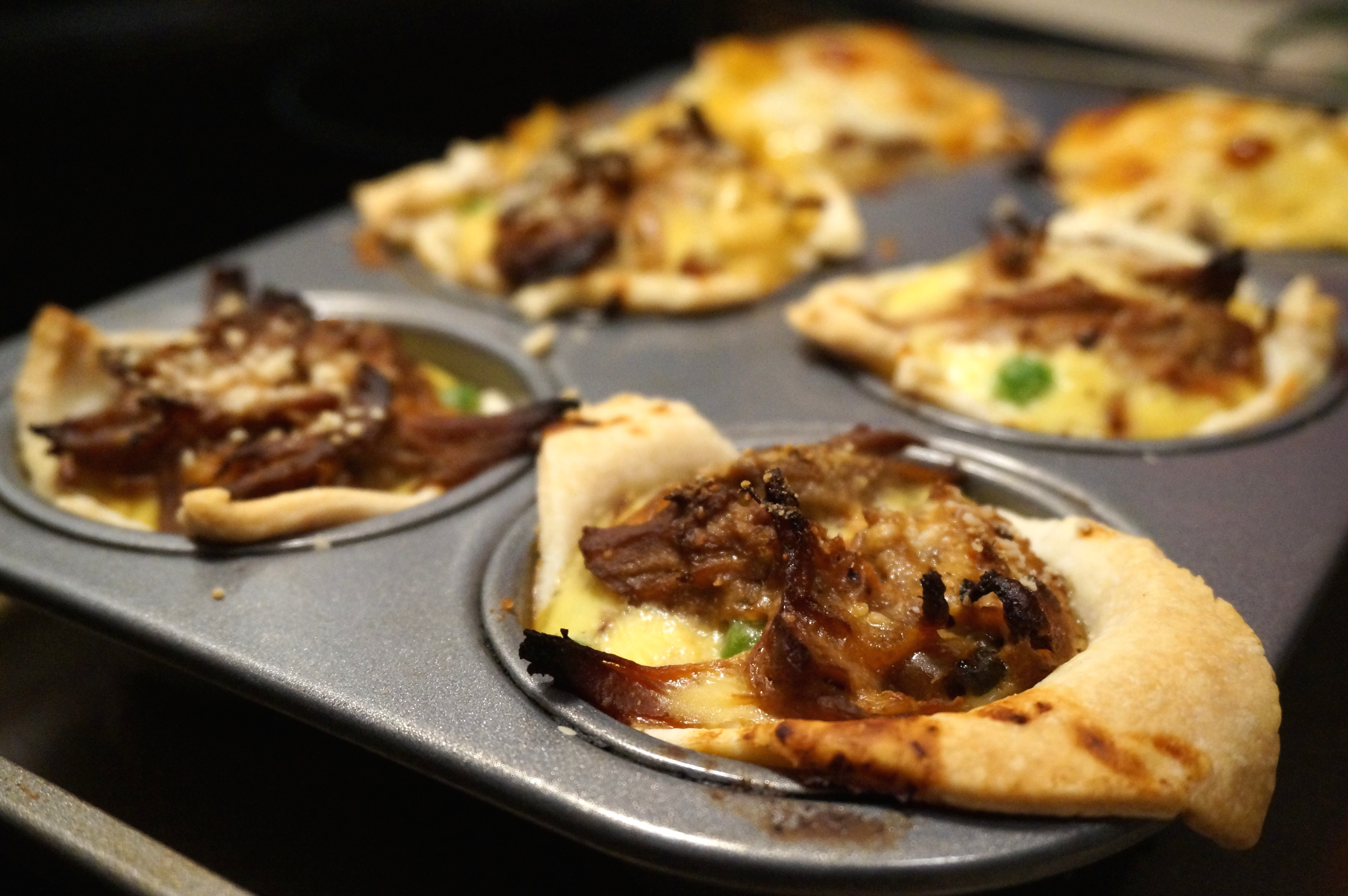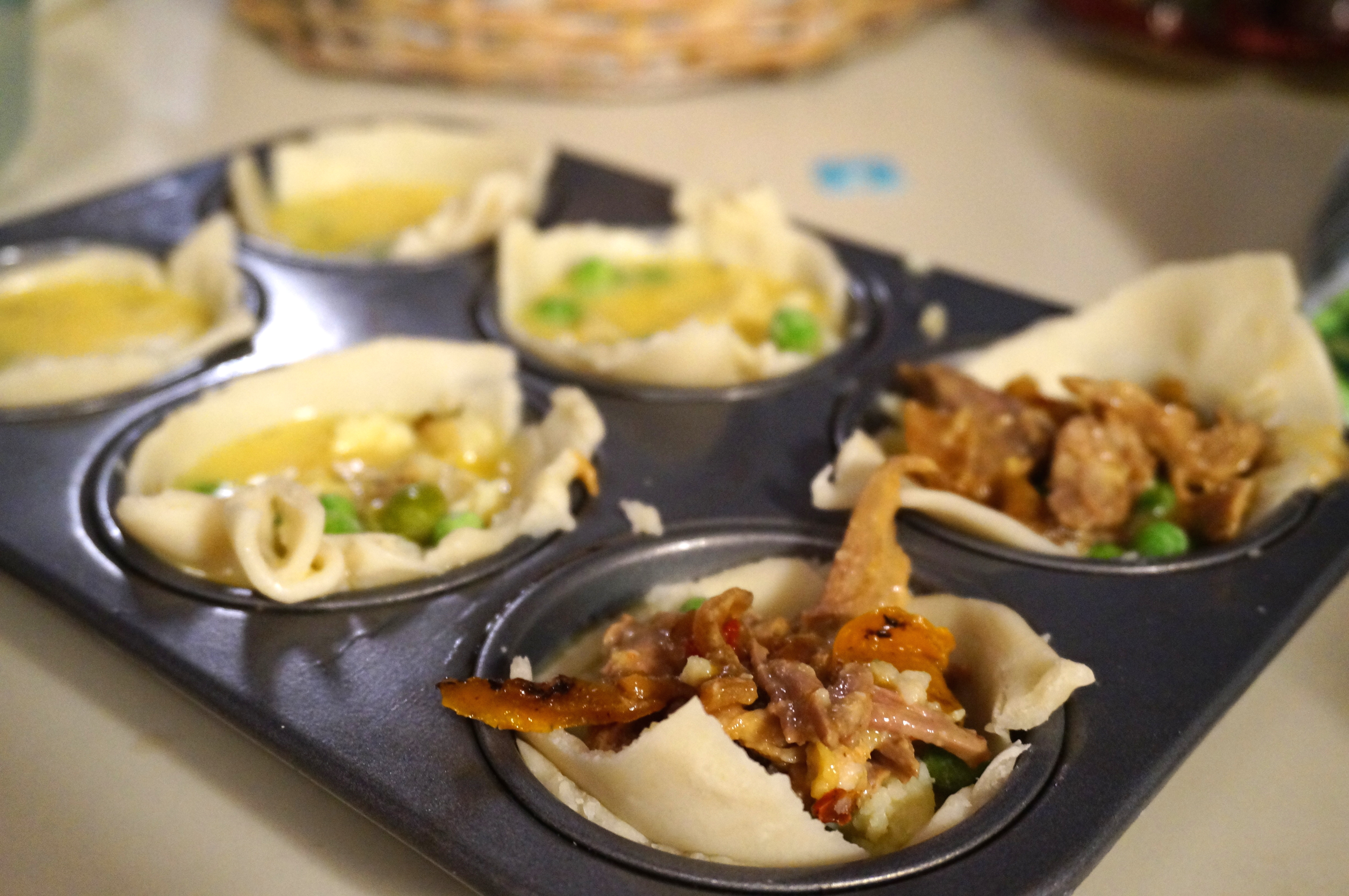 Filled up muffin tins with pie crust, some potatoes, peas, and pork. Added a bit of whisked egg/milk and some cheese on top!