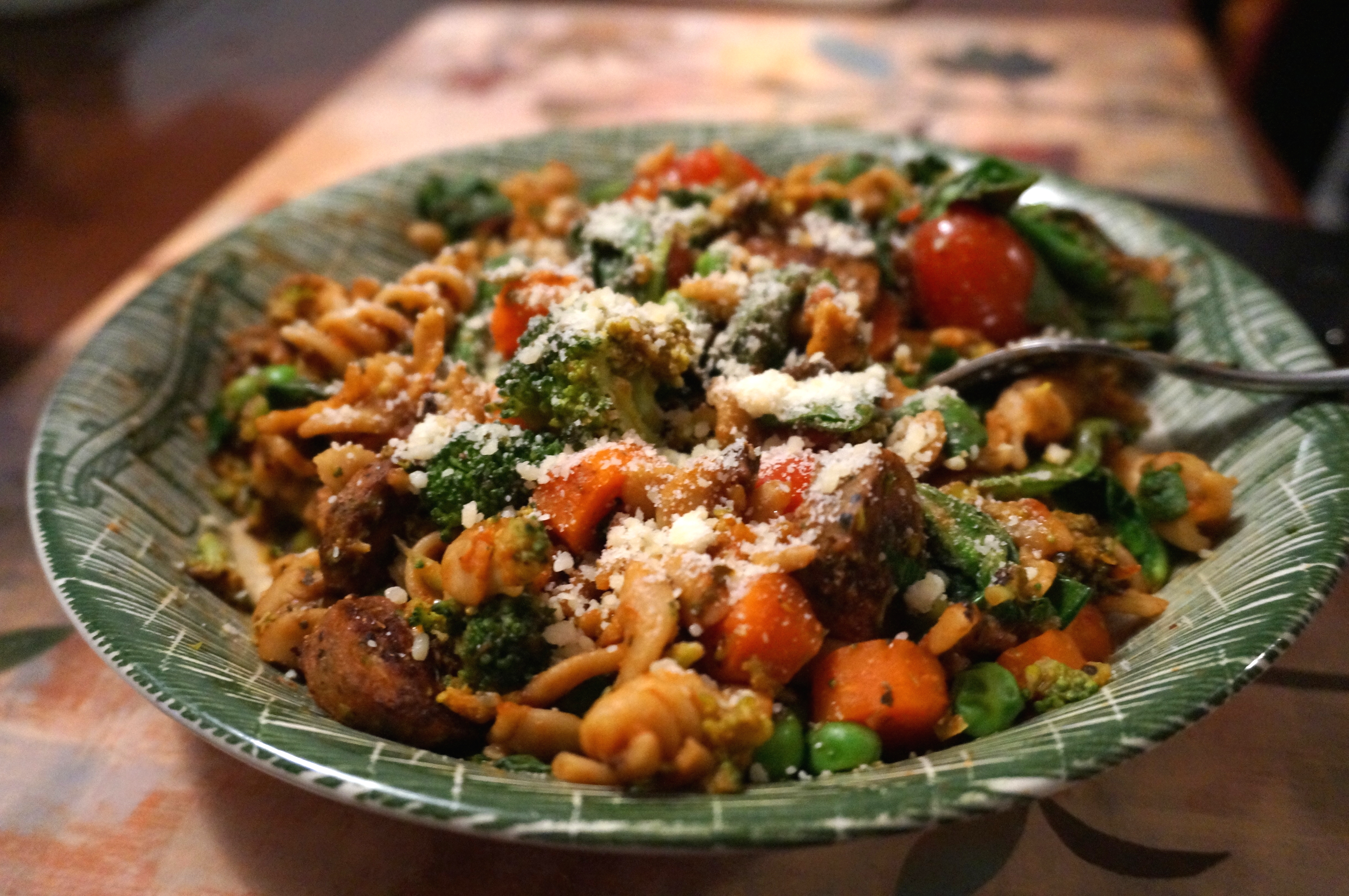 Some pasta salad leftover from our trip to Asheville, mixed with spinach and steamed veggies. Topped with some balsamic dressing and parmesan. This was my dinner cause I don’t particularly prefer pork. And we had a lot of pasta. On a more negative note, that was it for the spinach. Good thing I’m allowing it as one of my exceptions! 🙂