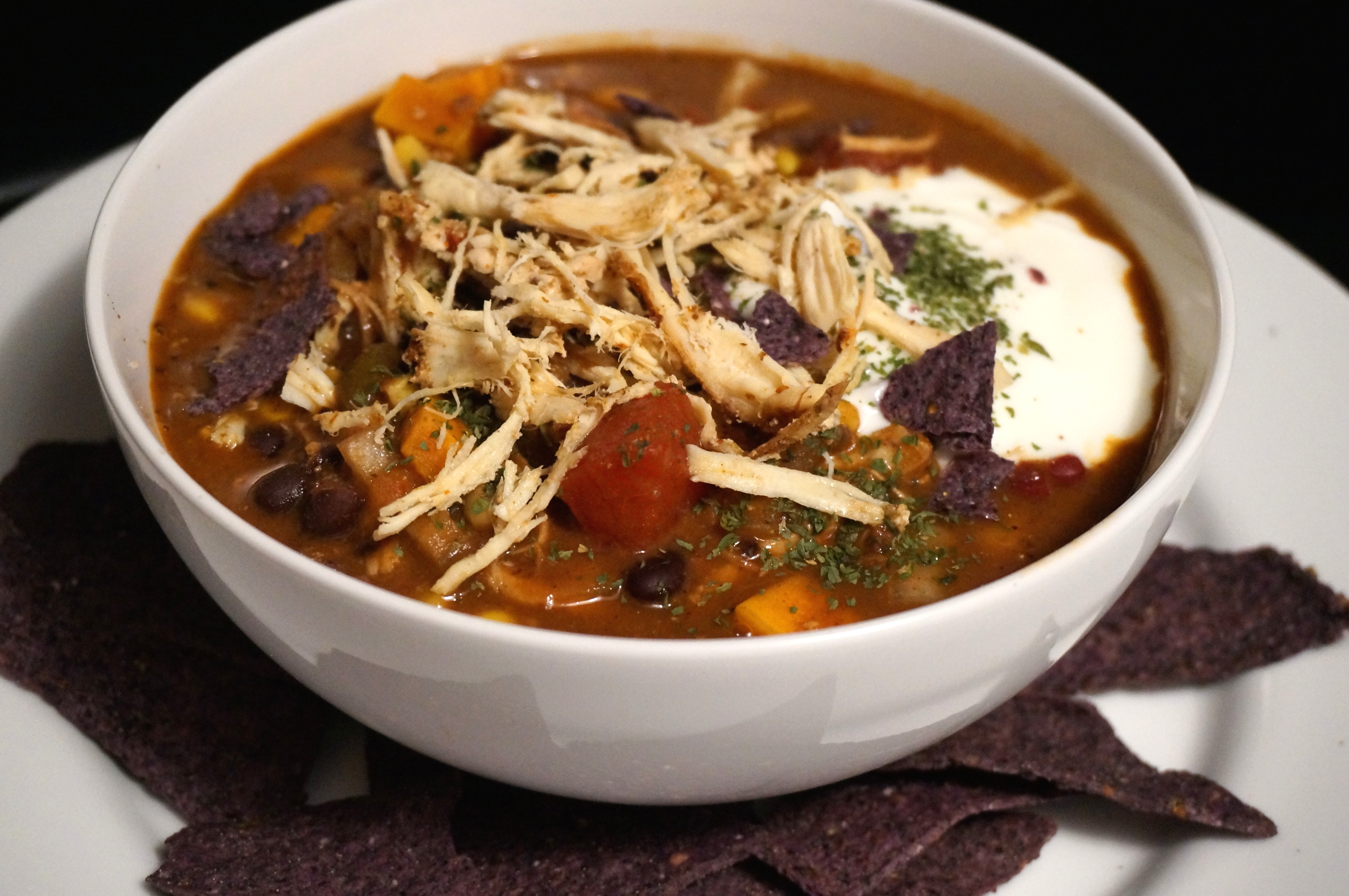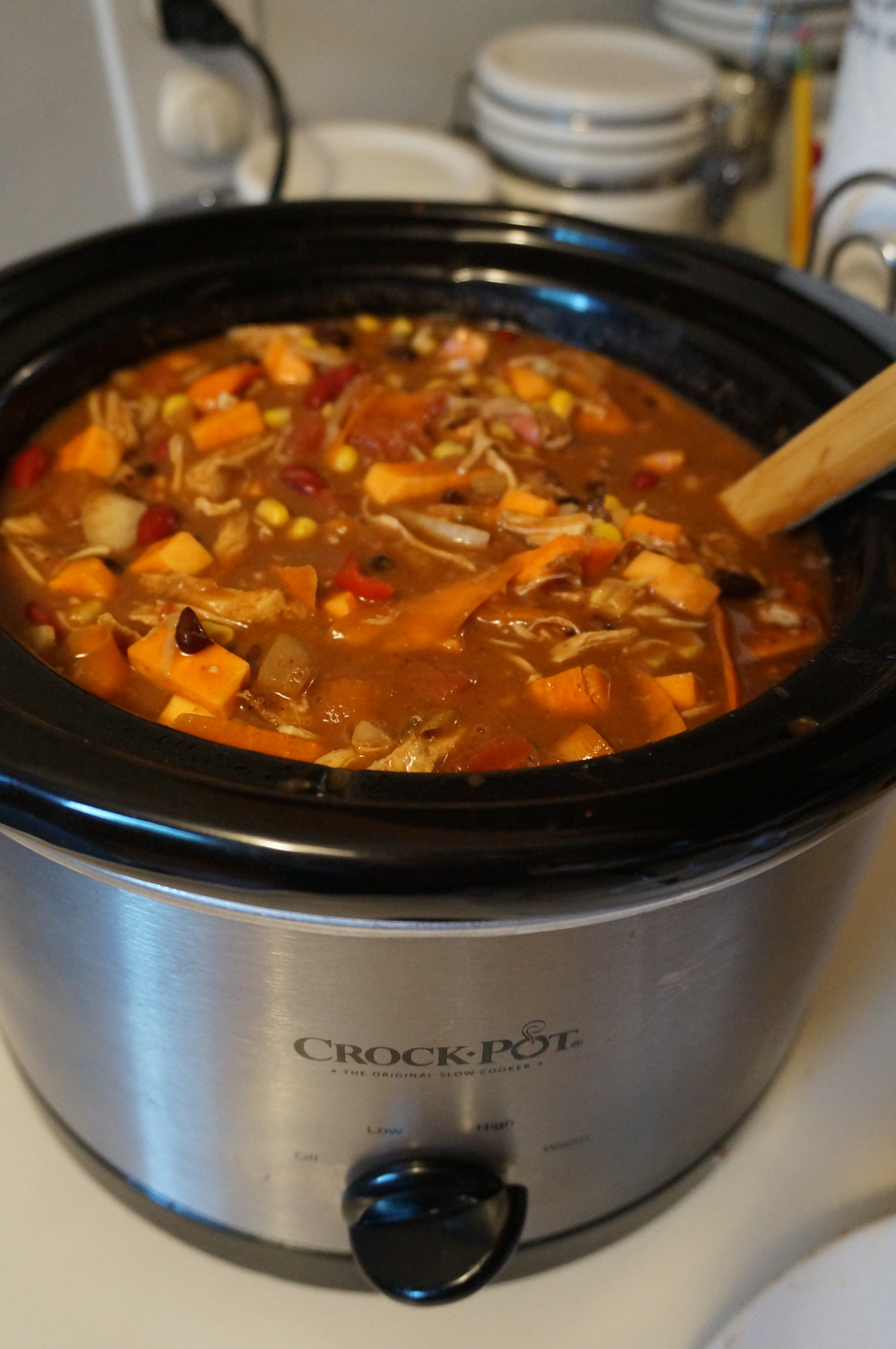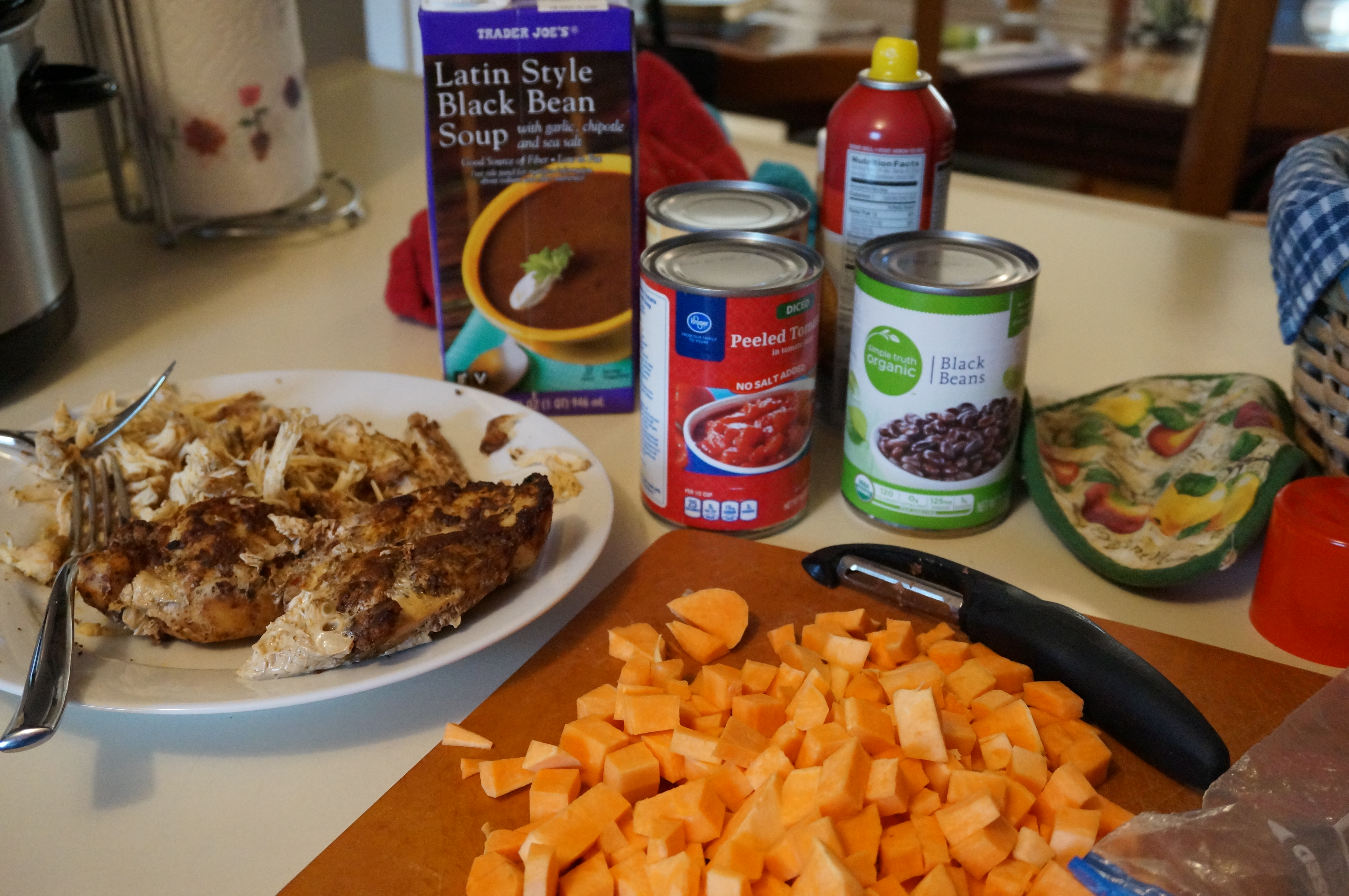 And so, my dear friends, tonight I bring you the last mash-up meal, created entirely from things already on hand. Crock Pot Black Bean and Sweet Potato Chili! This is a similar recipe to the one I made last fall, that all of you kept telling me you were planning on making, except that I had to make a few changes because we didn’t have everything I used in it last time. We only had one onion and one sweet potato left this time around, only 1 can of tomatoes and black beans, no cheese for topping, and no chicken sausage. Instead, I used regular frozen chicken breasts, on which I rubbed some mole seasoning before letting them thaw in the refrigerator for the morning; a little less cocoa powder; a little more cinnamon; about 1 tsp each of chili powder, garlic powder, minced garlic, and cumin; a pinch of nutmeg and cayenne pepper, and some hot pepper flakes. Yes, I am aware that I can at times go spice-crazy. I also added the last of the carrots we had, and the end of the frozen peppers and onions blend. Finally, since we were a bit short on tomatoes, I dumped in the remainder (about a half-jar) of salsa for some extra juice. The real key here is that I kept the Latin Style Black Bean Soup base from Trader Joe’s, which really does “make” this stew, whether or not some of the other ingredients are there too.