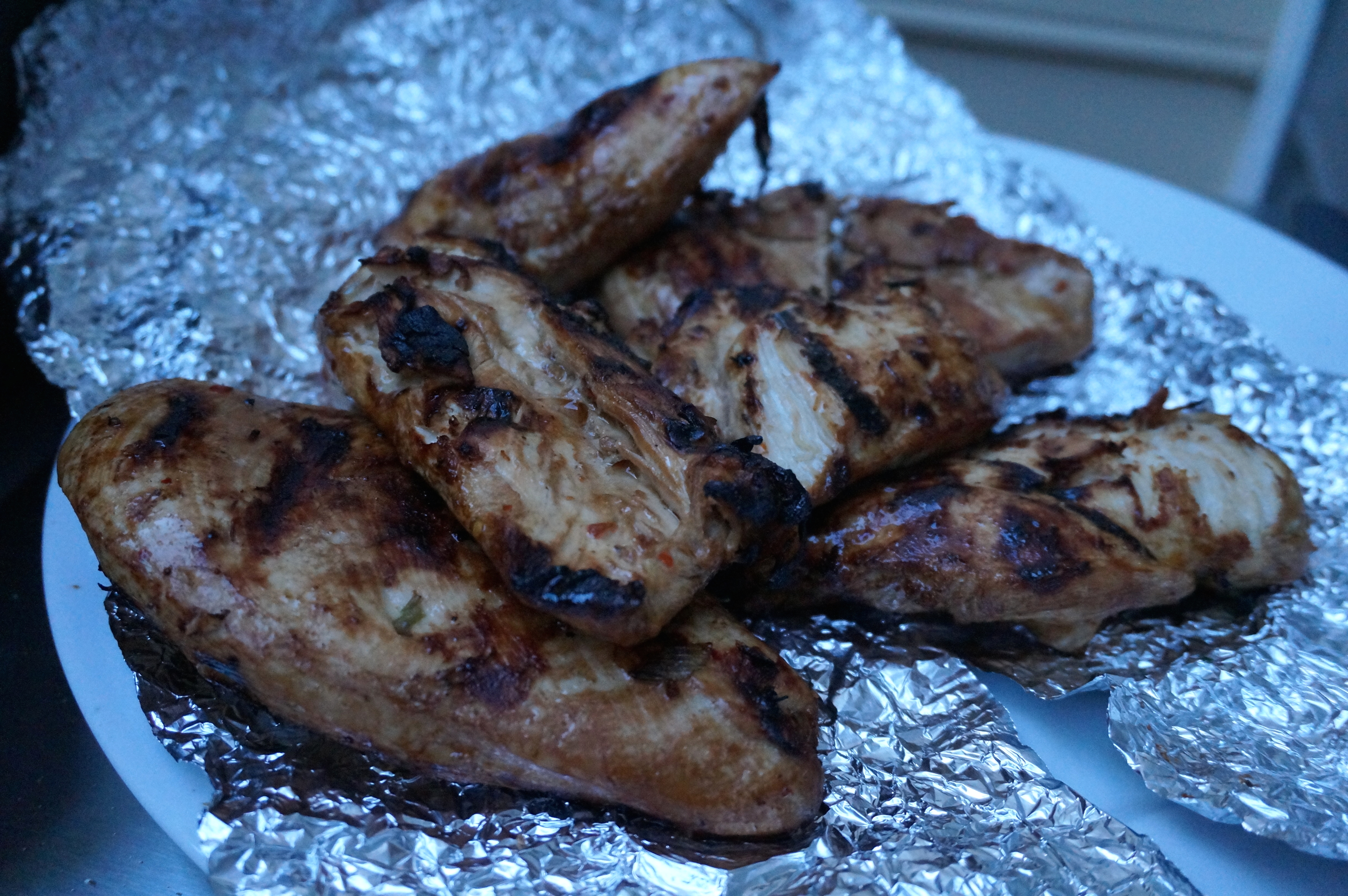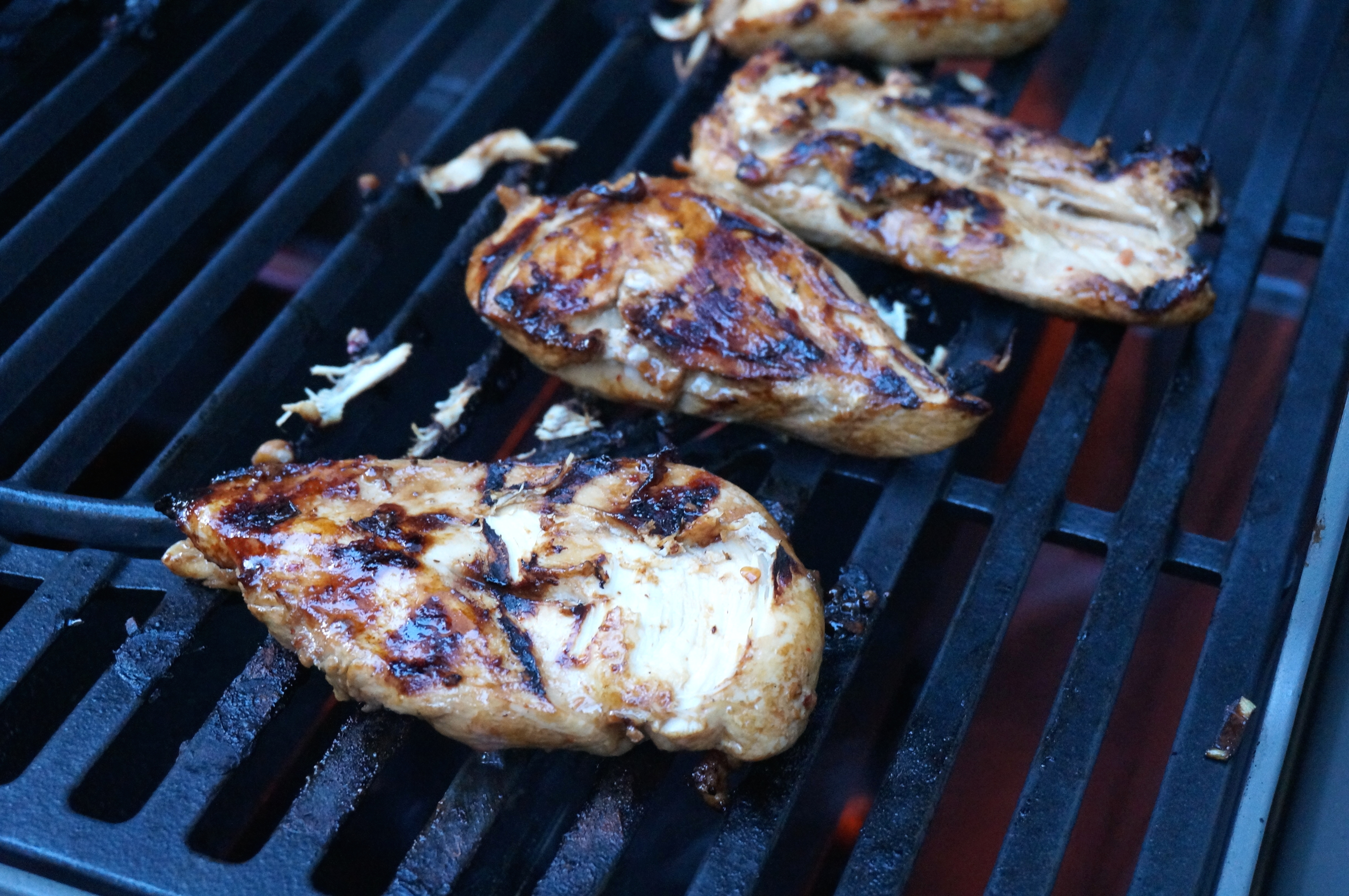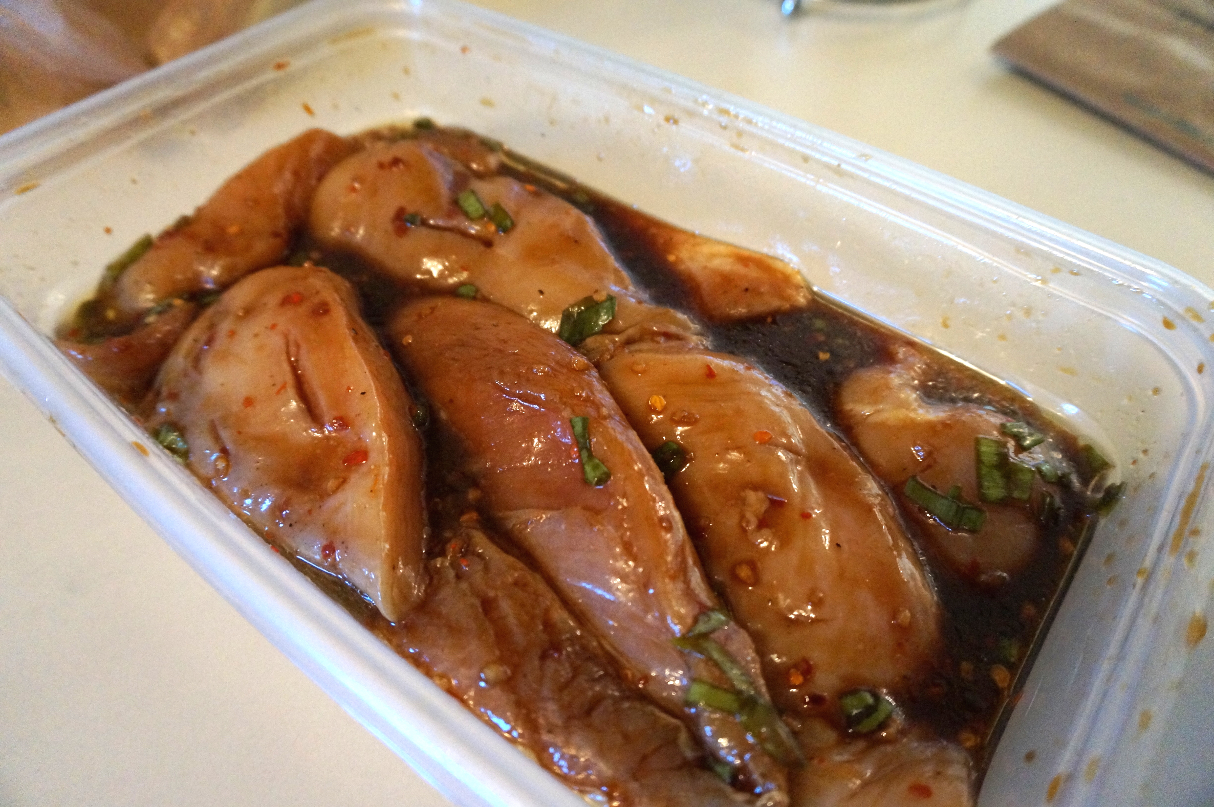 - Mix together all ingredients for marinade in a large tupperware container. Wedge the chicken breasts into container and marinate in refrigerator for two to three hours.