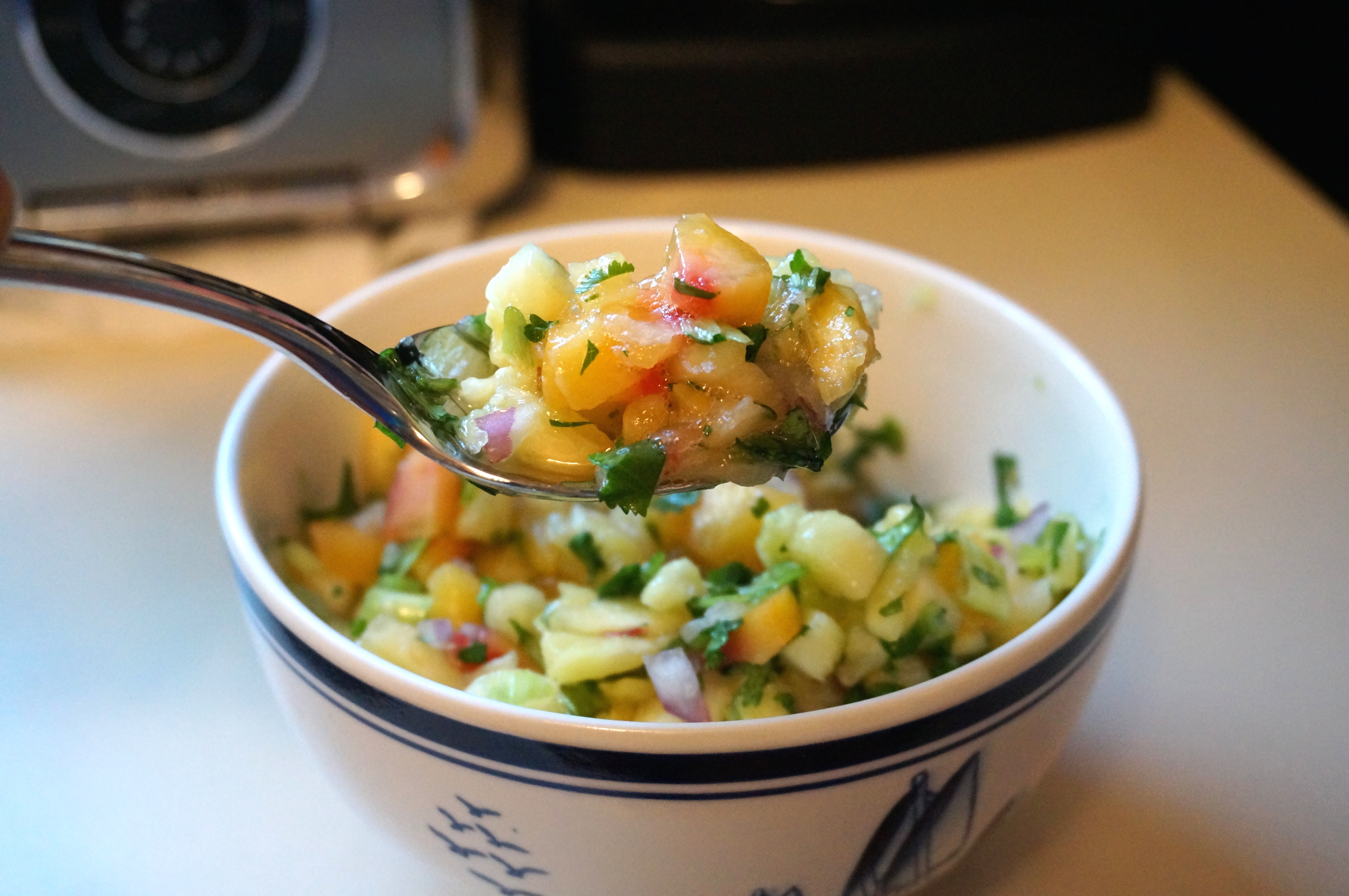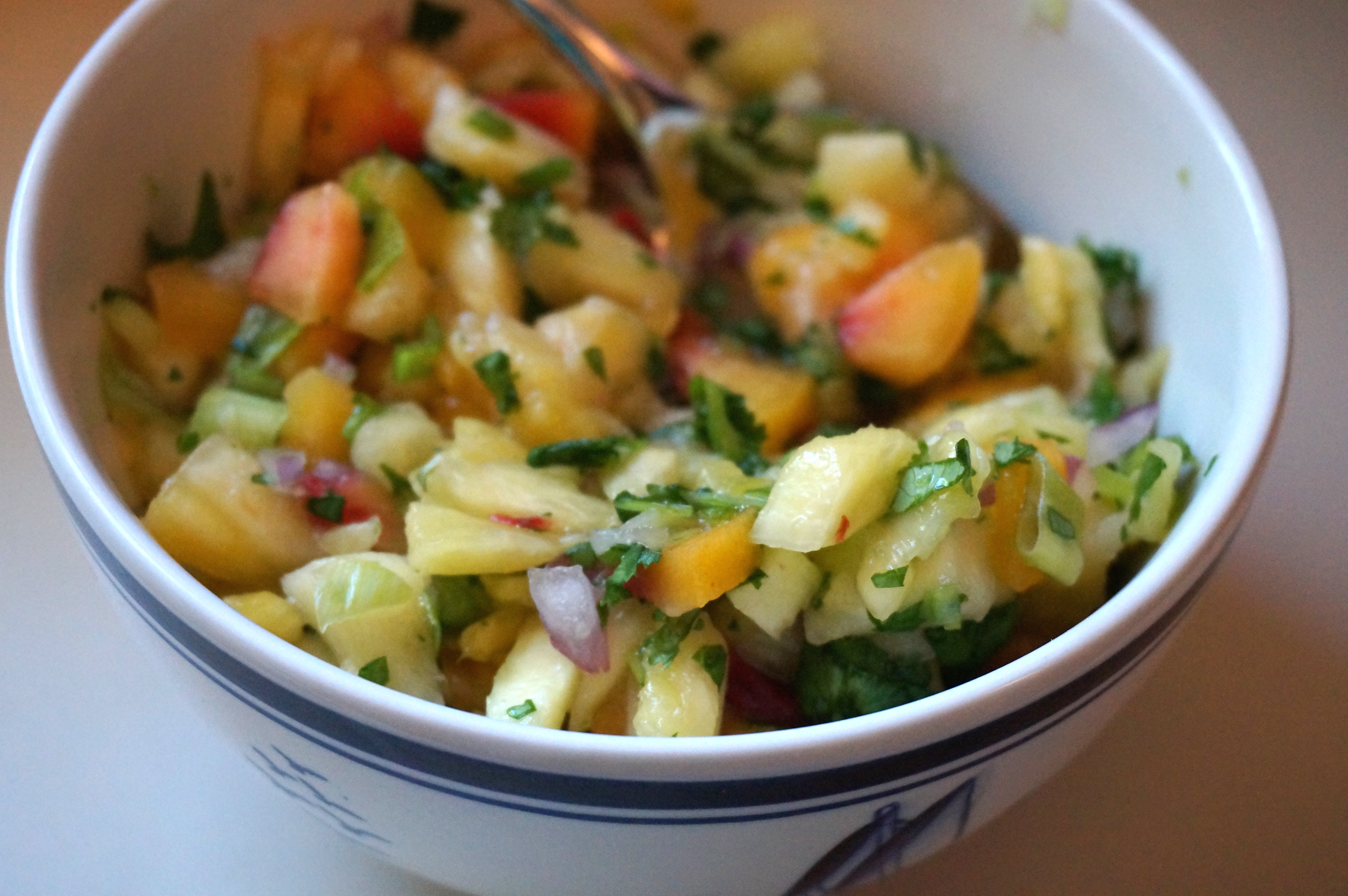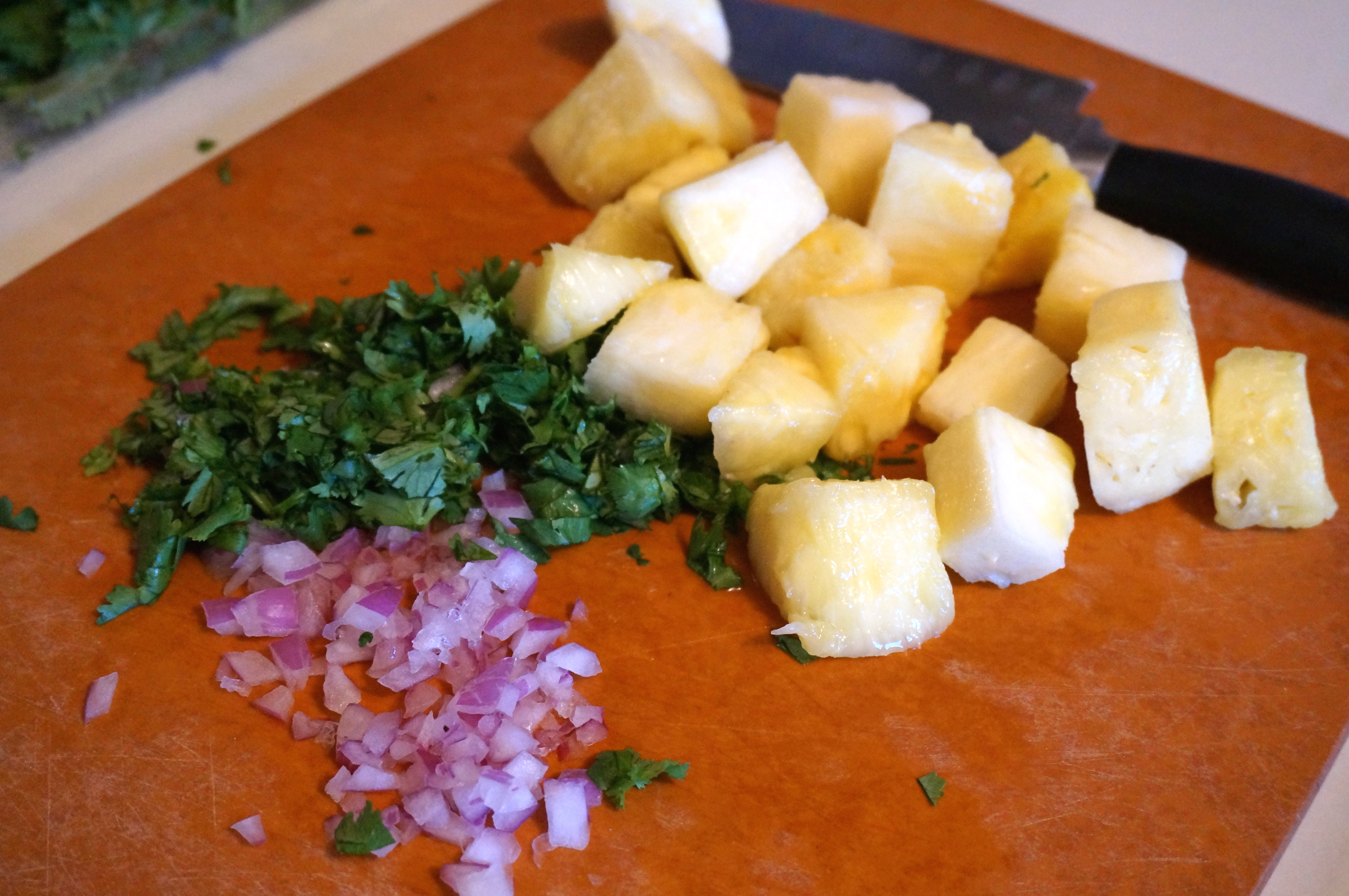 - Meanwhile, prepare salsa by chopping up pineapple, onion, cilantro, peaches, and green onion. Mix together in a bowl and add the lime juice and salt. Cover and refrigerate until ready to serve.