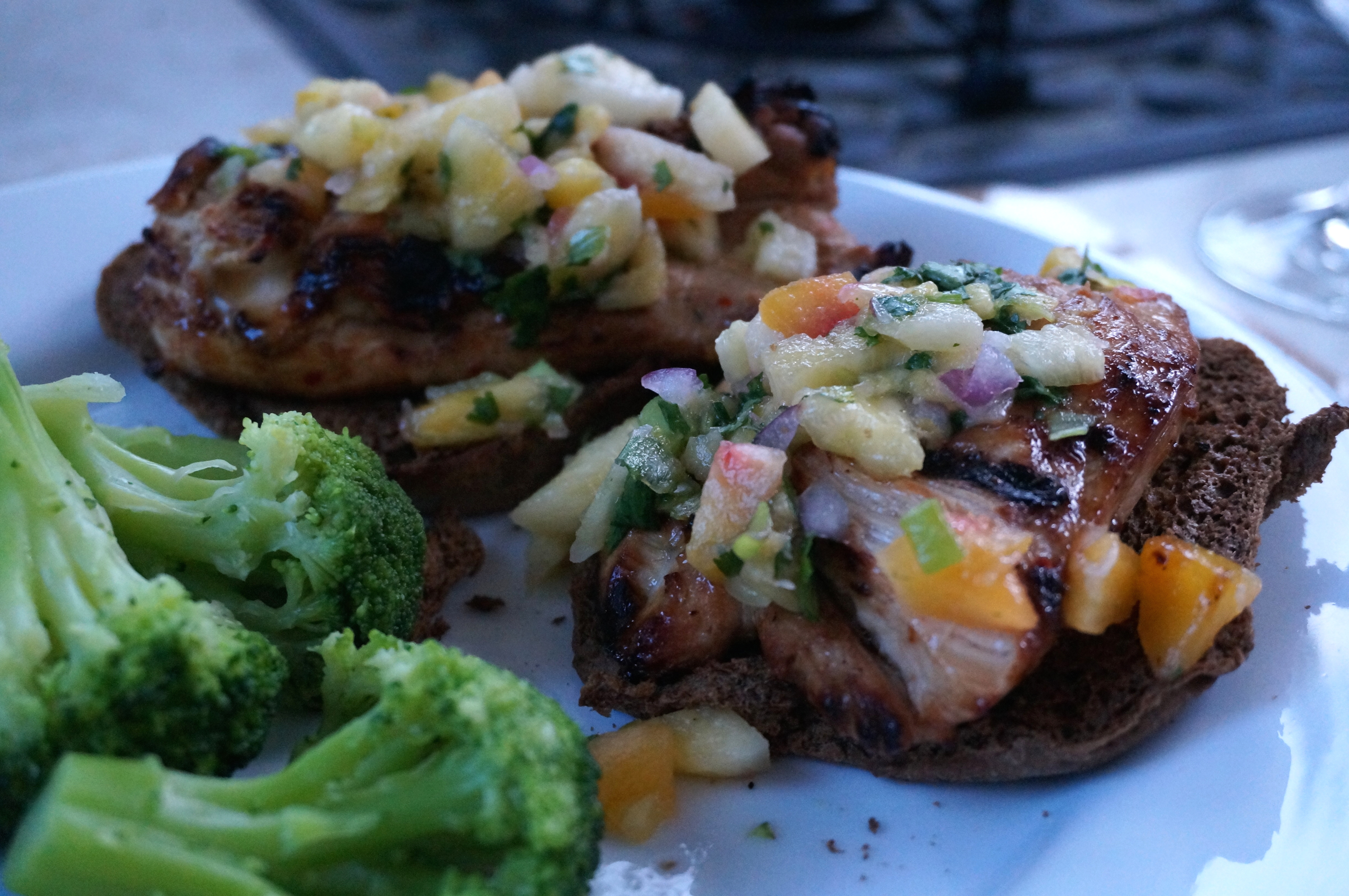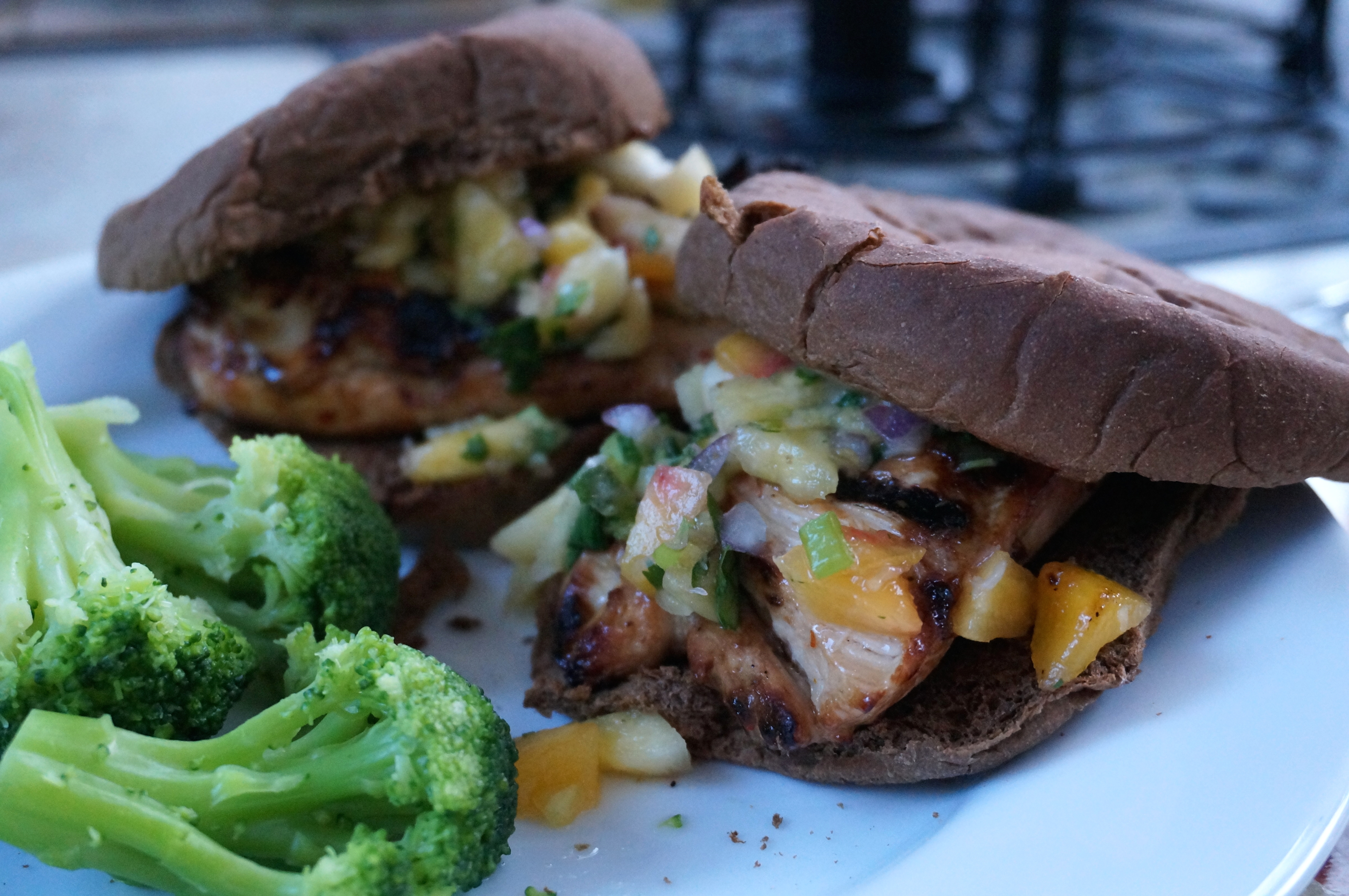 Top with pineapple salsa and serve on a bun with broc on the side 🙂