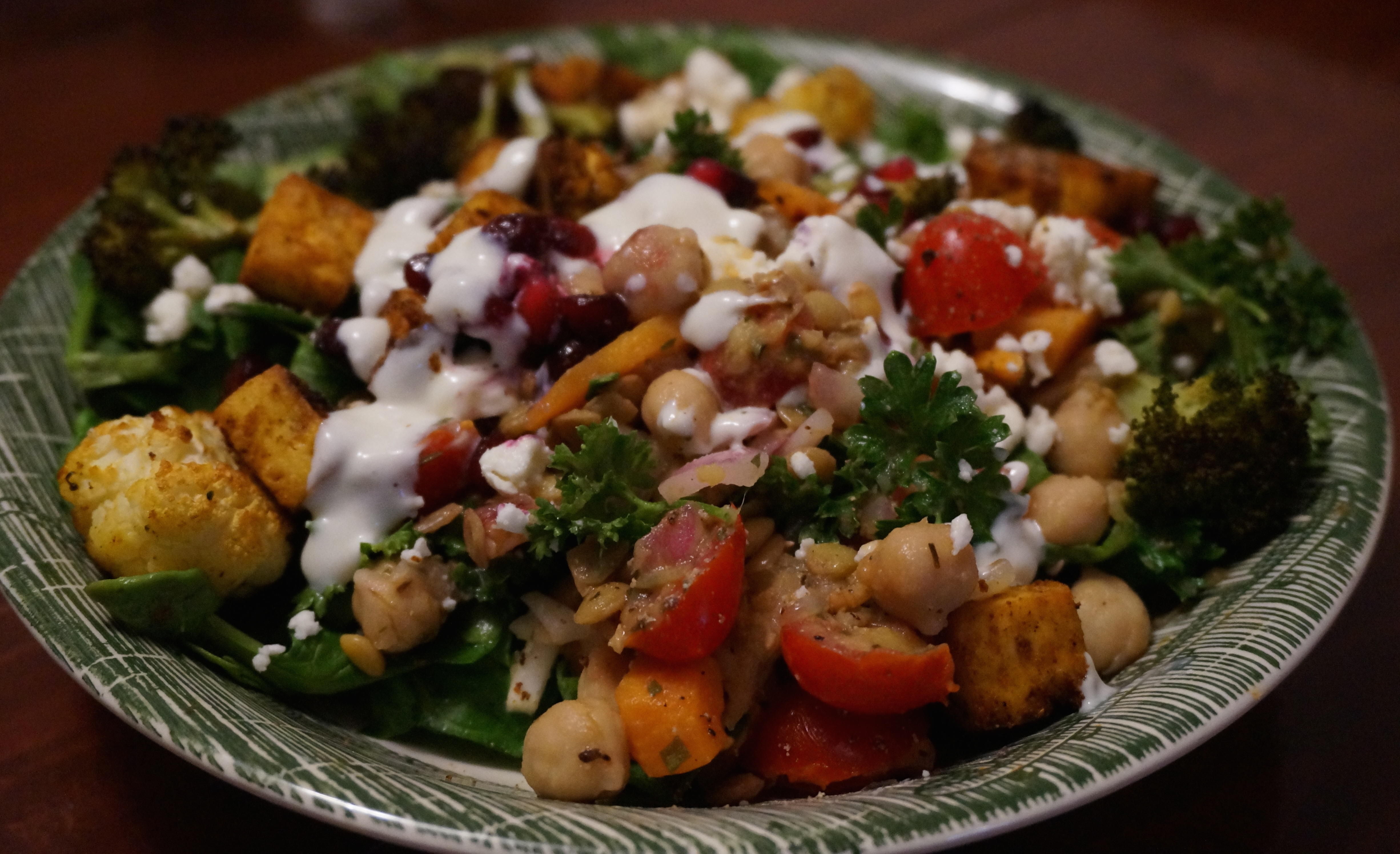 Here’s a fun update to my Chickpea Lentil Power Salad! I decided that instead of my normal fried egg to go on top as my “meatless protein,” I’d experiment with a curry marinade and drizzle it with some orange yogurt sauce! A delicious variation to this power salad!
