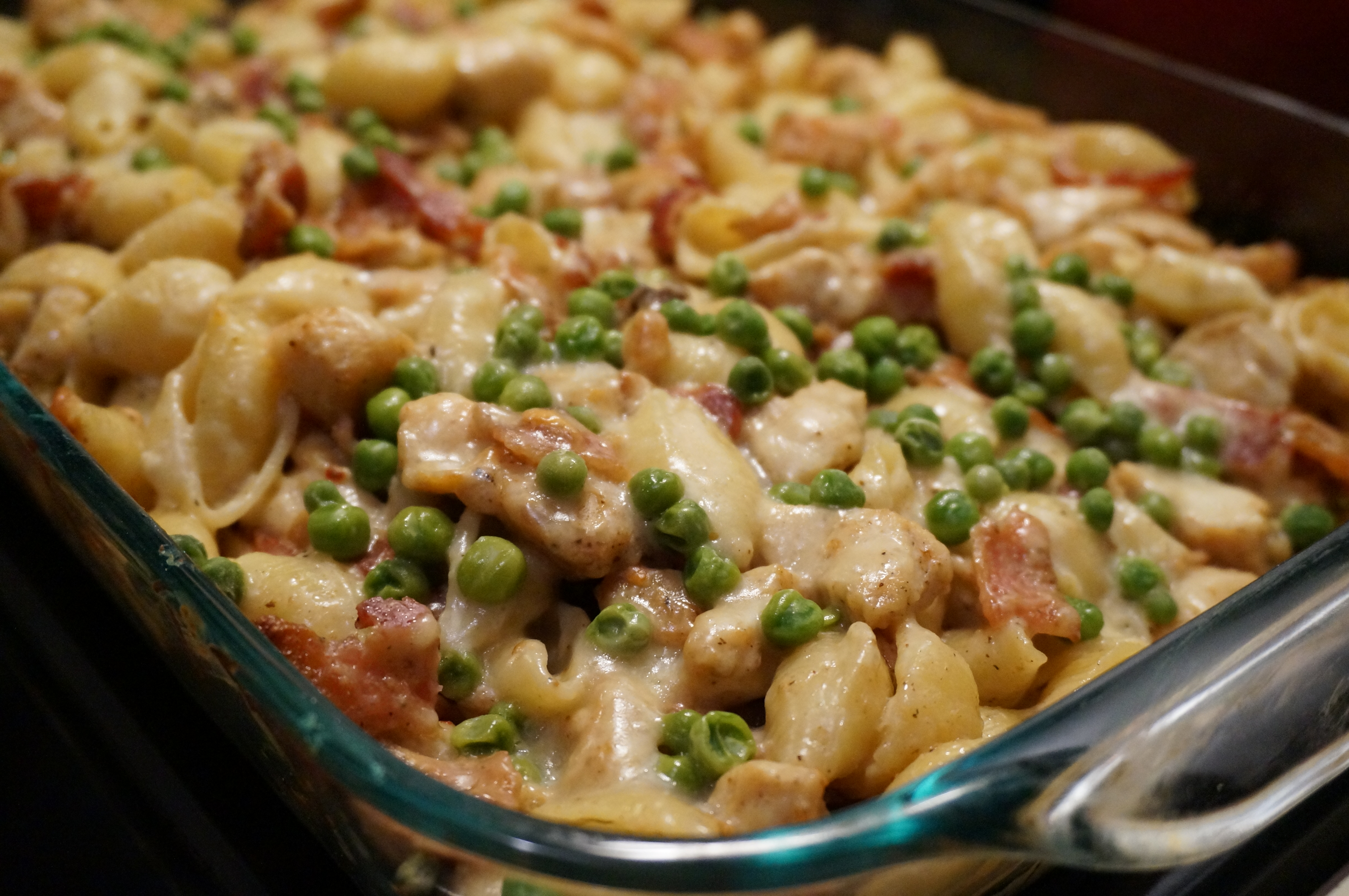 For all you cheese-loving, bacon-craving, mac n’ cheese worshiping picnic-goers out there, here’s a perfect dish that you can bring along to your next potluck! Perfect as a side, but also hearty enough to stand on its own! I chose shells for their sauce-soaking-up abilities, but you could also use any other type of pasta! (Isn’t it crazy how you SWEAR that different shapes taste differently?). Feel free to play with the cheese, too- I chose a mix of soft swiss and shredded “fancy blend,” but you could go with cheddar, cream cheese, gruyere, etc. to your little heart’s content! Originally this recipe used cubed ham instead of bacon (Chicken Cordon Bleu style), but I decided on the bacon to please the man in my life. 🙂 I had to throw a few peas on top (there had to be SOME sort of green in there!), inspired by the Cheesy Smashed Potatoes I made for Easter.