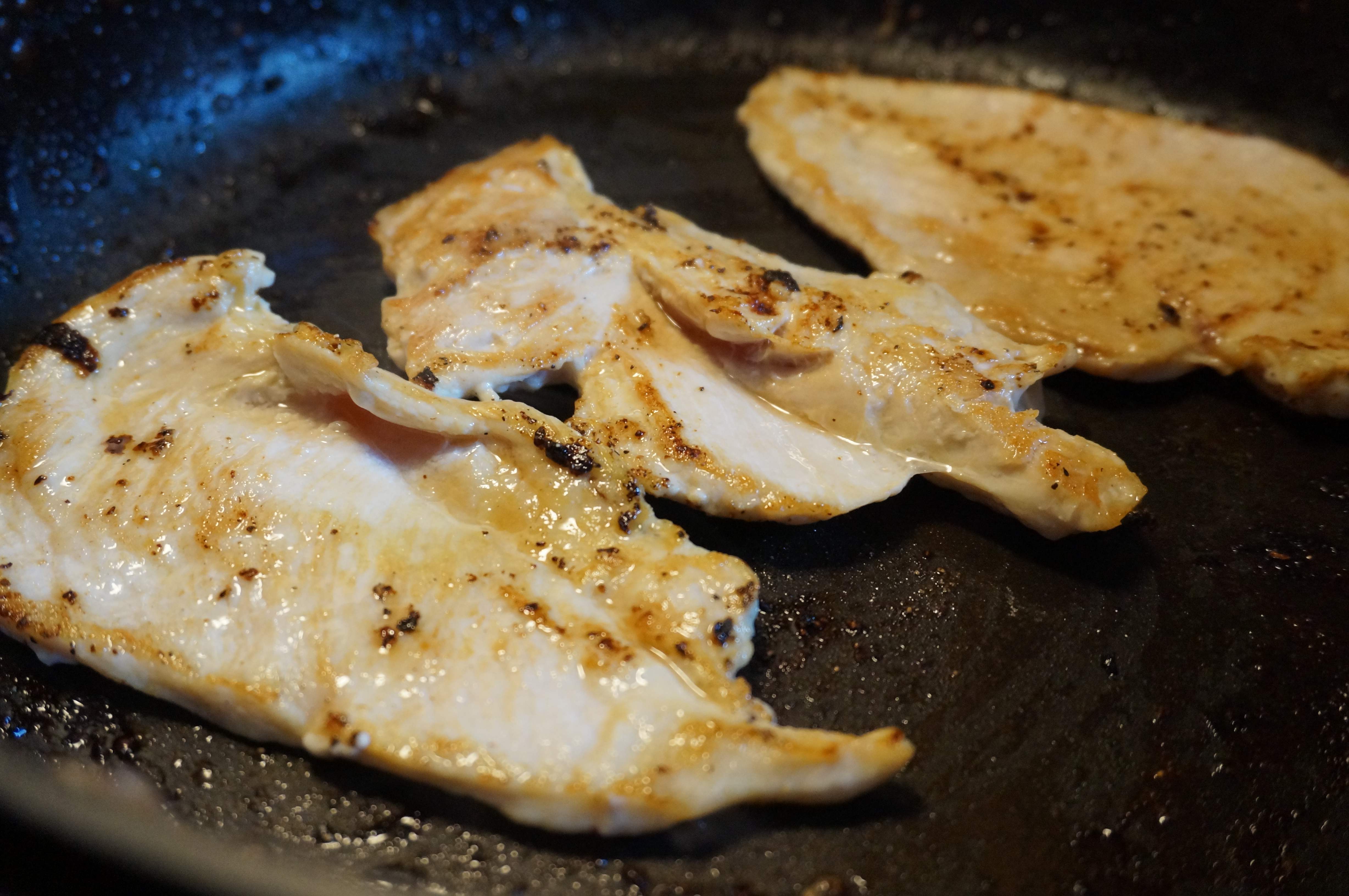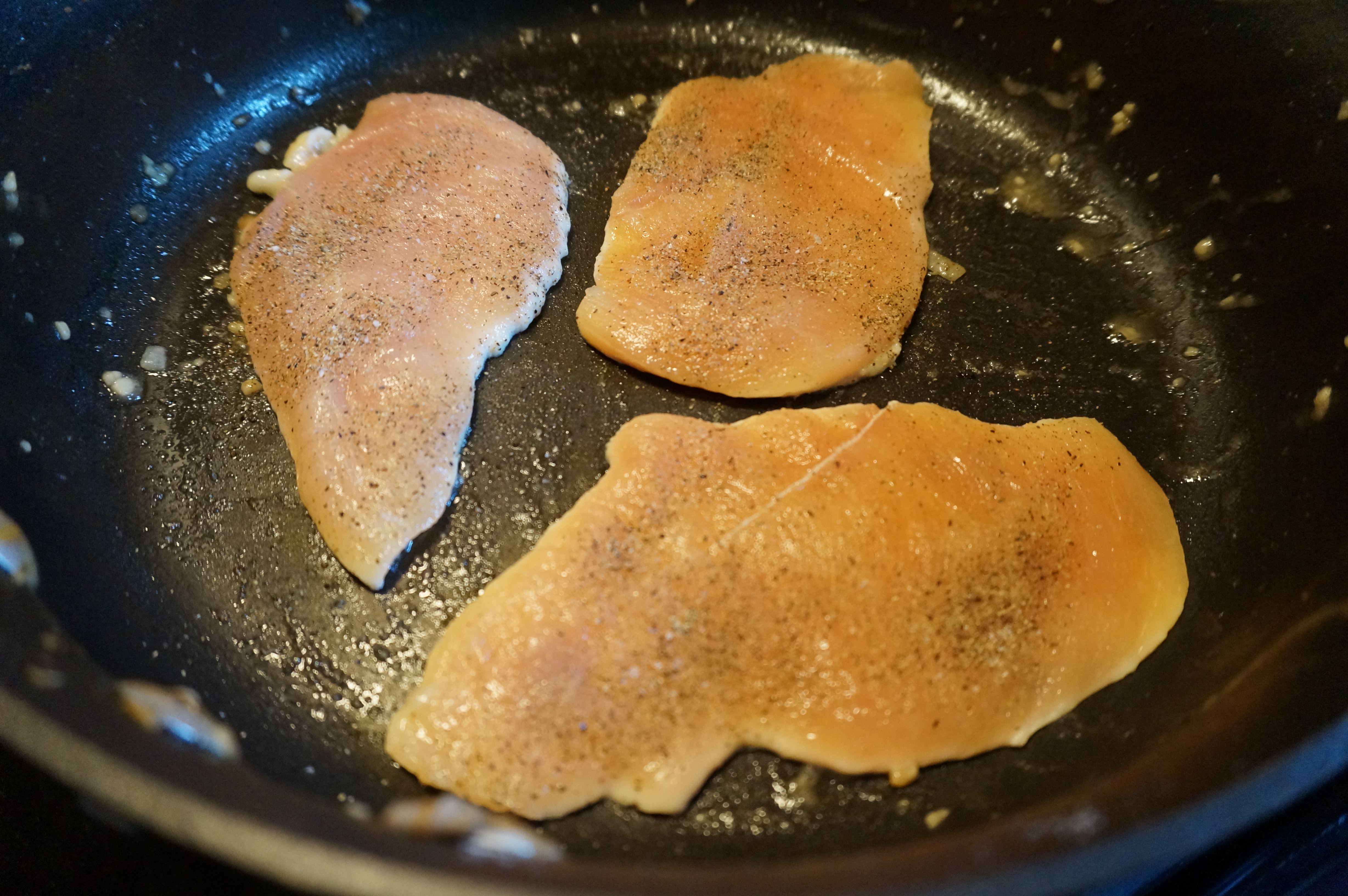 - Meanwhile, sprinkle chicken cutlets with salt and pepper. Add 1 tbsp remaining olive oil to skillet and cook on medium-high heat until browned on both sides, about 2 minutes. Remove from heat.