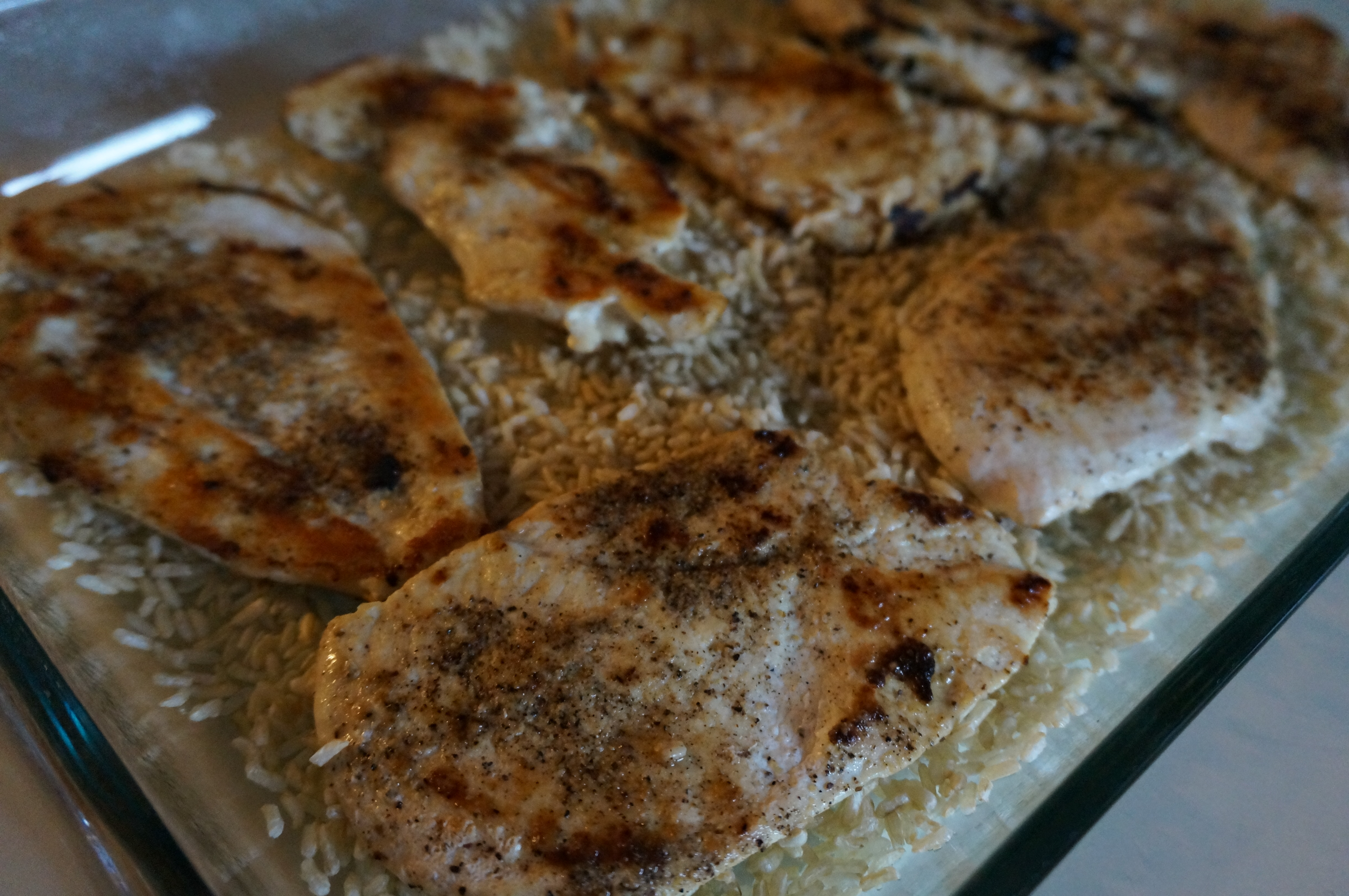 - In a 9×13 casserole dish sprayed with cooking spray, add rice in a thin layer. (It will stick to the pan, sort of like flouring a cake pan!)