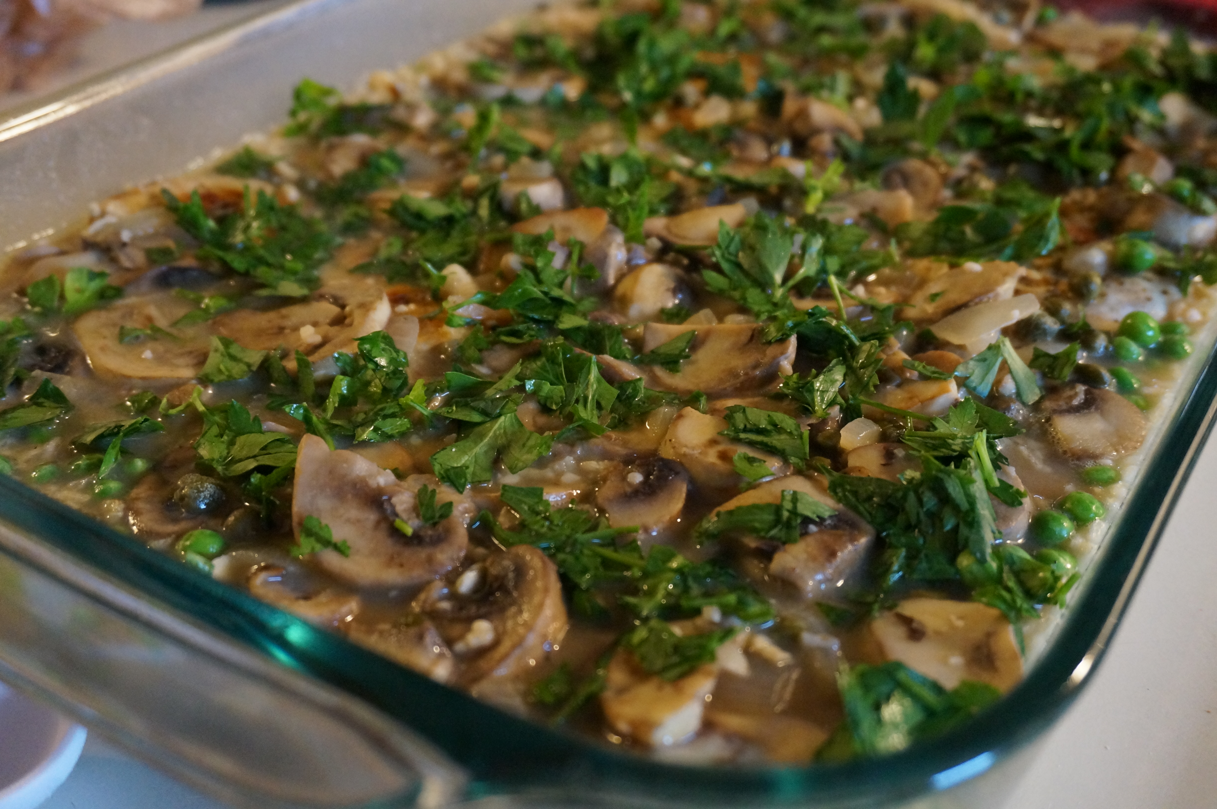 - Carefully pour the mushroom sauce over the top of the casserole. Sprinkle with parsley.