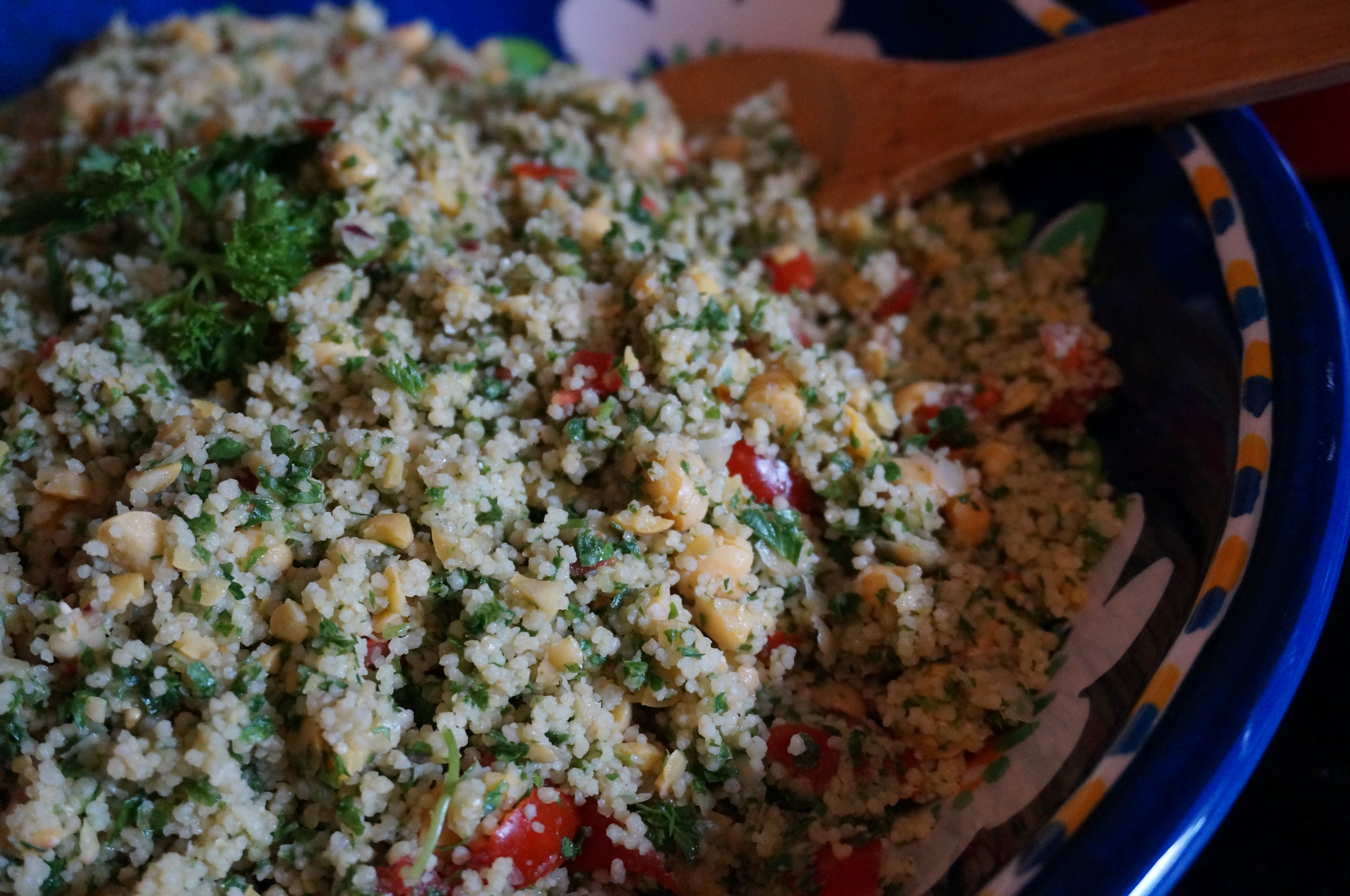 This recipe for tabbouleh could NOT be easier. I didn’t have to heat up a pot on the stove, chop any veggies, or deal with mushy, overcooked grains. With whole wheat couscous, all you have to do is add boiling water and let them sit for a few minutes before fluffing with a fork (anyone wonder why it’s called “fluffing” btw? A fork doesn’t exactly seem like a good “fluffer”).