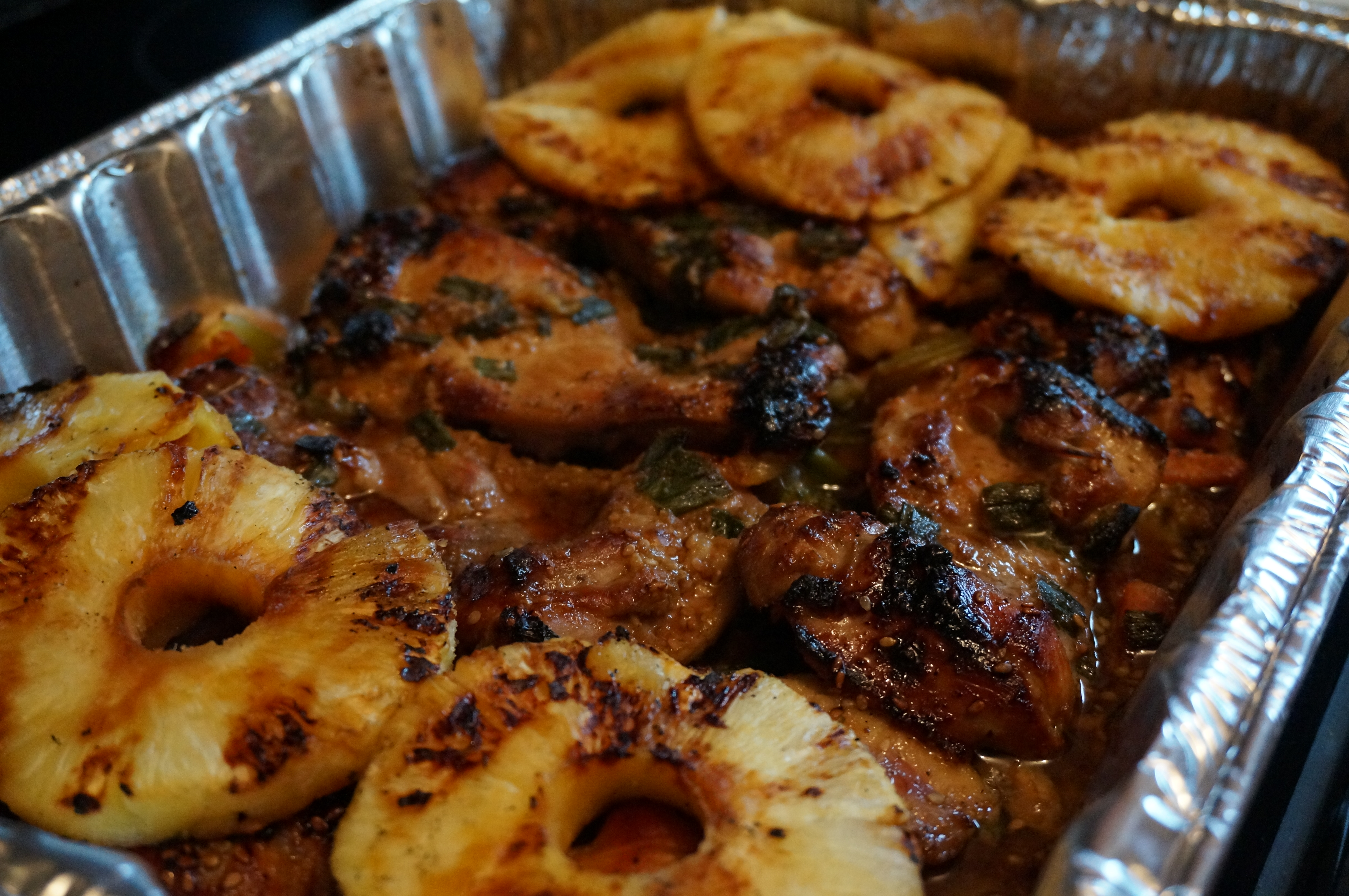 Do you love a good umami but prefer not to send yourself into that inevitable post-Chinese-take-out-MSG-coma that you always go into because you just can’t say no to that second third helping of General Tsao’s? I’ve created a recipe that allows you to indulge in the same meaty umami flavor with about an eighth of the calories, fat and sodium that your entree of sesame chicken would provide. I used chicken thighs to preserve the satisfaction factor and keep them moist, and then I covered them in a tangy but not too heavy marinade with just the right amount of spice. I baked, not fried, them, over regular frozen stir fry veggies with the reserved marinade, and for an extra burst of sweetness to balance out the spice, served with grilled pineapple over the top. (Besides, grilled fruit just looks pretty.)