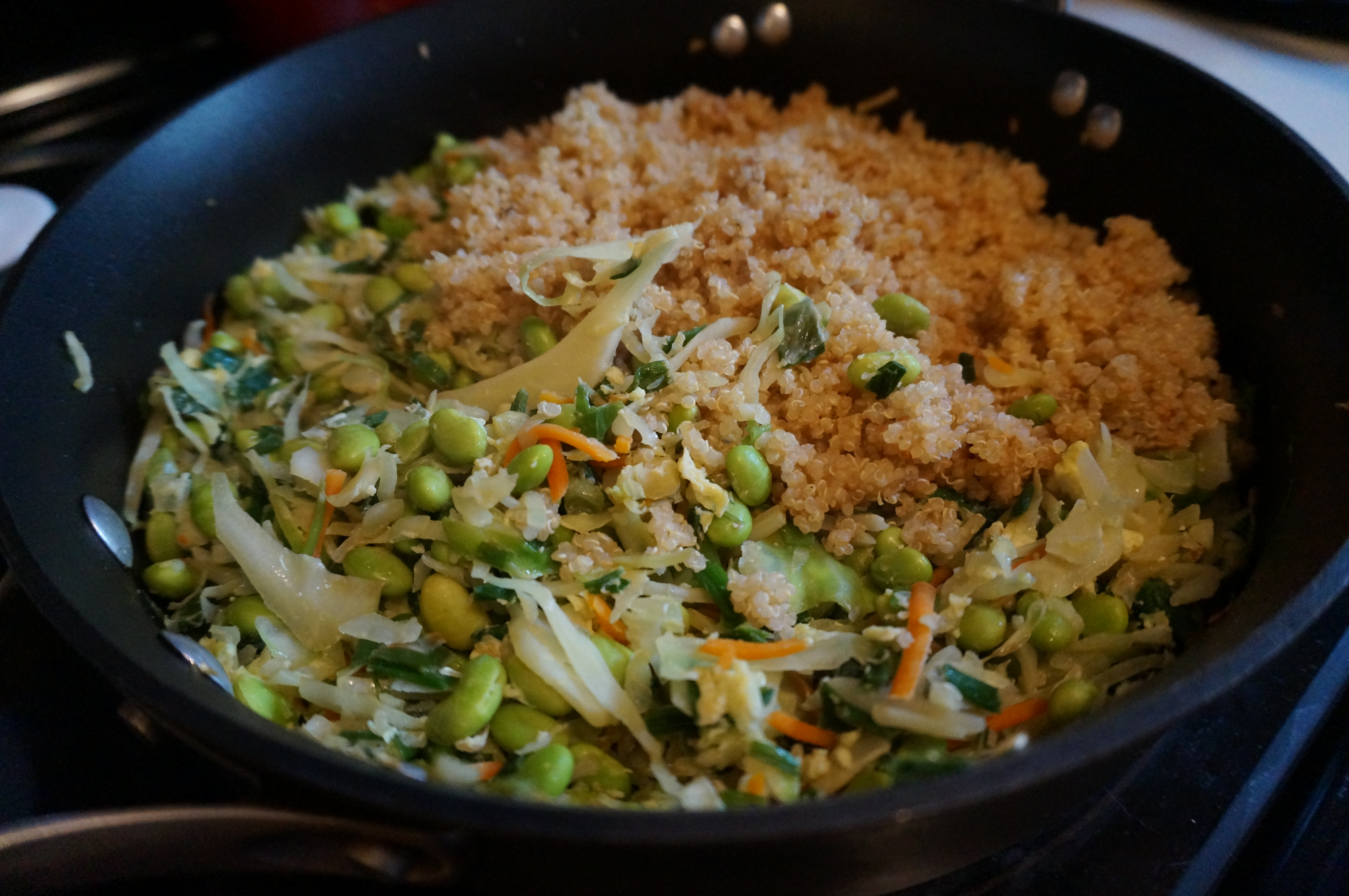Here’s a lightened up version of your traditional fried rice, this time using quinoa instead of white rice. I used a bag of Asian coleslaw mix and tossed in some frozen edamame before stir frying it all with a bunch of Asian spices. Serve with chopped peanuts over the top to give it a nice crunch! Can be eaten warm or chilled, and you can even drizzle a bit of the extra juice from my Sesame Teriyaki Chicken (previous recipe) to give it a bit more flavor. I served mine over a bed of spinach greens with some chicken and stir fry vegetables on the side!