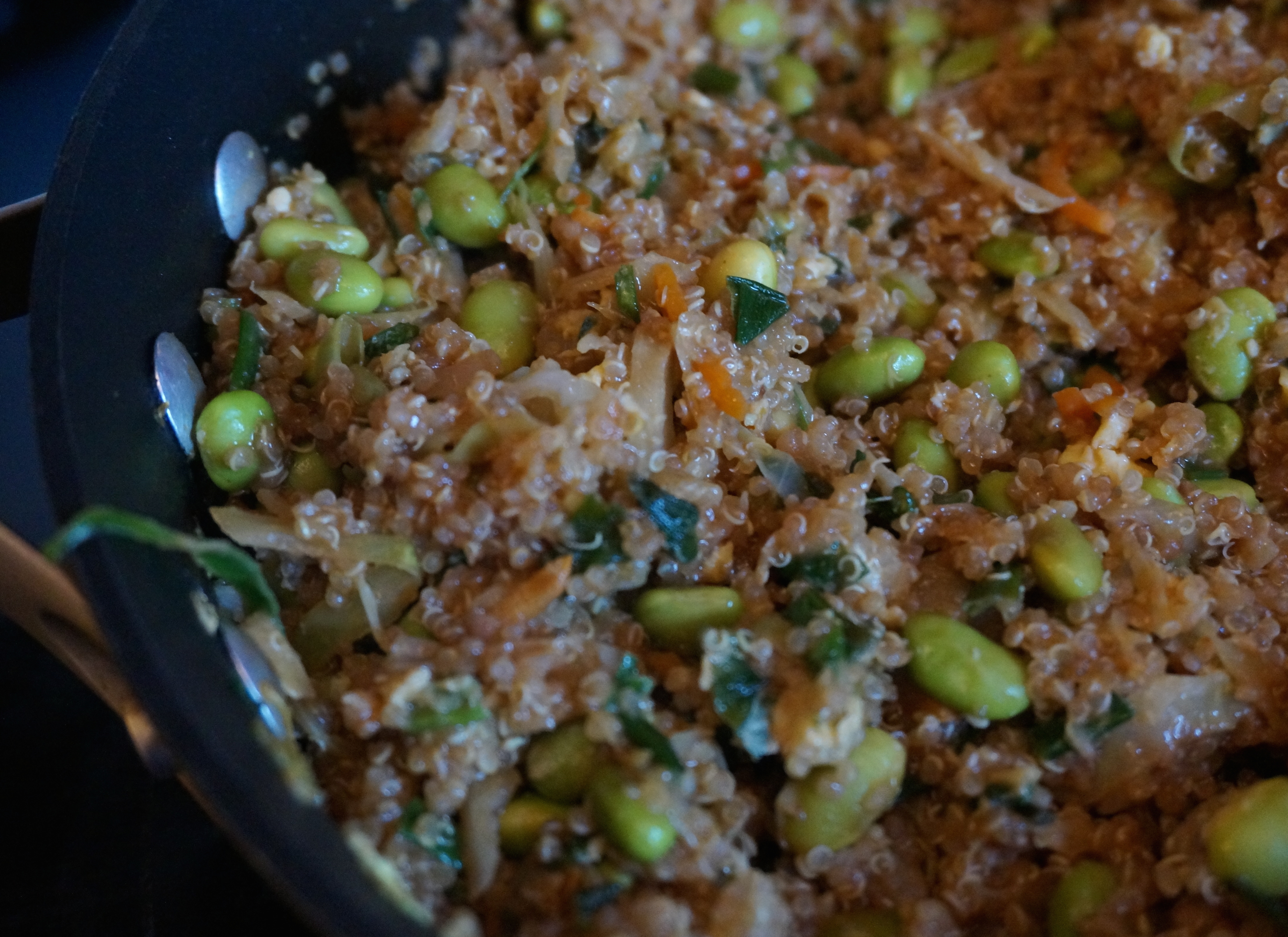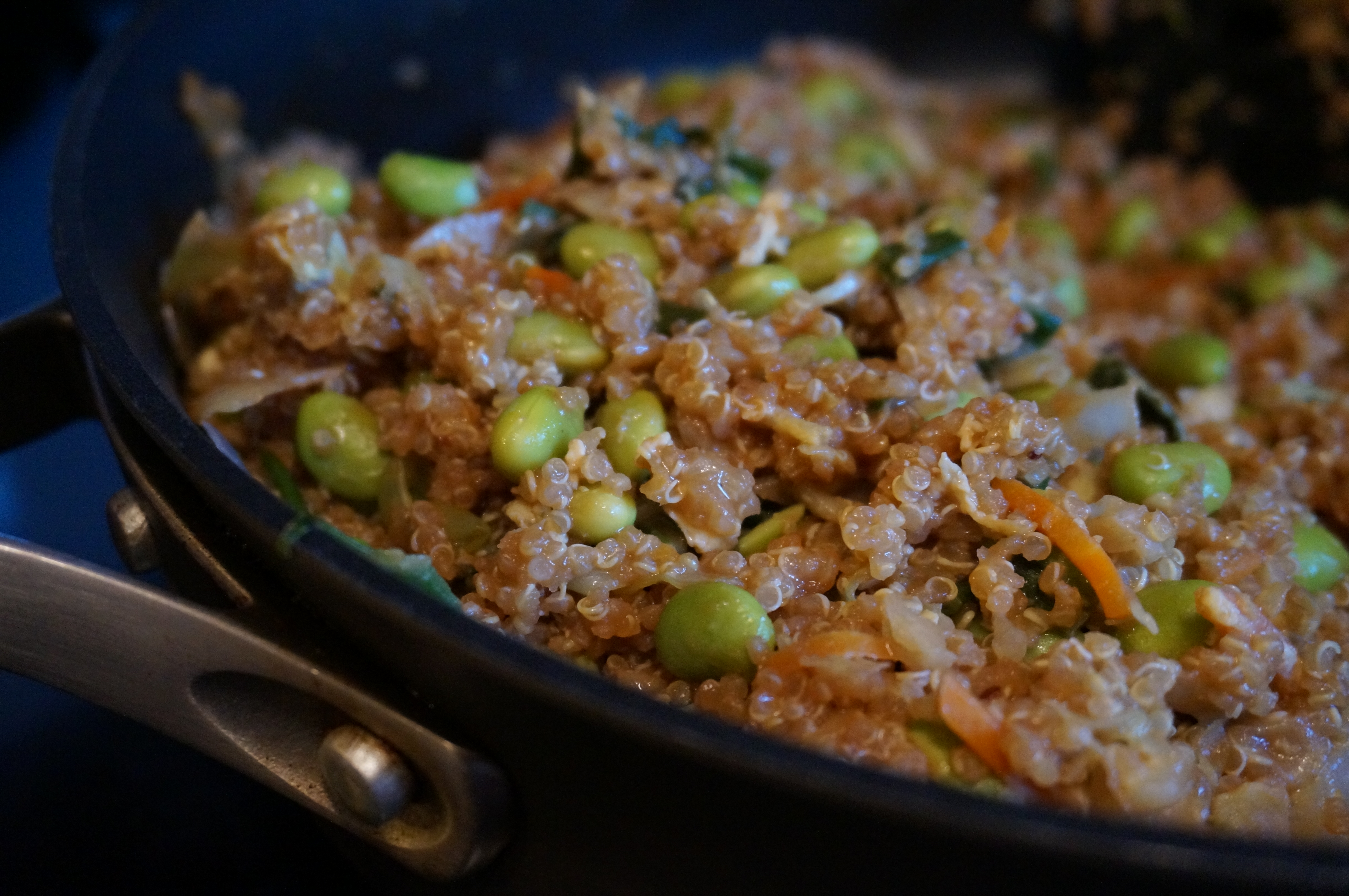 - Add cooked quinoa and sauce to the skillet and combine. Stir in half the peanuts and top with the other half right before serving!