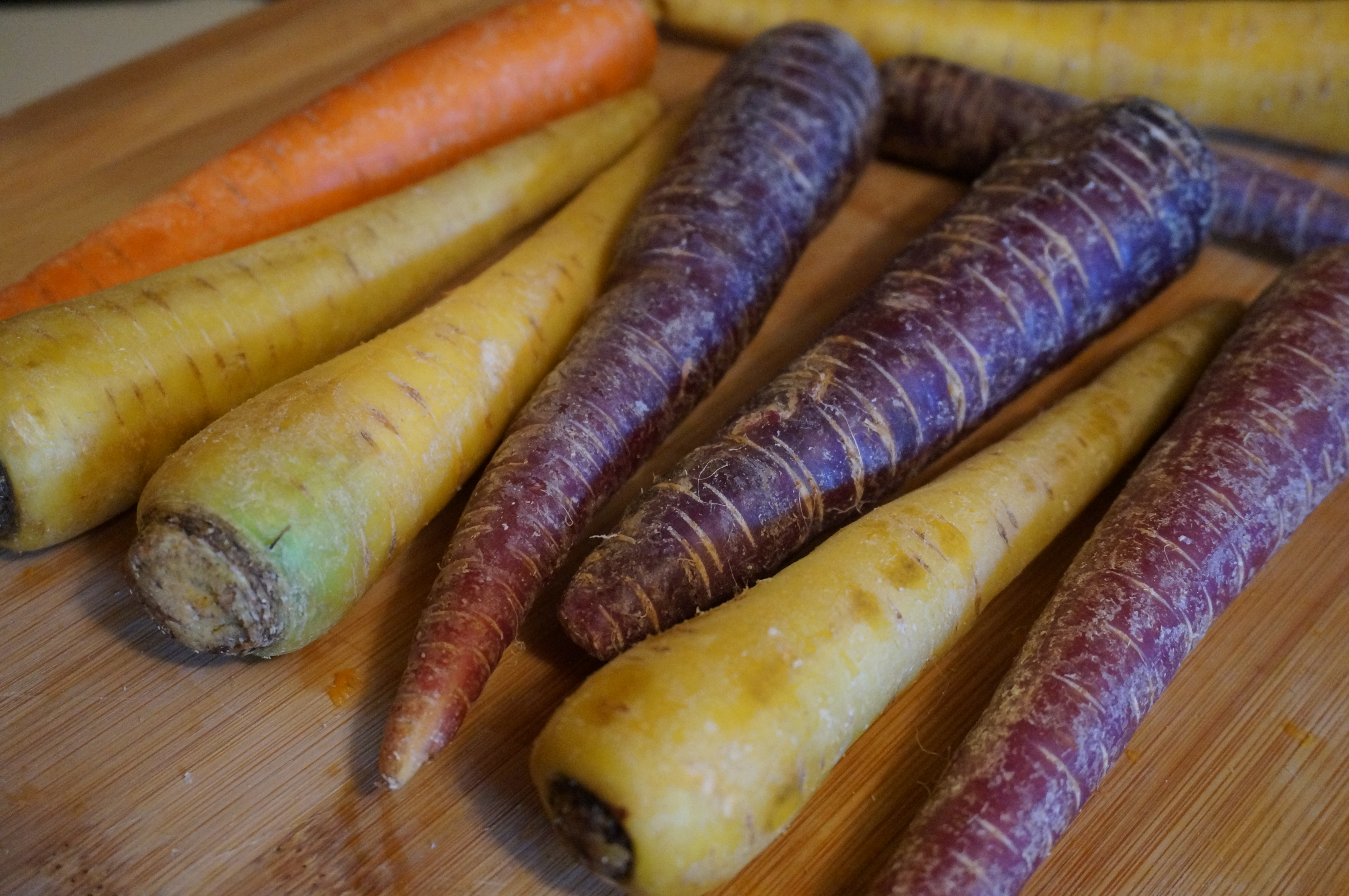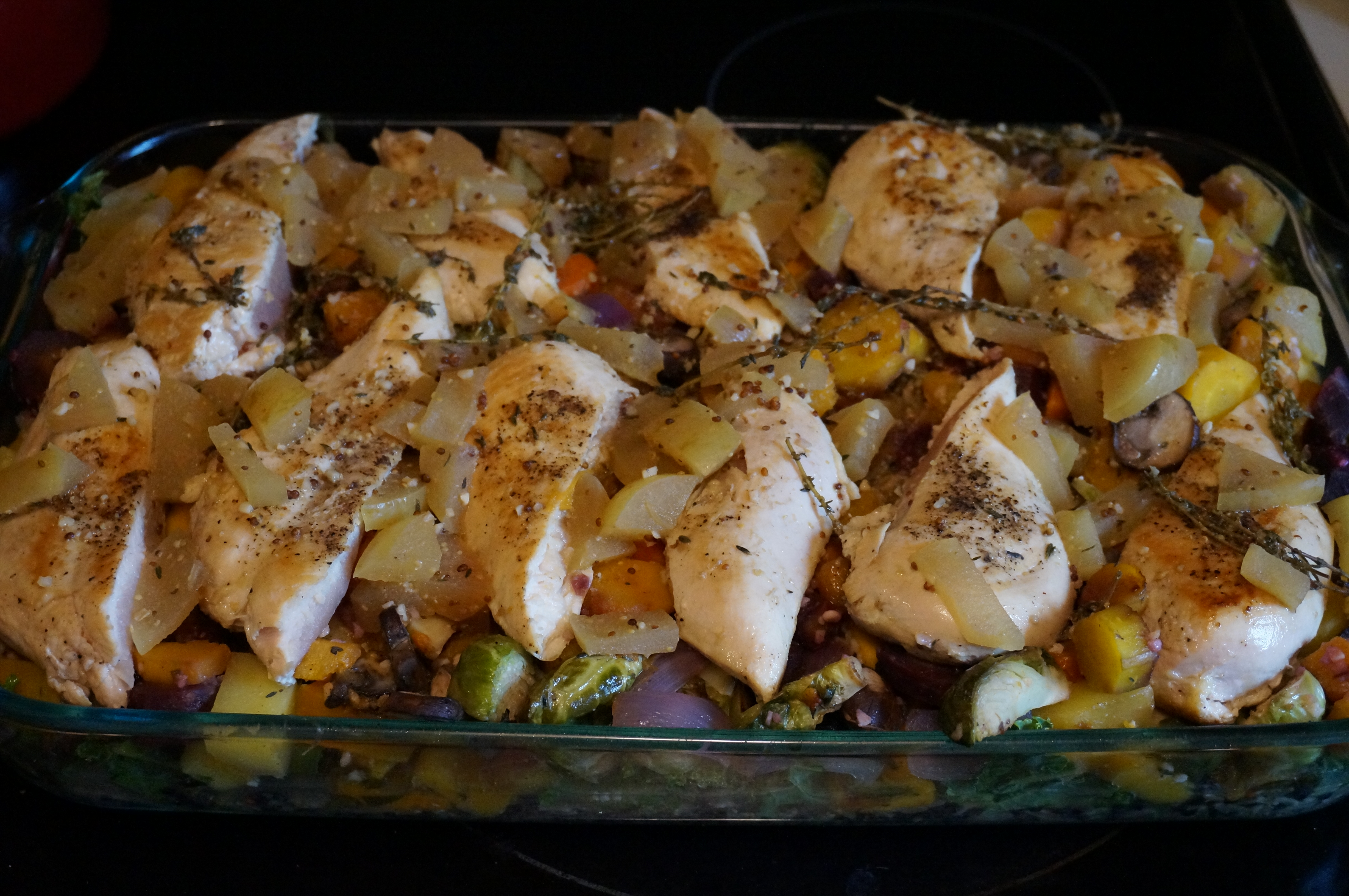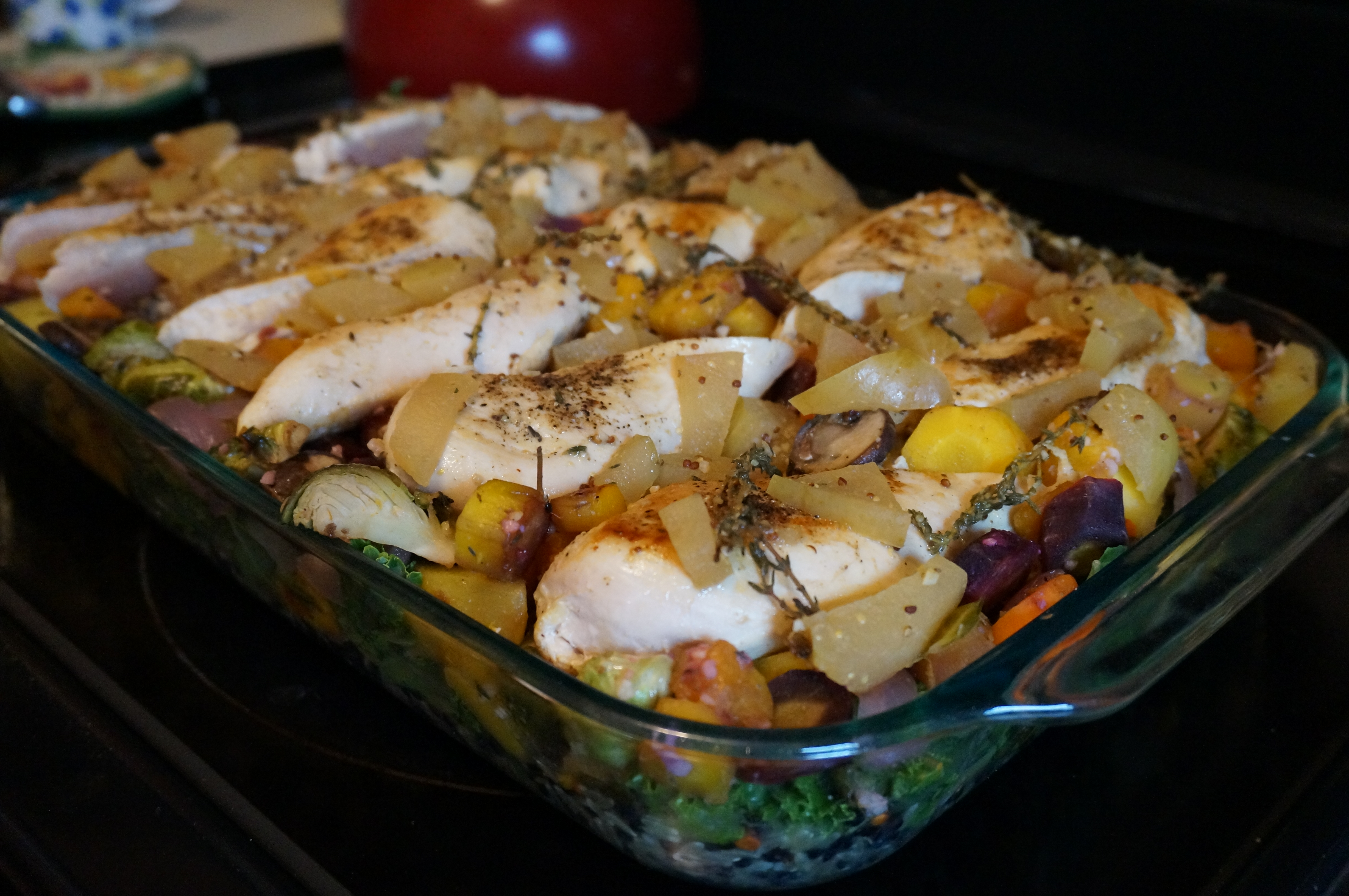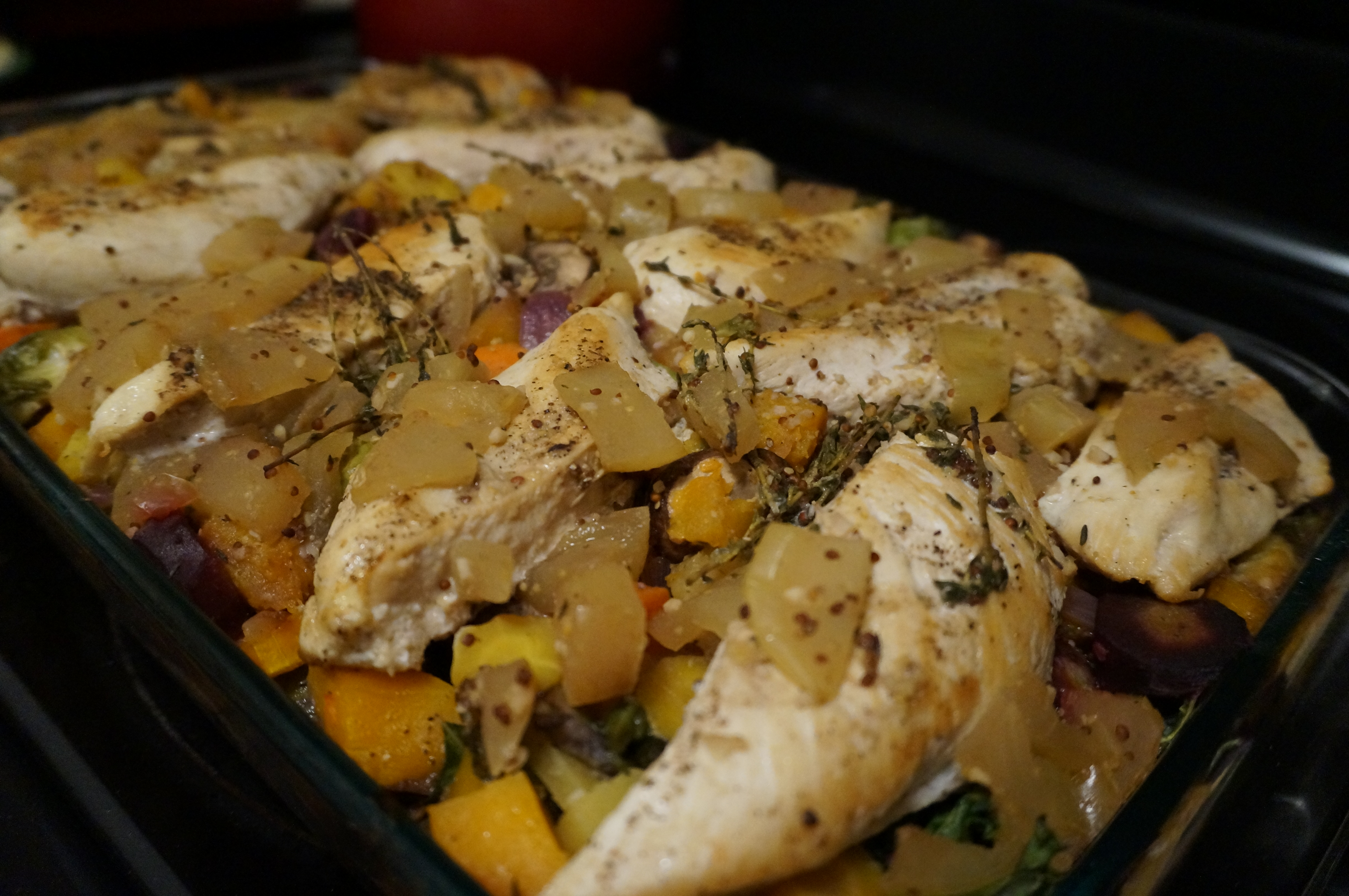 The result of my shopping trip was this roasted root vegetable medley, layered on top of a mixture of brown rice and lentils (inspired by my Chicken Marsala Rice Bake from a few months ago) chopped kale, and topped with chicken breasts and dijon apple cider sauce. I infused a few sprigs of fresh thyme into the cider sauce, as well as into the roasted veggies, to give it a little more harvest flavor.