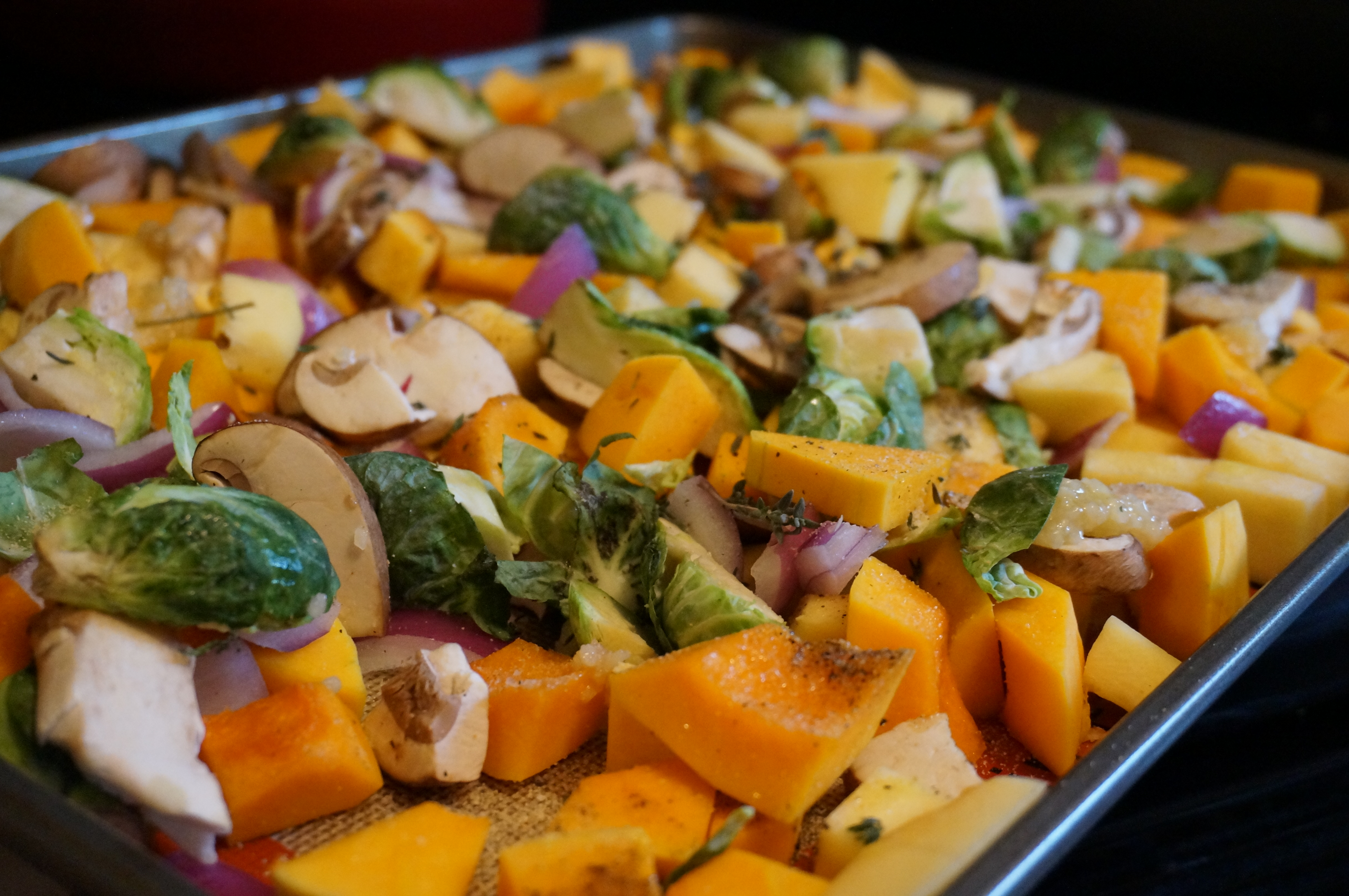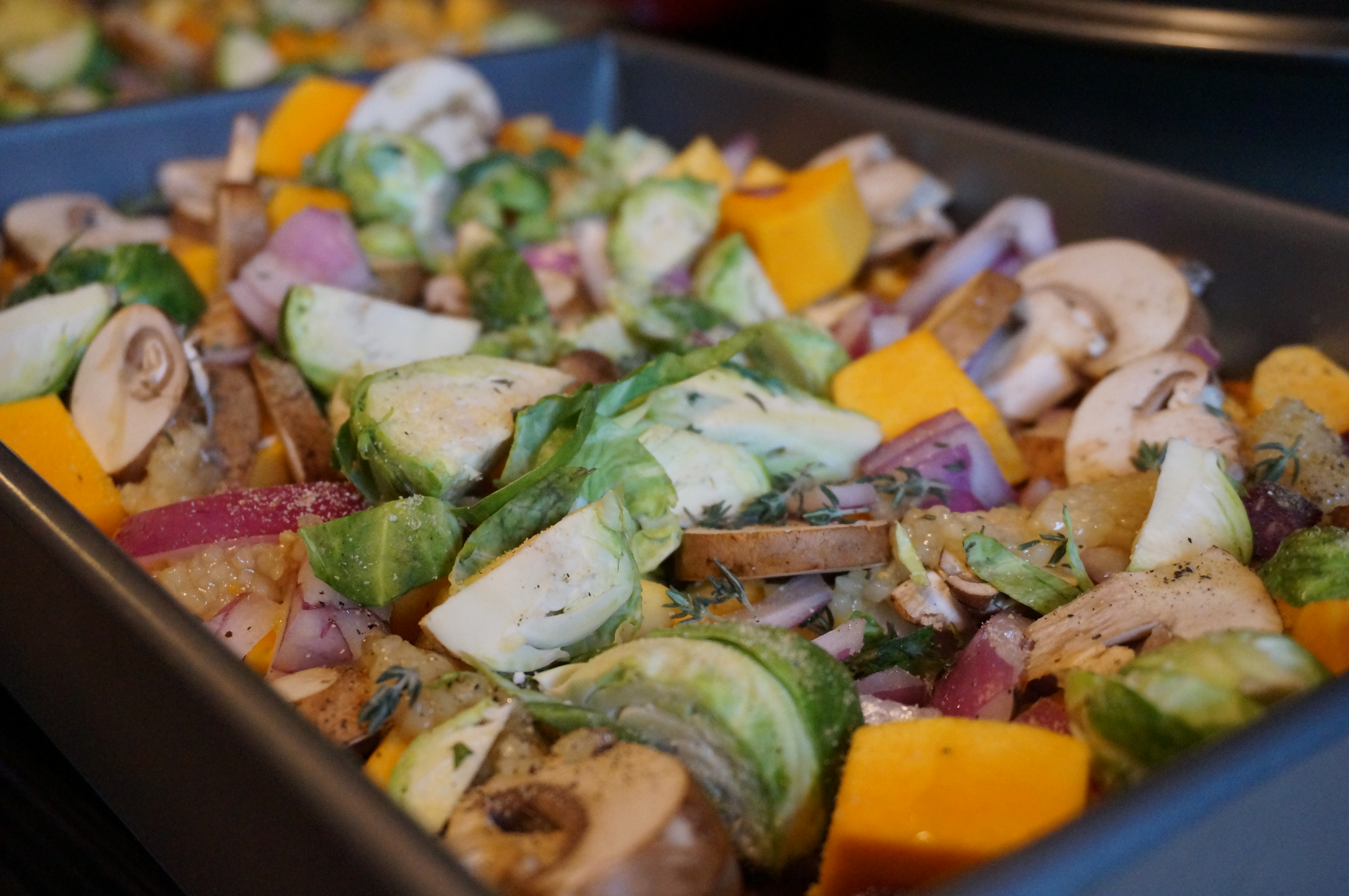 - Chop squash, carrots, brussels sprouts, mushrooms, and onion, and toss in a large baking pan with 1 tbsp olive oil, garlic, 3 sprigs thyme (stems removed), garlic powder, salt and pepper.