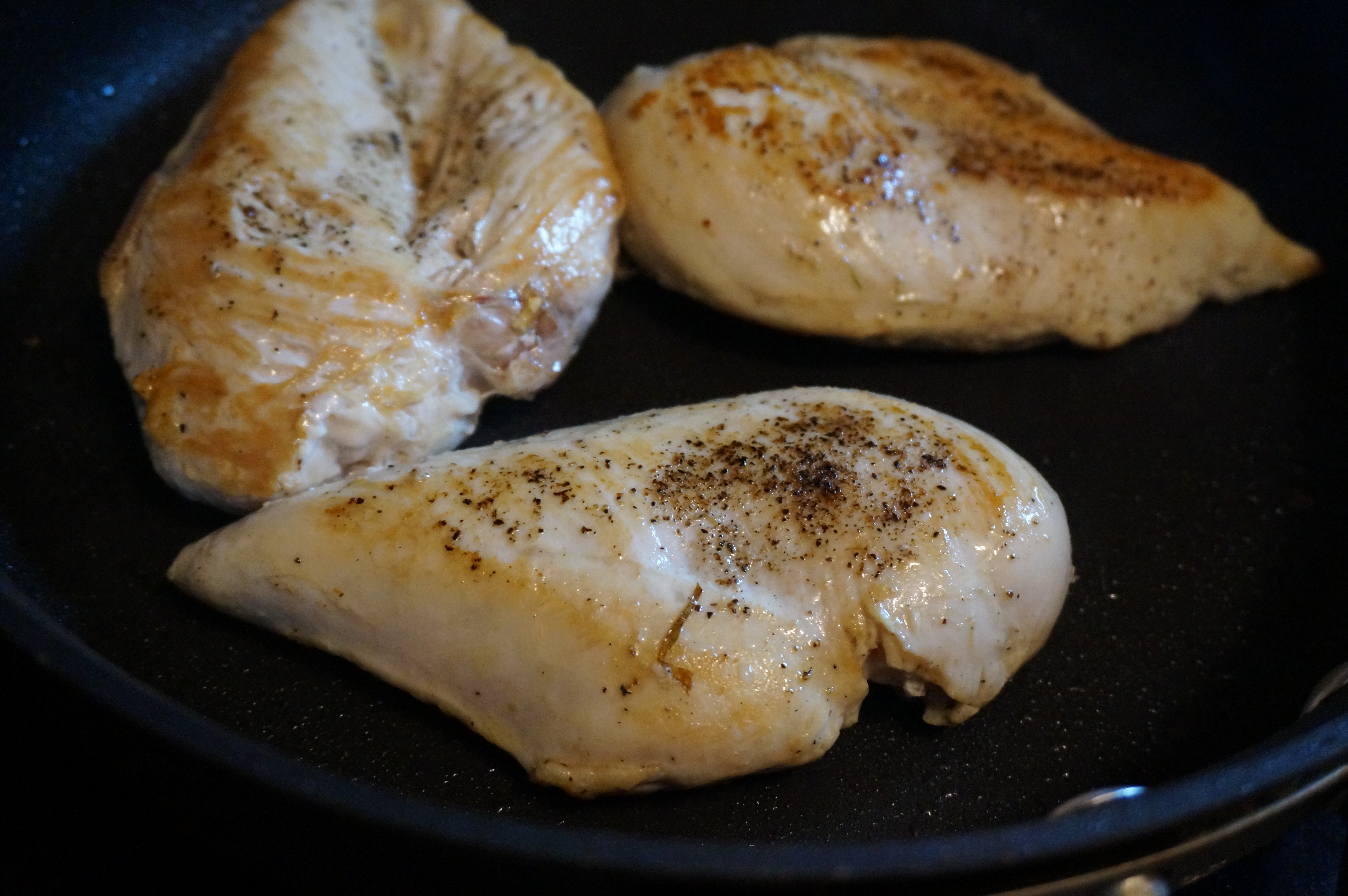 - Meanwhile, heat remaining 1 tbsp olive oil in a skillet on medium high. Add chicken breasts and sprinkle with salt and pepper. Sear until just browned, about 2 min per side. Set aside.