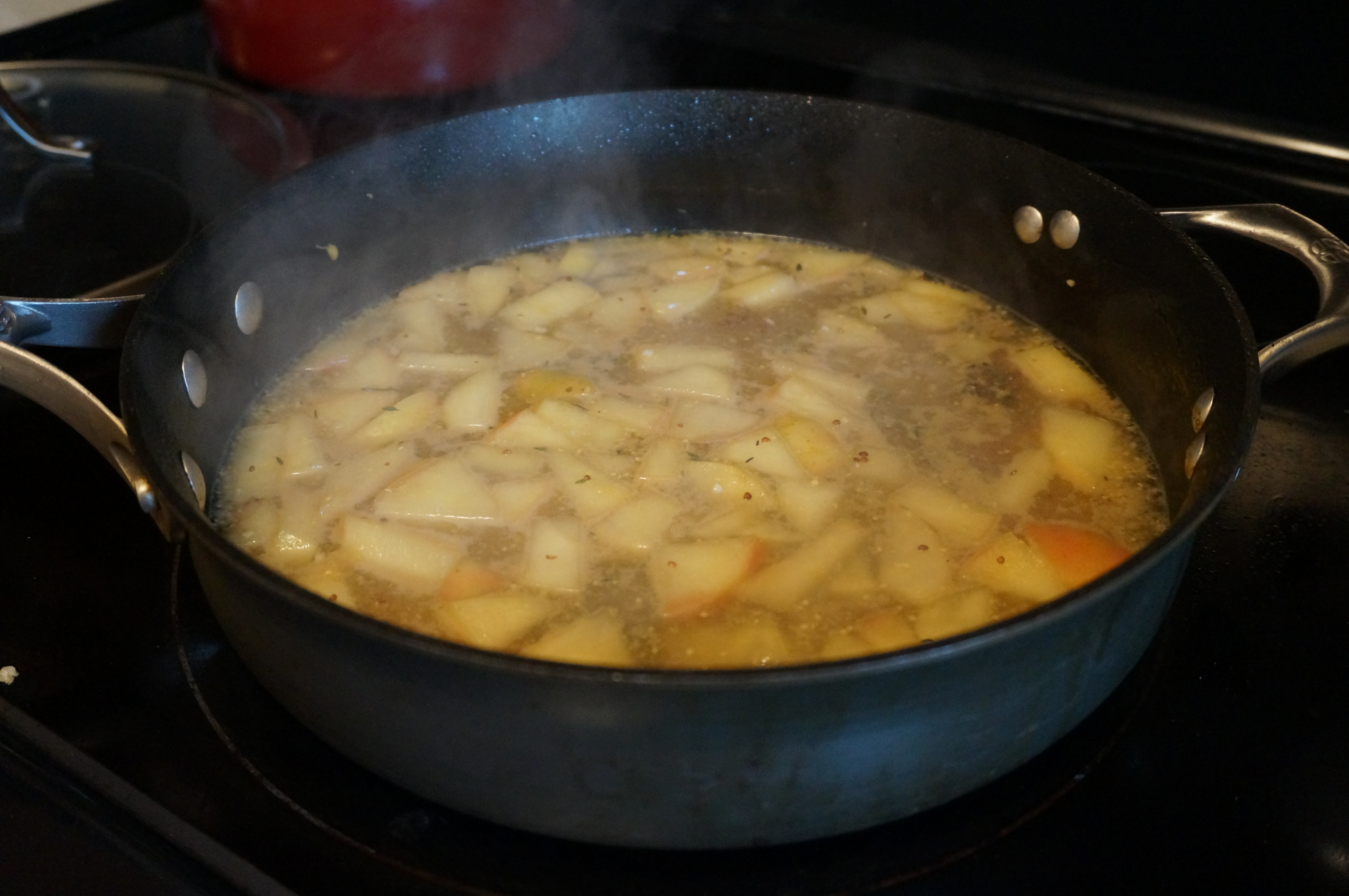 - Add 2 cups chicken broth, 1 cup apple cider, dijon mustard, chopped apple, remaining thyme, and extra salt and pepper. Bring to a boil