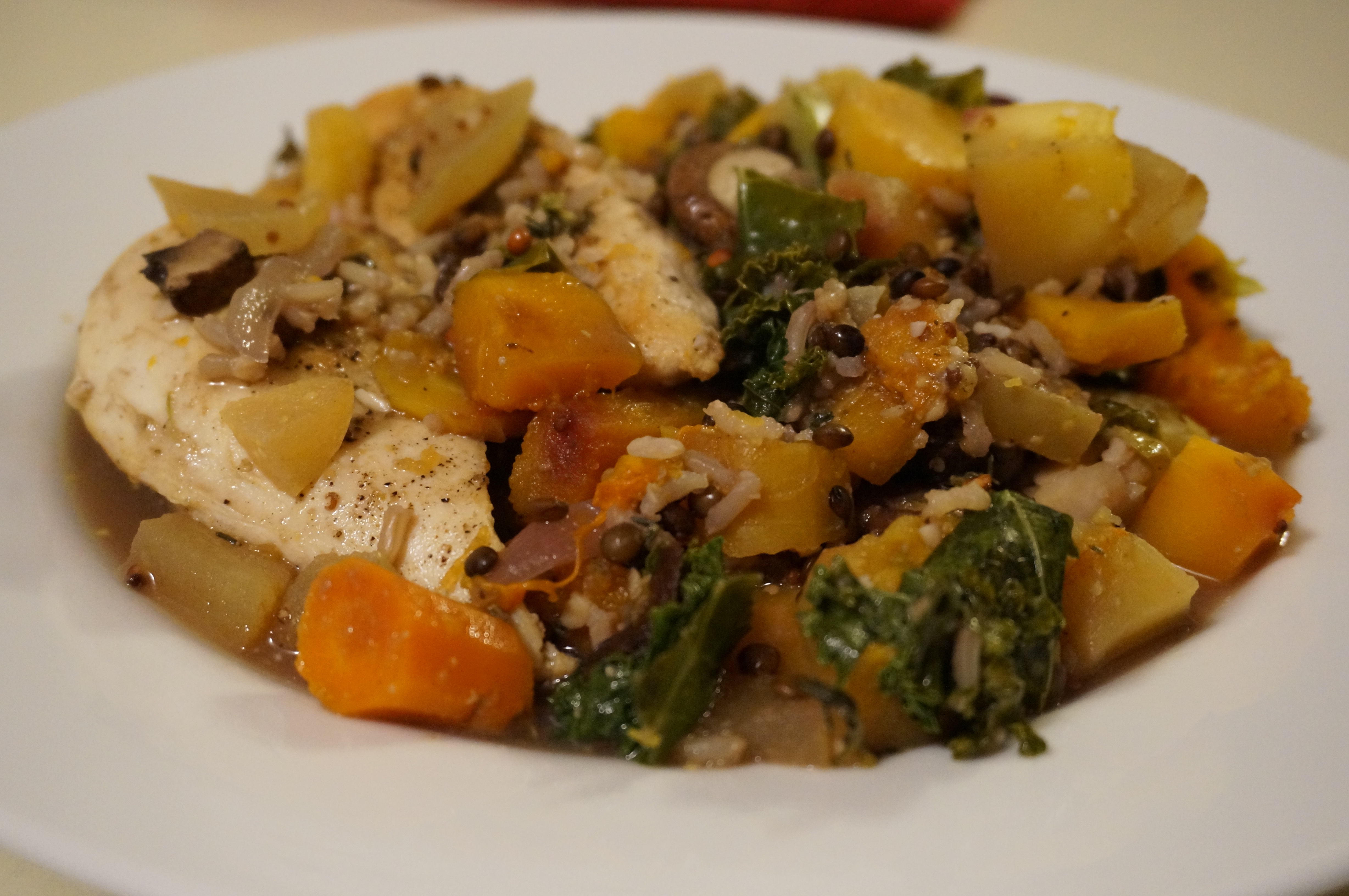 - In a large casserole dish sprayed with cooking spray, spread an even layer of rice and lentils. Cover with kale and pour remaining chicken broth over top. Add roasted vegetables and wedge in the chicken breasts.