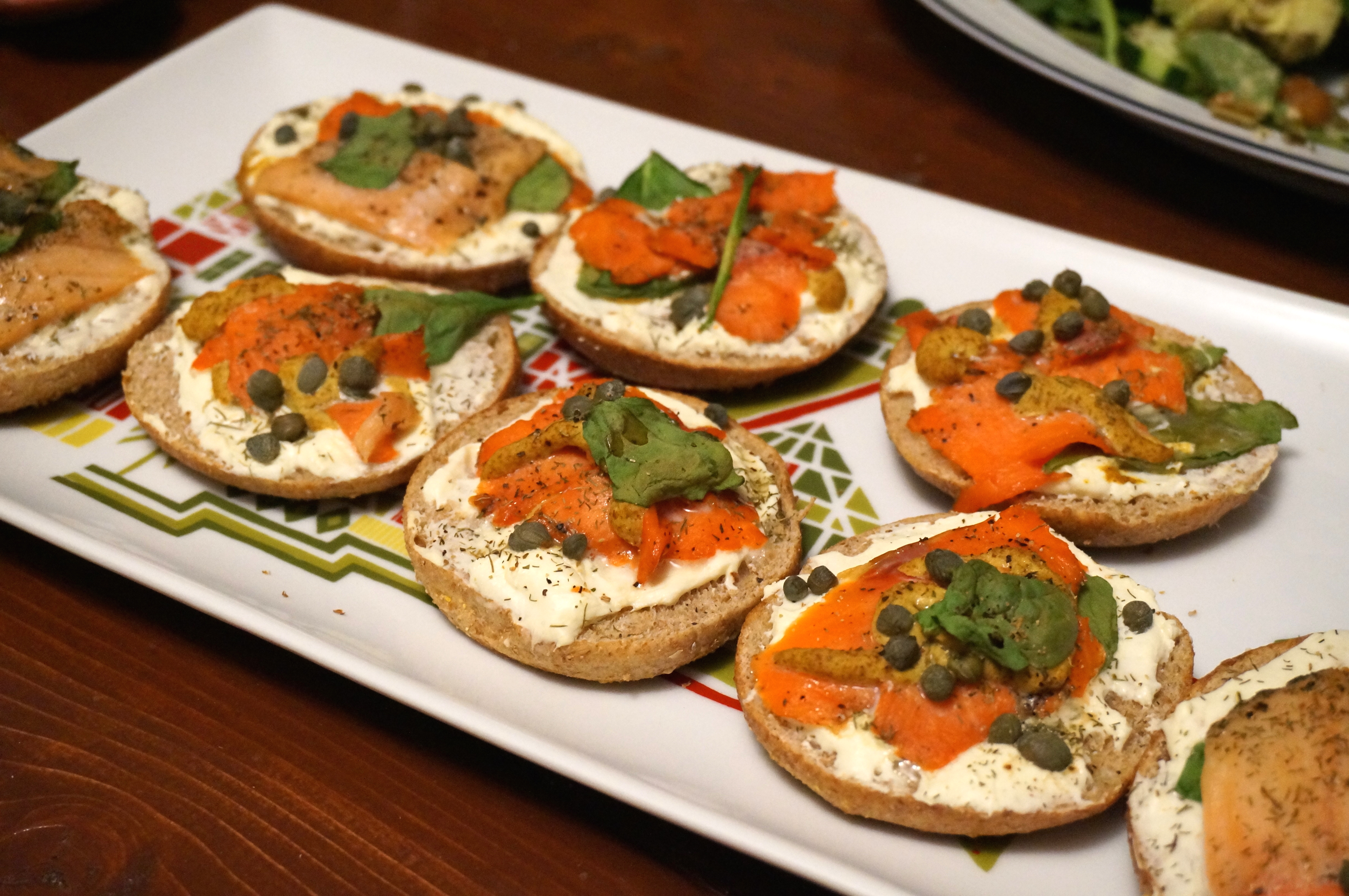 I literally thought of this recipe on my way home from work. Sitting in traffic on I-440 from Raleigh to Durham at 6:00pm is miserable. Even with Christmas tunes blasting on the radio. I am always starving, have about two billion things running through my head of what I have to get done when I get home, and there is literally NOTHING I can do but wait! It’s probably good for me. But it’s still torture. Last night as I was fighting the traffic past the Glenwood Ave exit (mall shoppers apparently ALL choose the same way to get to Crabtree Valley Mall) I was brainstorming the quickest appetizer I could whip up for our Bible study Christmas potluck. I wanted it to be something easy but still somewhat “fancy,” and I knew we wouldn’t have a lot of meat in the spread, so I decided on these! All they are is mini whole wheat bagels, with some Greek yogurt cream cheese spread, topped with some dried dill, capers, a dollop of spicy brown mustard, and a few strips of smoked salmon! I don’t typically buy smoked salmon, but I think I’m going to more often now. What an easy and tasty way to add some protein to a salad or sandwich without having to actually cook anything! I love the smoky flavor and spices they add to the package as well. I’m told that it’s pricey… but honestly, last night I was in too much of a rush to even look!