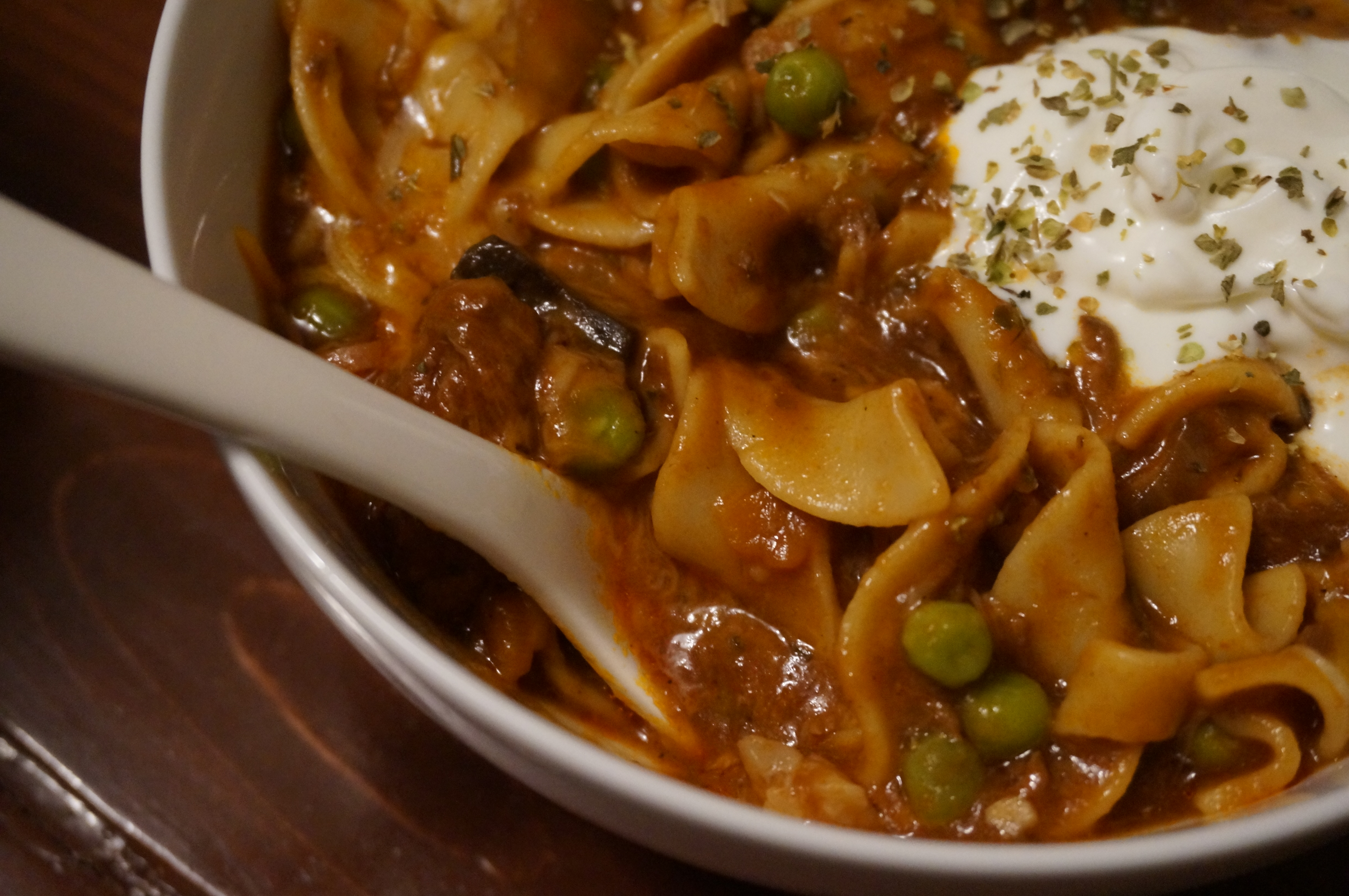 But what does one serve college guys who could gorge themselves on chips, dip, cookies, pizza, and the candy dish all day long? Beef Stroganoff Stew! Originally I was going to make Ropa Vieja Enchiladas, which are one of Ben’s favorites, but I just didn’t have it in me to shred any meat or turn the oven on after we got home late this afternoon from the NSCU vs. Pitt game (sad day for Pitt basketball. oh well.). Plus, I’d forgotten to get the enchilada sauce. Instead, I settled on a beef stew with a “citrus flair,” as traditional Ropa Vieja has a dash of orange or lime juice to brighten it up! I served this over cooked egg noodles, but you could also ladle it over another type of pasta or white rice. Just make sure to serve it with plenty of shredded cheese and sour cream!