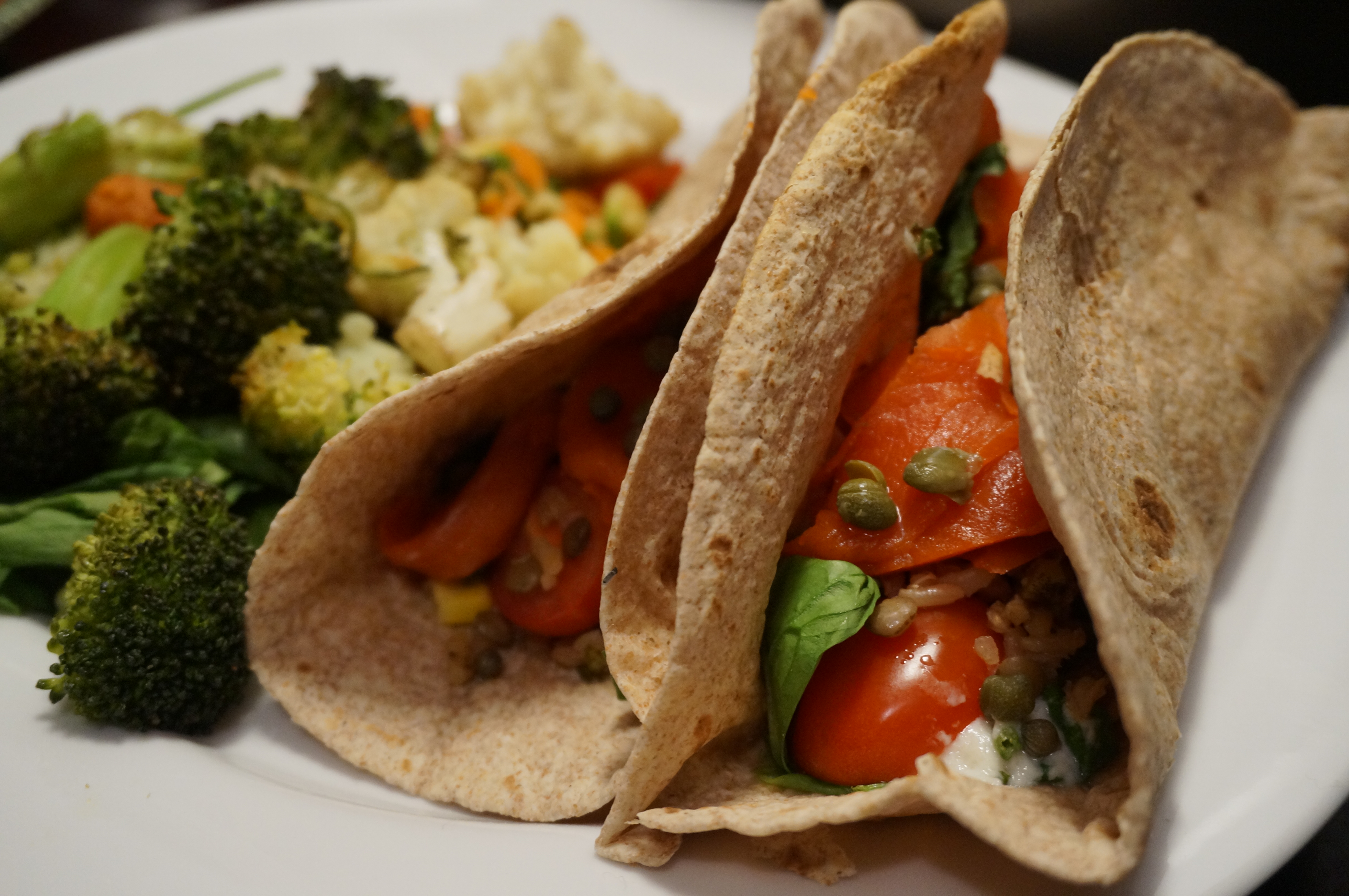 - *You can also make salmon tacos! Simply combine about 1/4 cup yogurt or sour cream with some ranch dressing seasoning and stir, stir, stir. Spread it on the bottom of a tortilla and top with salad from above (making sure not too much dressing is on it to avoid making them too soggy). Bake at 350 for 6-7 min or until tortillas are just “set.” Top tortillas with rice, salmon, capers/dill, and feta.