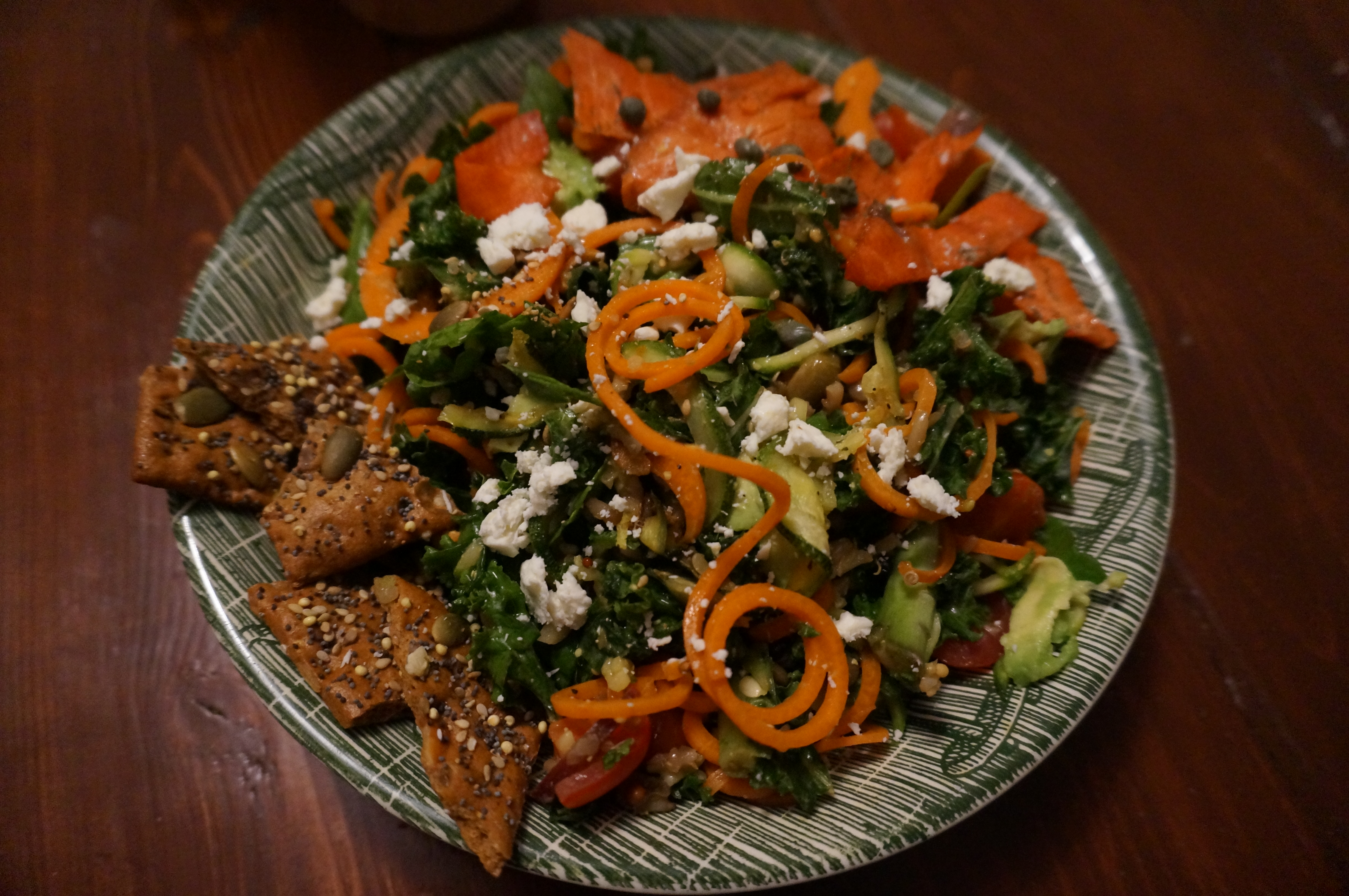 I whipped up a quick Dijon vinaigrette using the quick and dirty technique outlined in the book I’m currently reading, Bread and Wine (which by the way is amazing- I highly recommend!), and massaged a few kale greens with the freshly-spiralized veggie noodles. [side-note: why does spellcheck not yet know the word “spiralize”!?] Top it with some smoked salmon and savory capers and feta, and by golly, we have a delicious, power-packed salad fit for both you AND your salmon-craving, 150-pushups-a-day-performing man! (I actually turned these into tacos for him… he’s not as keen on the kale and zucchini mix, but don’t worry- I still snuck a few in there :P).