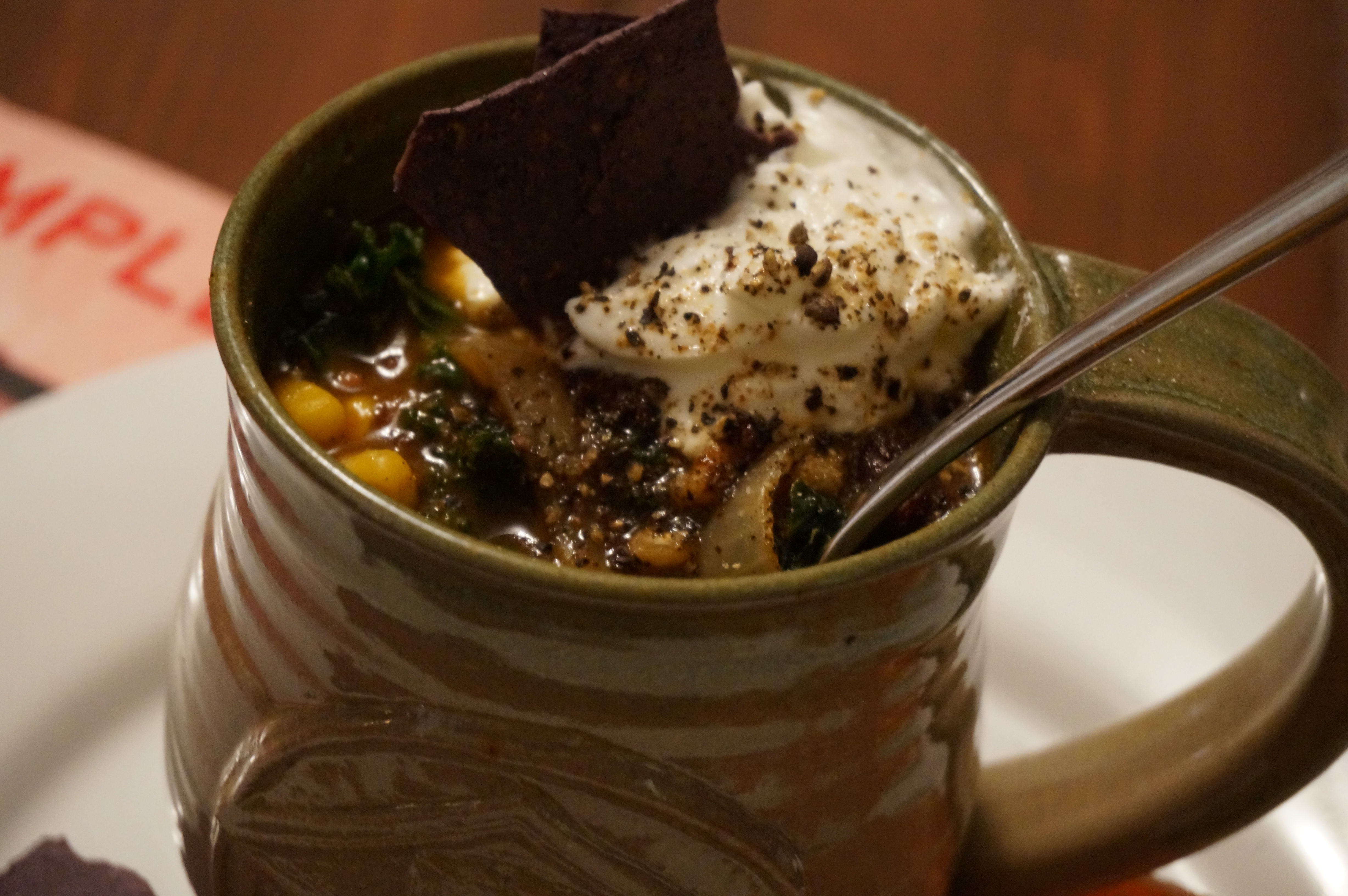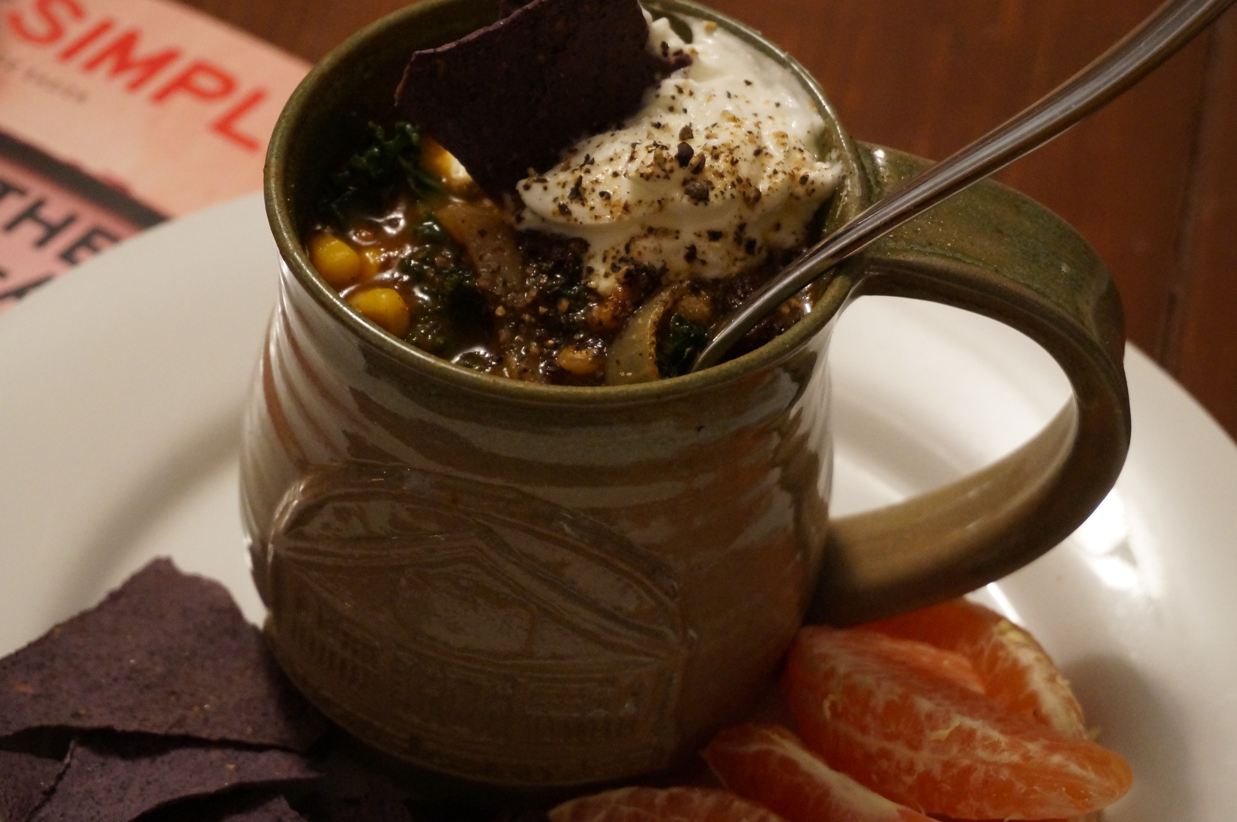 - Serve with greek yogurt and pepper on top, with some hearty blue corn tortilla chips on the side!