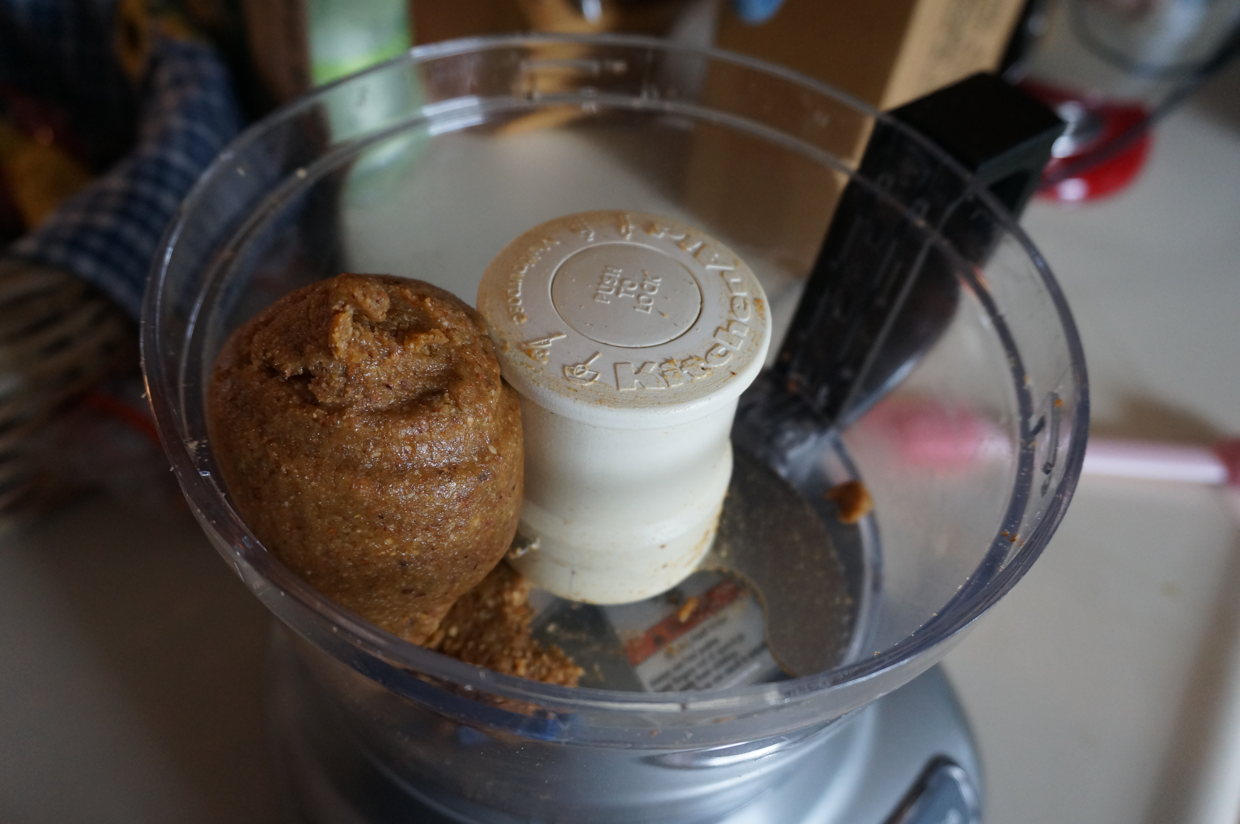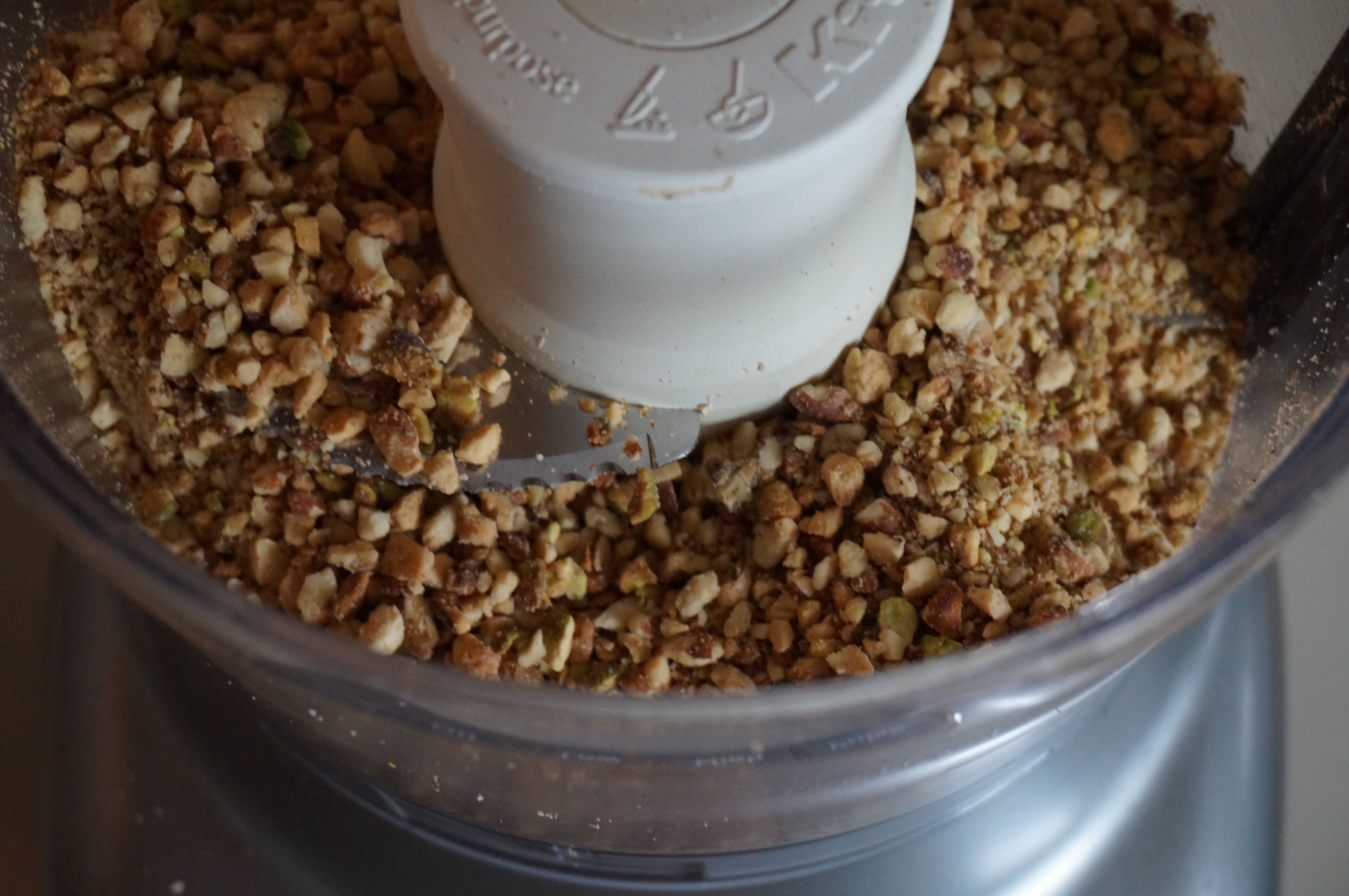 - Pour nuts into a food processor with blade attachment. Process on low for 2 minutes until the nuts form a gritty mixture.