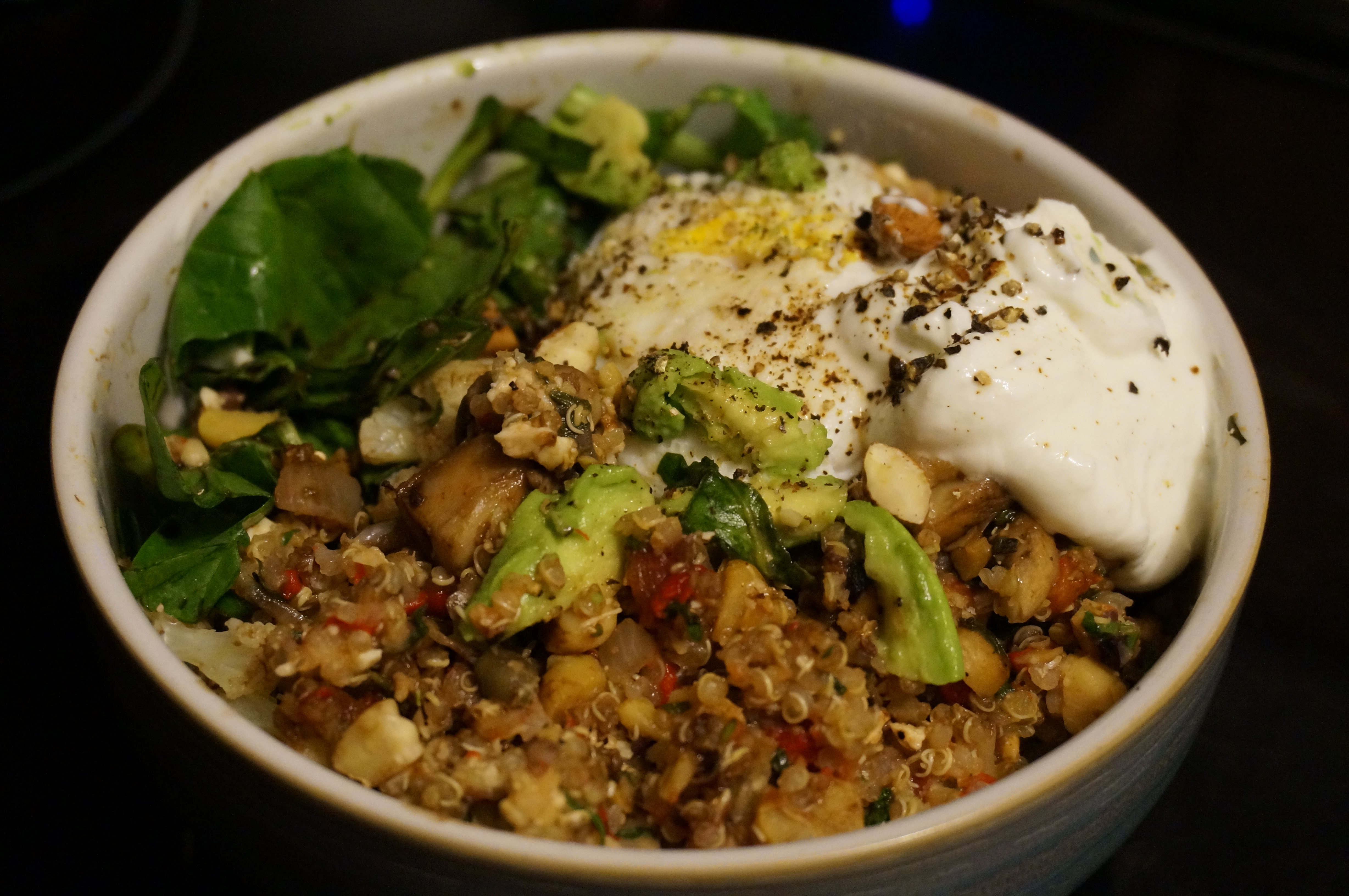 Anyway, tonight I had a craving for something light and springy tonight (and also something that would make a lot of leftovers). Some of you may remember my recipe for my Stuffed Mediterranean Portobellos from last year, and while I didn’t quite have the energy to clean and stuff all of those mushrooms, I was happy to whip up the quick and easy filling! I served it on top of spinach with a drizzling of balsamic vinegar, poached egg, almonds, and avocado. Oh, and a dollop of Greek yogurt for good measure.