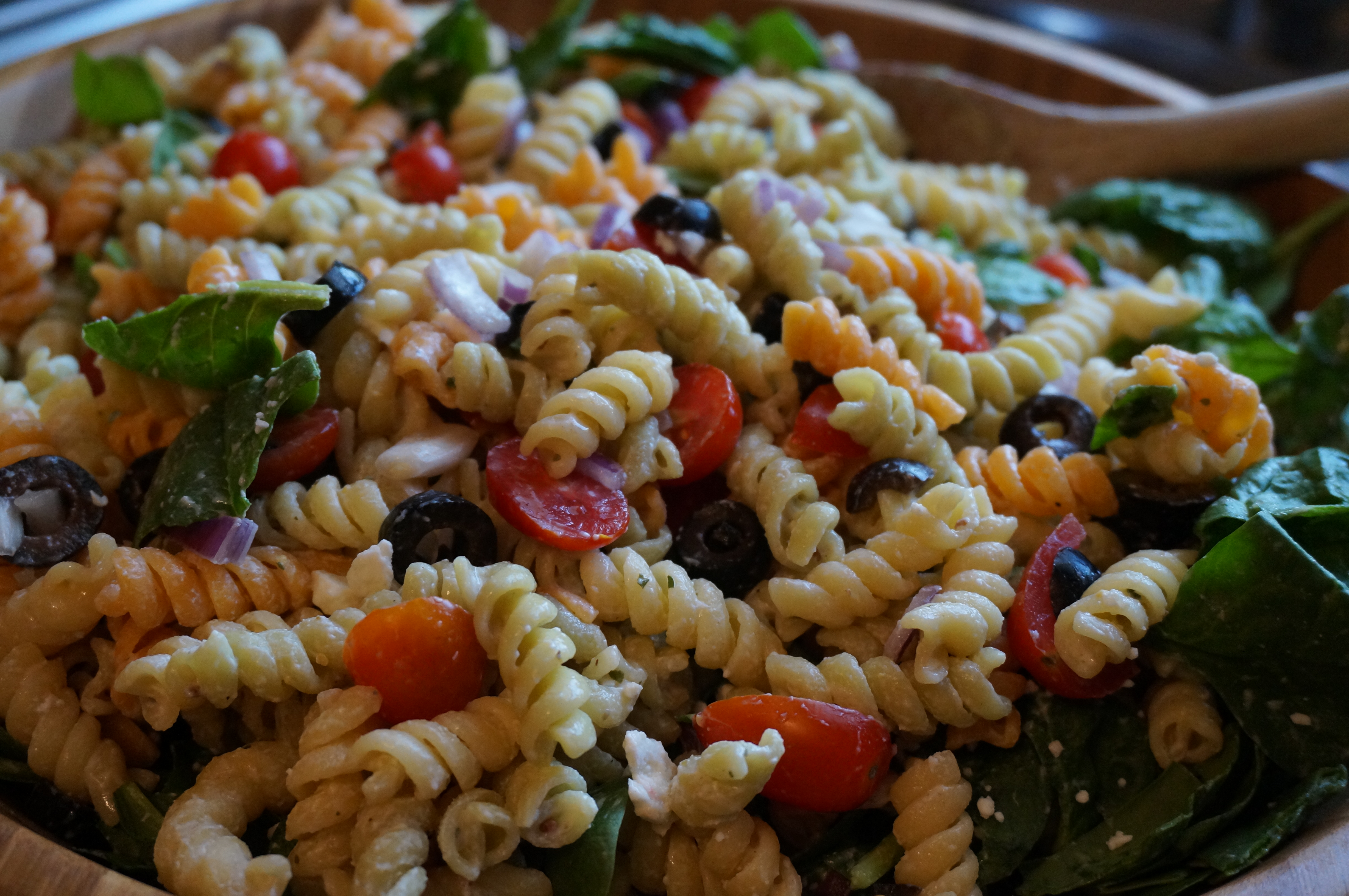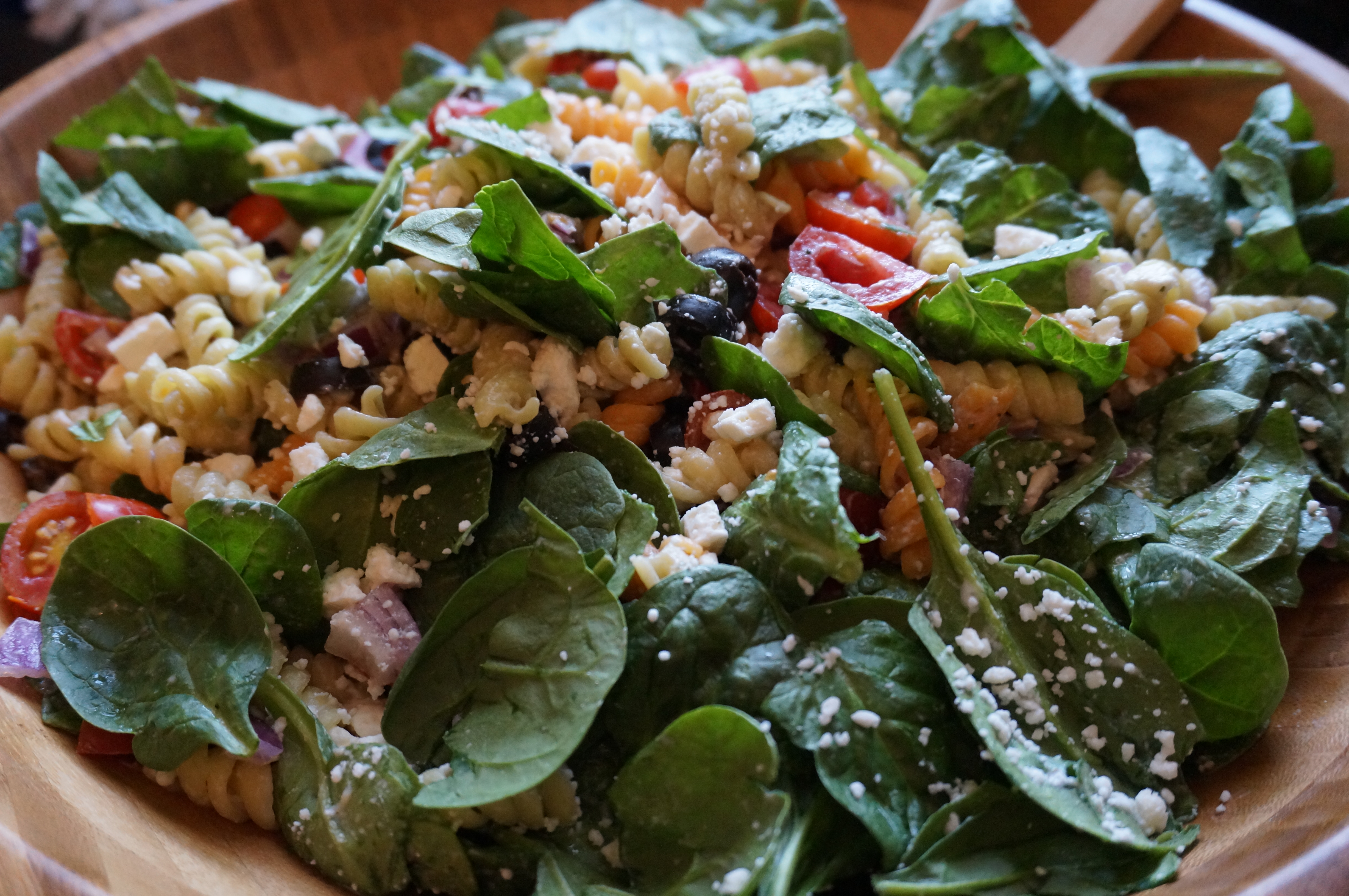 But this time of year isn’t all bad. With May comes graduations (yay, Duke DPT Class of 2015!) and getting letters after your name (I just passed my boards exam and am officially “Claire McCormick, PT”!) as well as family vacations, get-togethers with freinds, and COOK-OUTS! Tonight Ben and I are going to our first cookout of the season, hosted by a couple in our small group. When trying to decide what to bring along, I thought it might be a good way to kick off the cook-out season with a summery pasta salad. I used tri-color rotini and a dressing using Greek yogurt in place of mayo, combined with a generous sprinkling of Ranch dressing seasoning mix. Tossed in some chopped red onion, tomatoes, and olives, and served it over spinach greens with some feta cheese on top. Hopefully it will be a hit!
